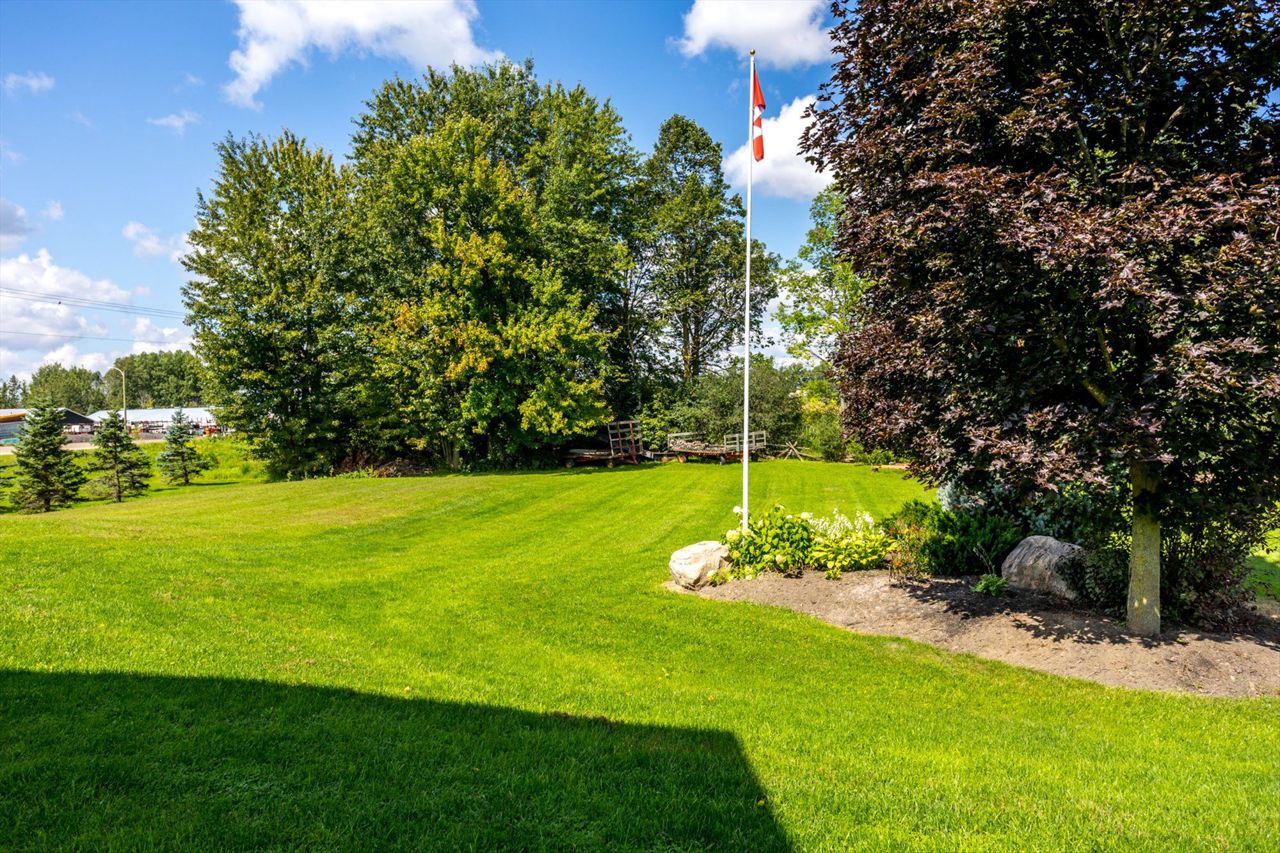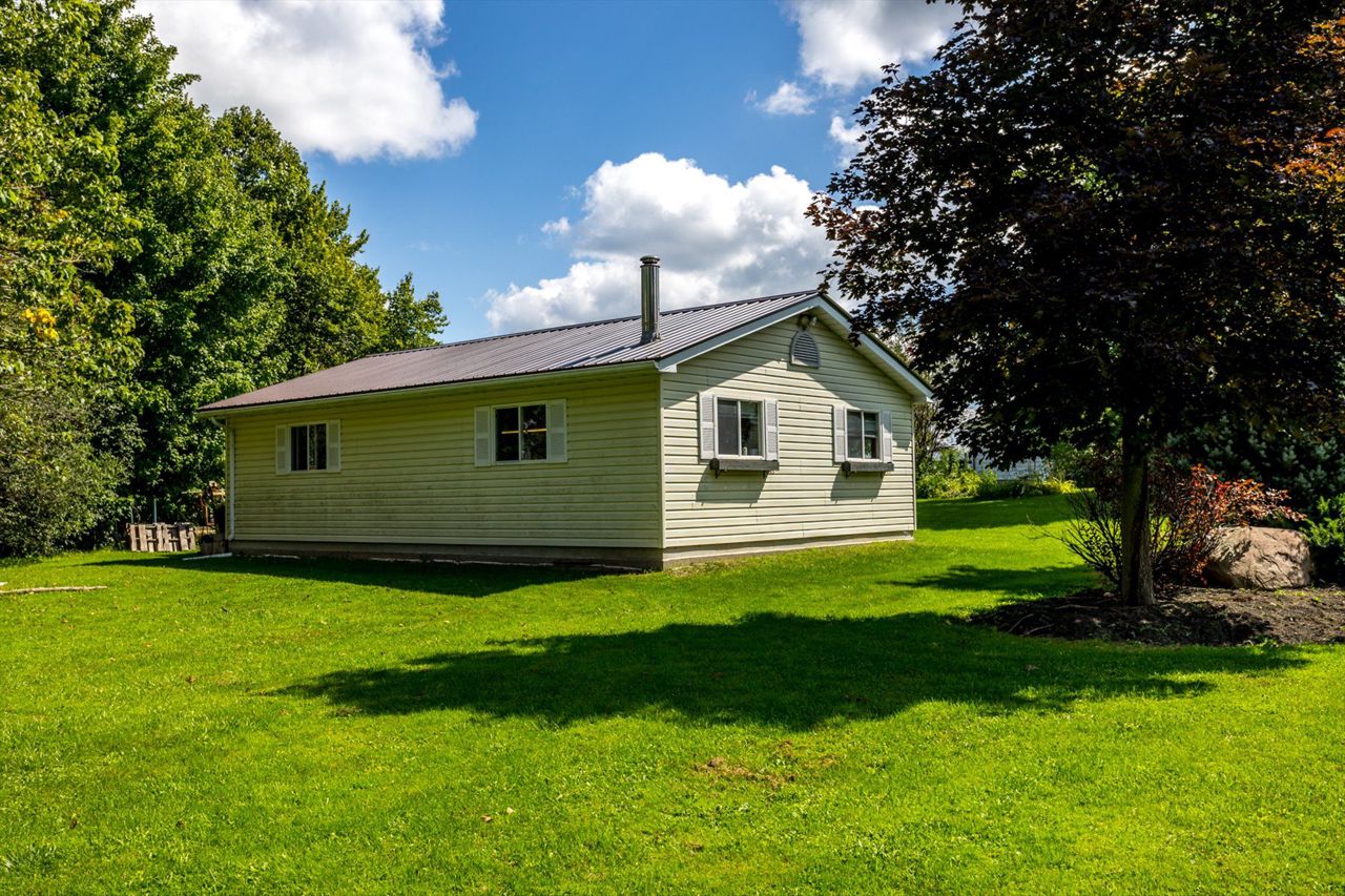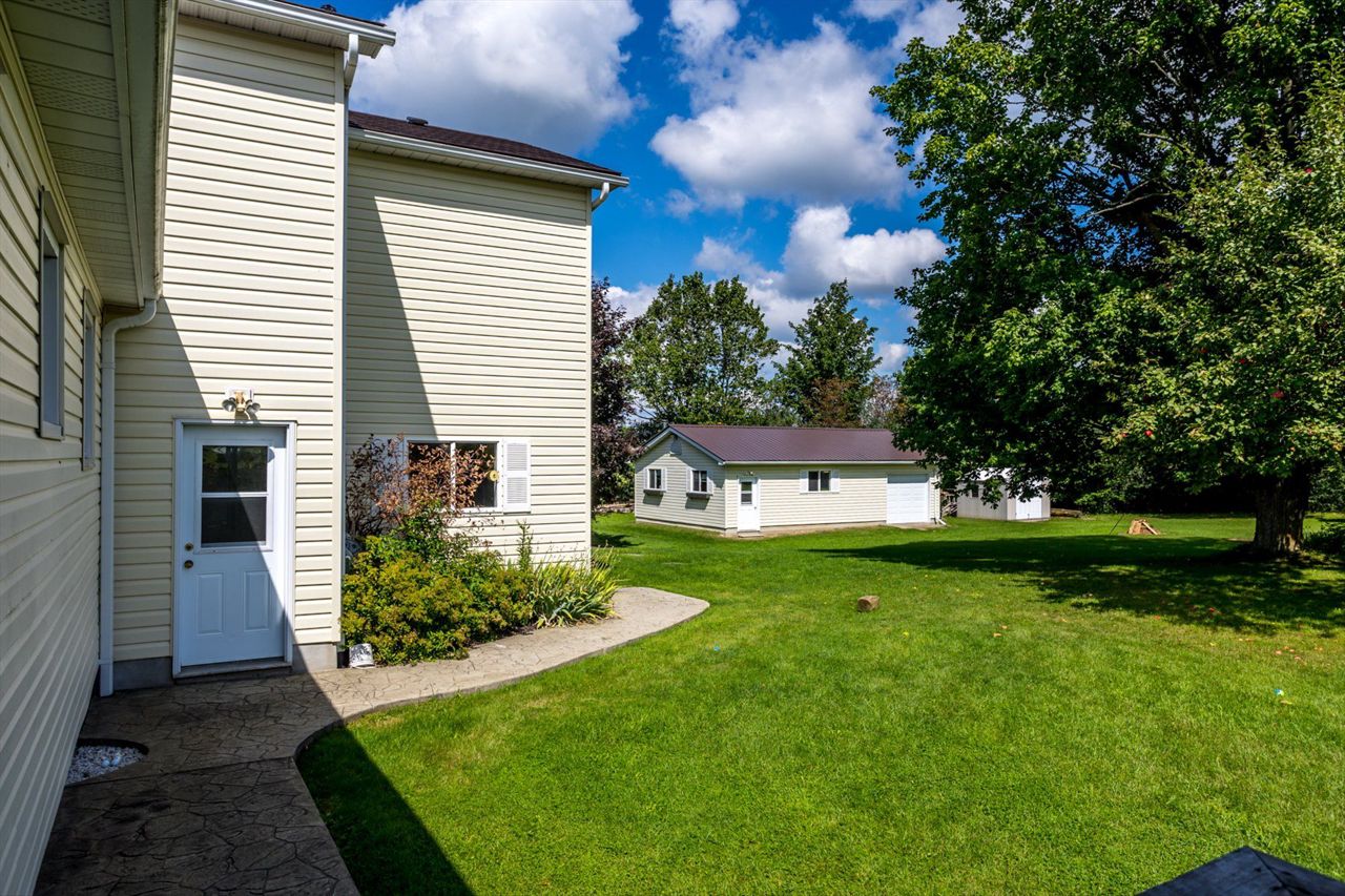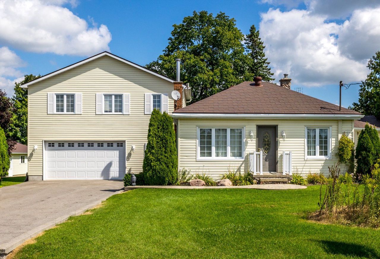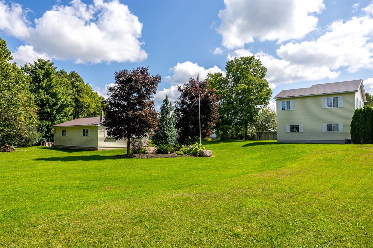 Escape the ordinary and embrace country living in this well appointed bungaloft nestled on over an acre, surrounded by farm fields. With direct highway exposure, this property offers both serenity and convenience for the commuter who can park in the heated oversized double garage. As you step inside, a beautiful foyer guides you to an immense primary suite that redefines luxury. Pamper yourself in the private ensuite featuring an air tub, glass shower and 2 walk-in closets, storage should never be a concern. The updated kitchen boasts ample cupboards and counter space, catering to the needs of any culinary enthusiast. The large, open concept kitchen and dining area also features a cozy wood stove to curl up by. The living room is thoughtfully designed with a built-in bookshelf, combining functionality and style. A sunroom beckons, offering a seamless connection to the outdoors and leading to a deck where you can savor the views of your landscaped lot, complete with stamped walkway.A fully finished detached workshop stands ready to be you. Updated windows, roof, furnace, central air, baths, kitchen, doors, wiring, plumbing, flooring the list goes on and on.