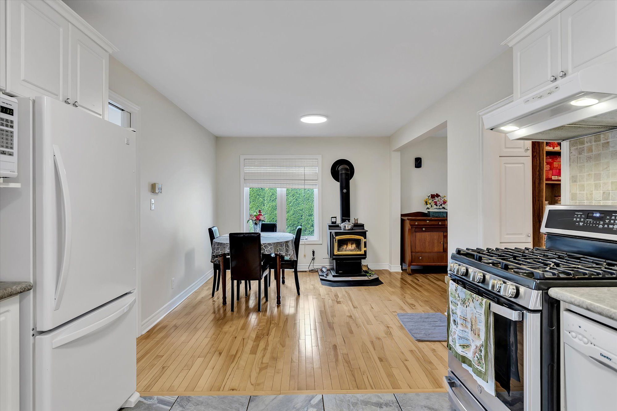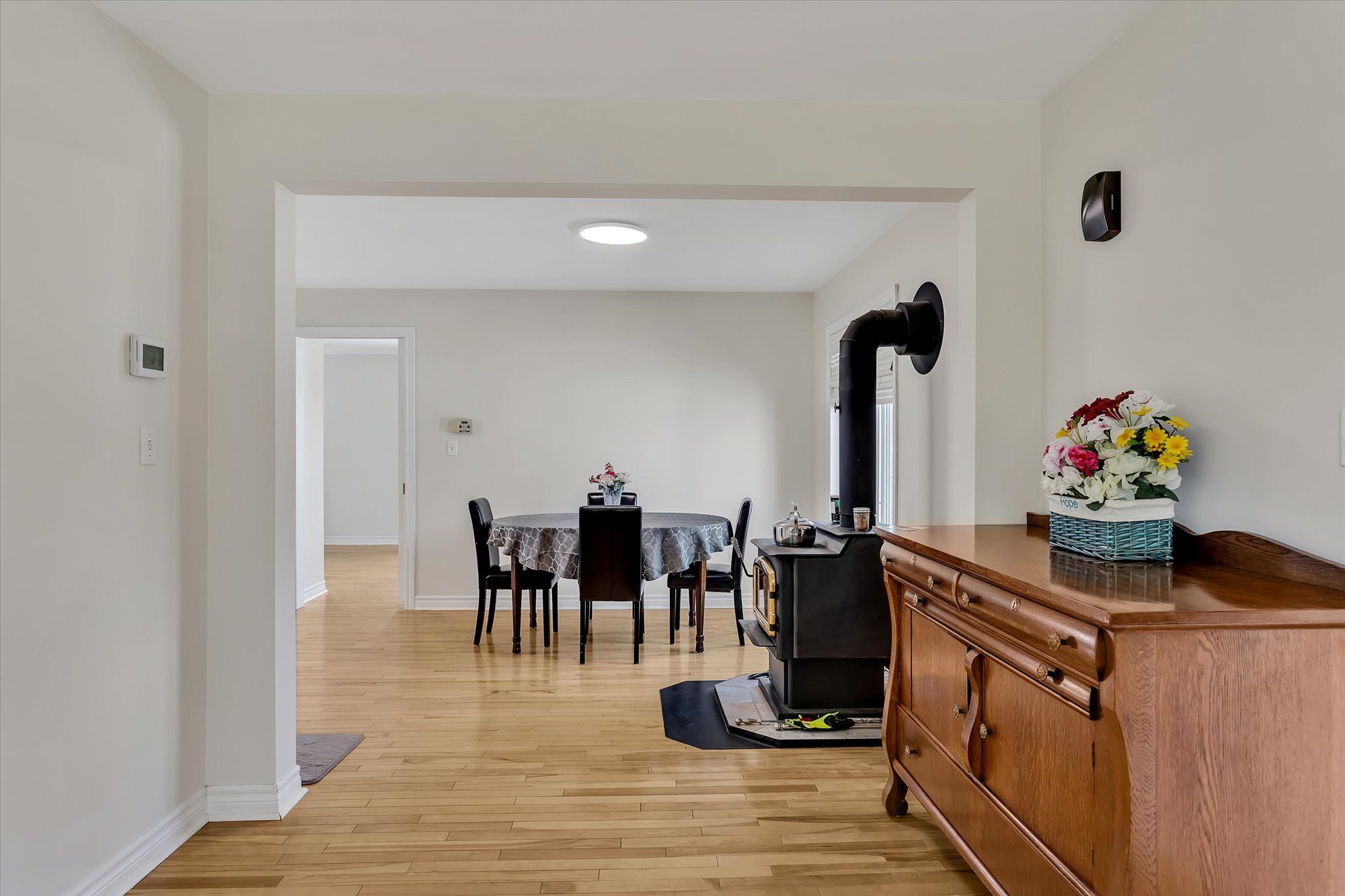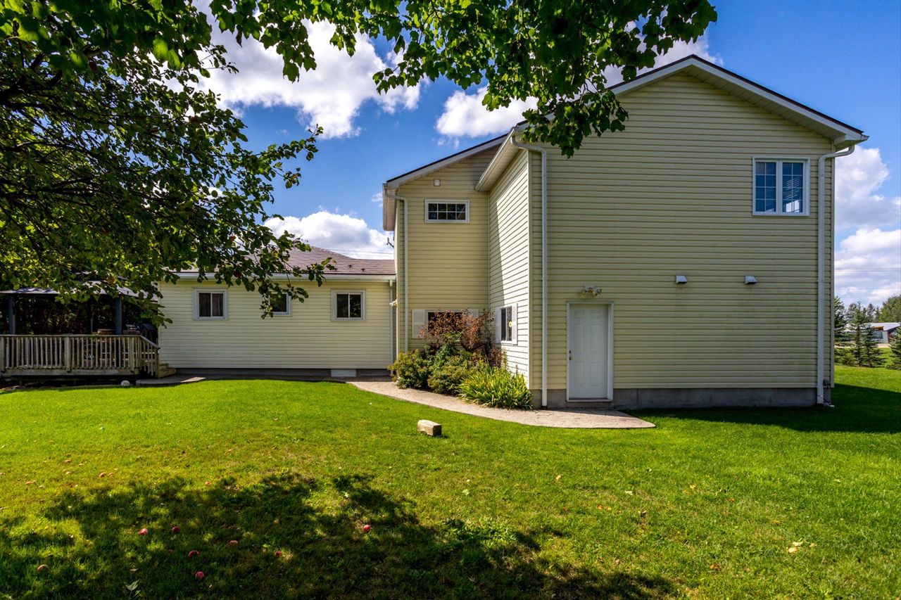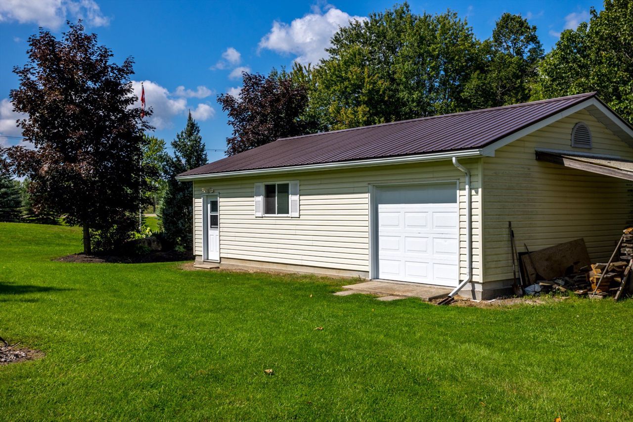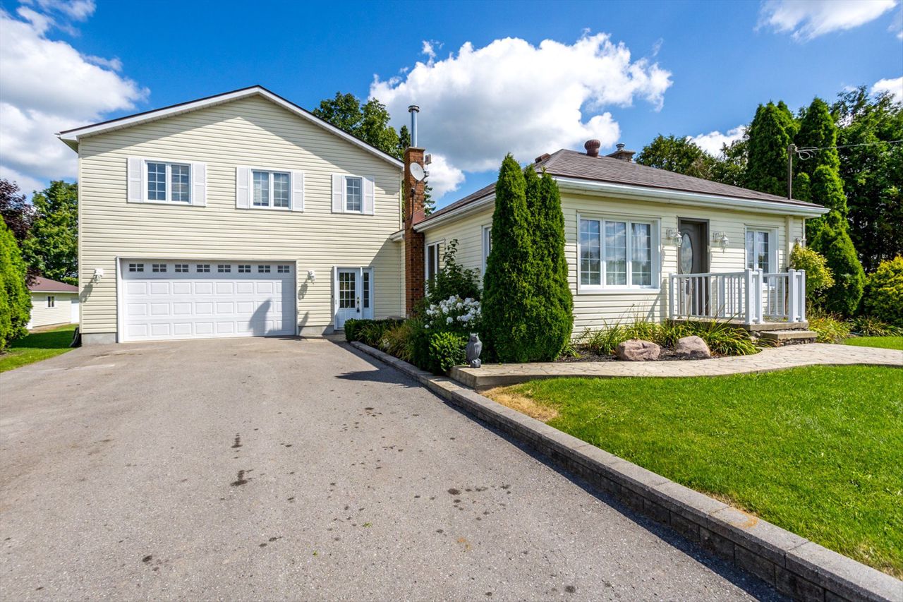 Escape the ordinary and embrace country living in this well appointed bungaloft nestled on over an acre, surrounded by farm fields. With direct highway exposure, this property offers both serenity and convenience for the commuter who can park in the heated oversized double garage. As you step inside, a beautiful foyer guides you to an immense primary suite that redefines luxury. Pamper yourself in the private ensuite featuring an air tub, glass shower and 2 walk-in closets, storage should never be a concern. The updated kitchen boasts ample cupboards and counter space, catering to the needs of any culinary enthusiast. The large, open concept kitchen and dining area also features a cozy wood stove to curl up by. The living room is thoughtfully designed with a built-in bookshelf, combining functionality and style. A sunroom beckons, offering a seamless connection to the outdoors and leading to a deck where you can savor the views of your landscaped lot, complete with stamped walkway.A fully finished detached workshop stands ready to be you. Updated windows, roof, furnace, central air, baths, kitchen, doors, wiring, plumbing, flooring the list goes on and on.