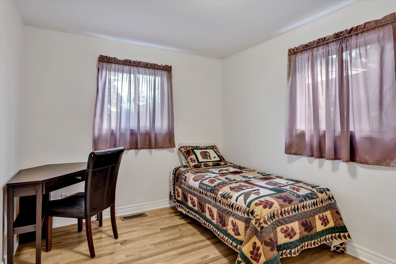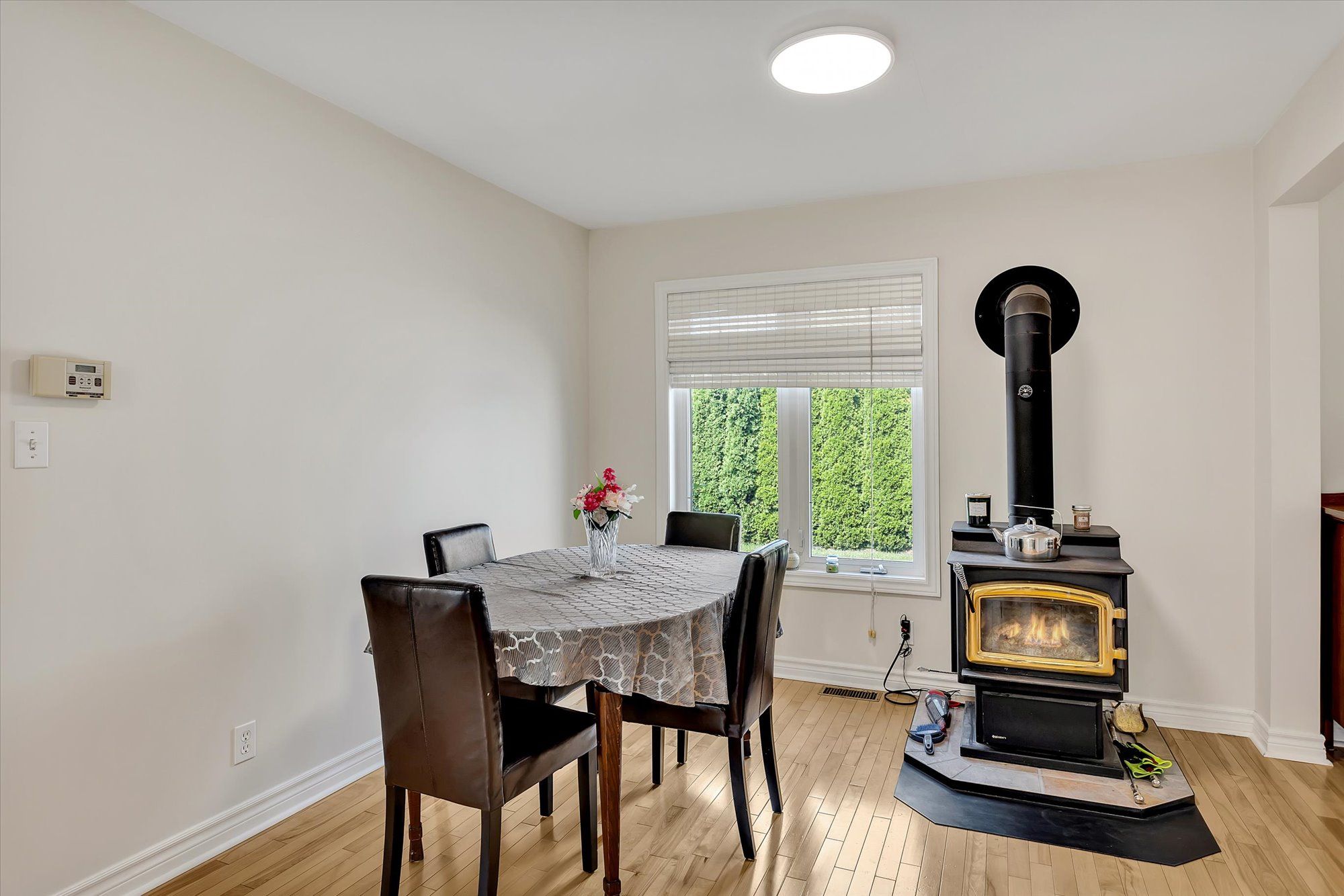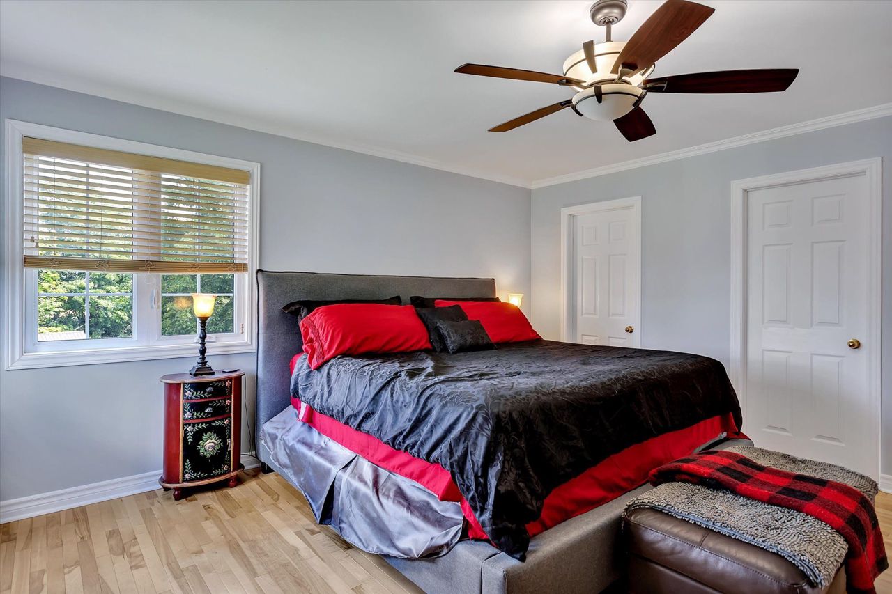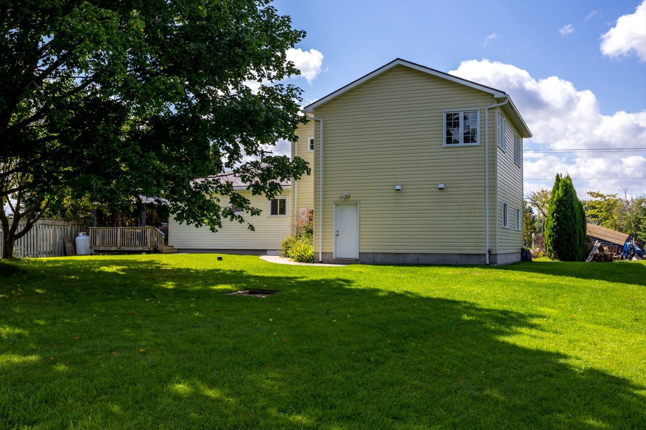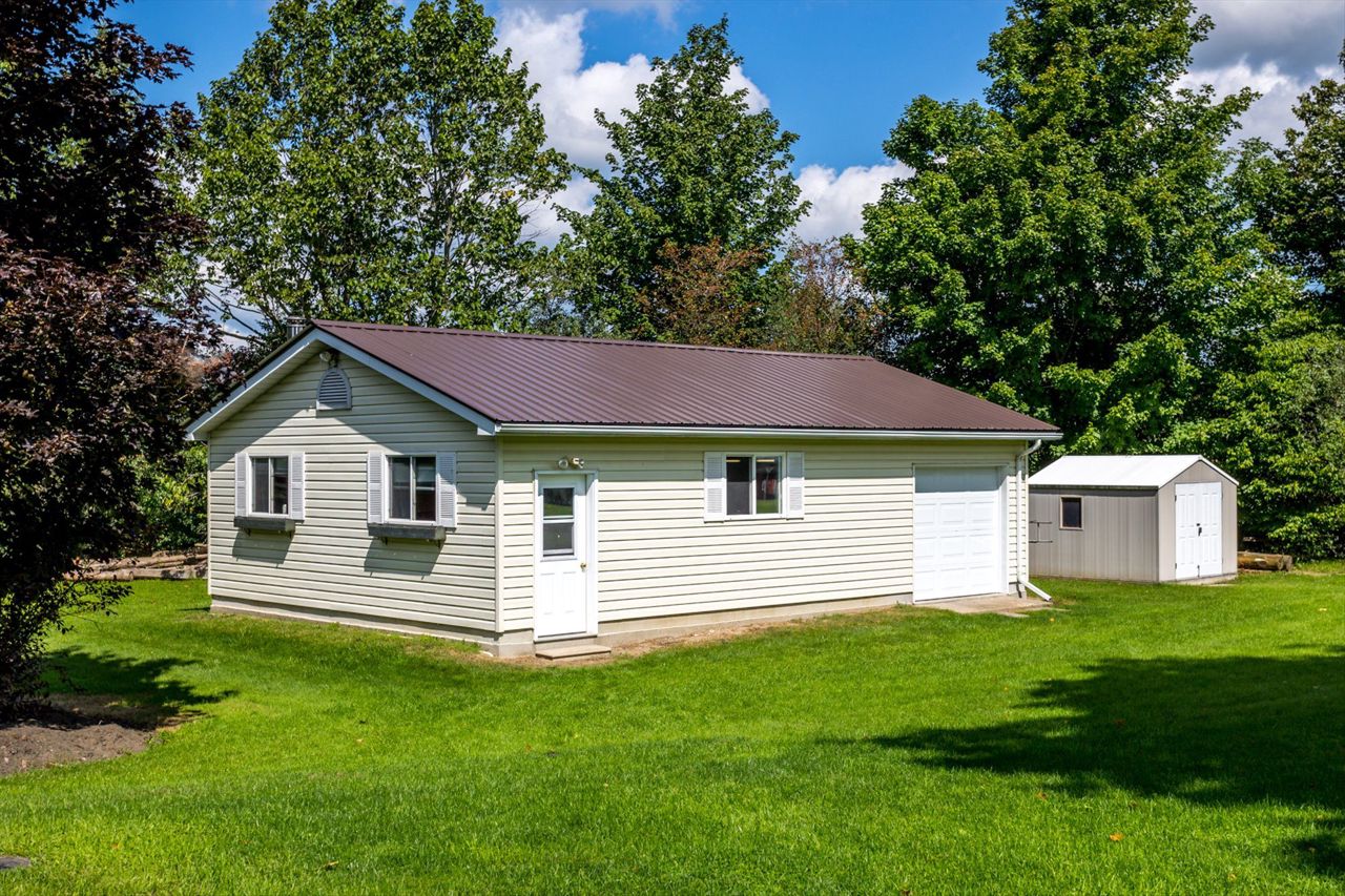 Escape the ordinary and embrace country living in this well appointed bungaloft nestled on over an acre, surrounded by farm fields. With direct highway exposure, this property offers both serenity and convenience for the commuter who can park in the heated oversized double garage. As you step inside, a beautiful foyer guides you to an immense primary suite that redefines luxury. Pamper yourself in the private ensuite featuring an air tub, glass shower and 2 walk-in closets, storage should never be a concern. The updated kitchen boasts ample cupboards and counter space, catering to the needs of any culinary enthusiast. The large, open concept kitchen and dining area also features a cozy wood stove to curl up by. The living room is thoughtfully designed with a built-in bookshelf, combining functionality and style. A sunroom beckons, offering a seamless connection to the outdoors and leading to a deck where you can savor the views of your landscaped lot, complete with stamped walkway.A fully finished detached workshop stands ready to be you. Updated windows, roof, furnace, central air, baths, kitchen, doors, wiring, plumbing, flooring the list goes on and on.