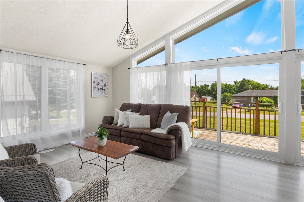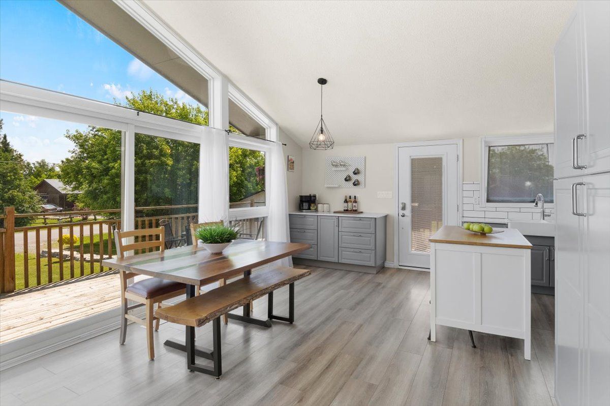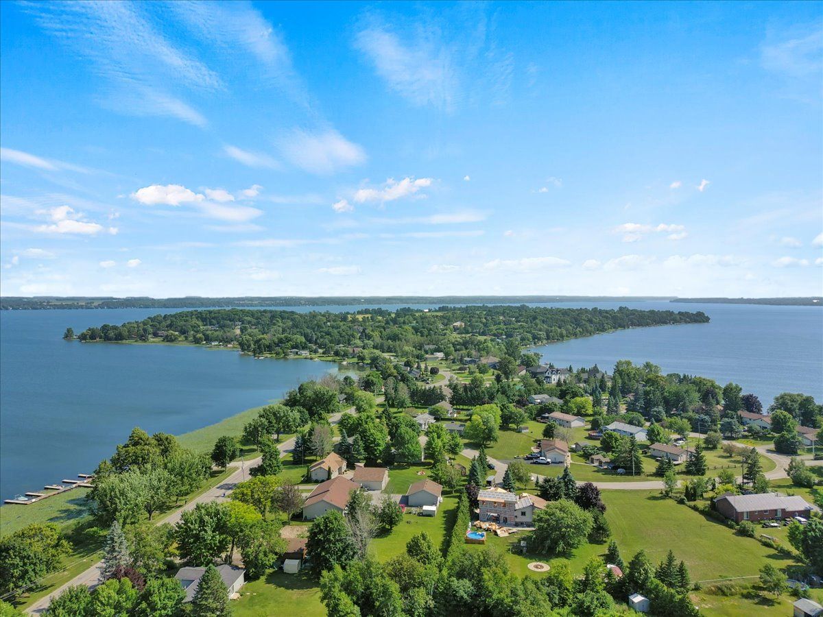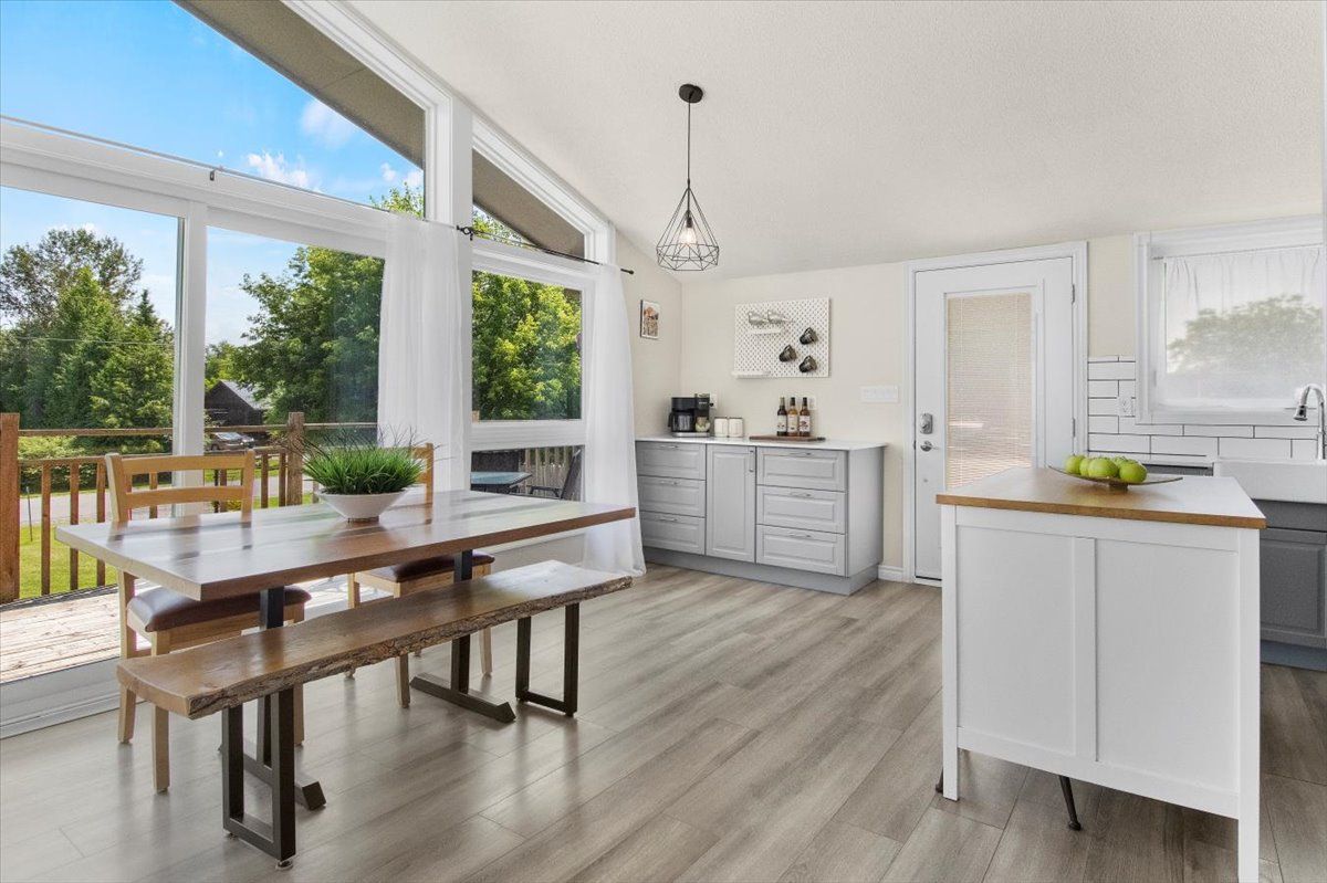 Your eyes will sparkle when you drive up and notice the massive garage, parking for a dozen cars and a 40 ft deck! Close to lake access and public boat launch this home is perfectly set on a 100 x 200 ft lot in the lakeside community of Washburn Island. Renovated centre island kitchen with subway tile backsplash, high cathedral ceilings and south facing windows. The fireplace will warm you on the winter eves after a snowmobile ride from your back yard. 2 baths, full basement with 2 family rooms, pellet stove and fireplace, laundry and the cutest sunroom/ potting shed or work at home space overlooking the yard.This home is perfect for the outdoors person or someone wanting a home that comes with a lake view.