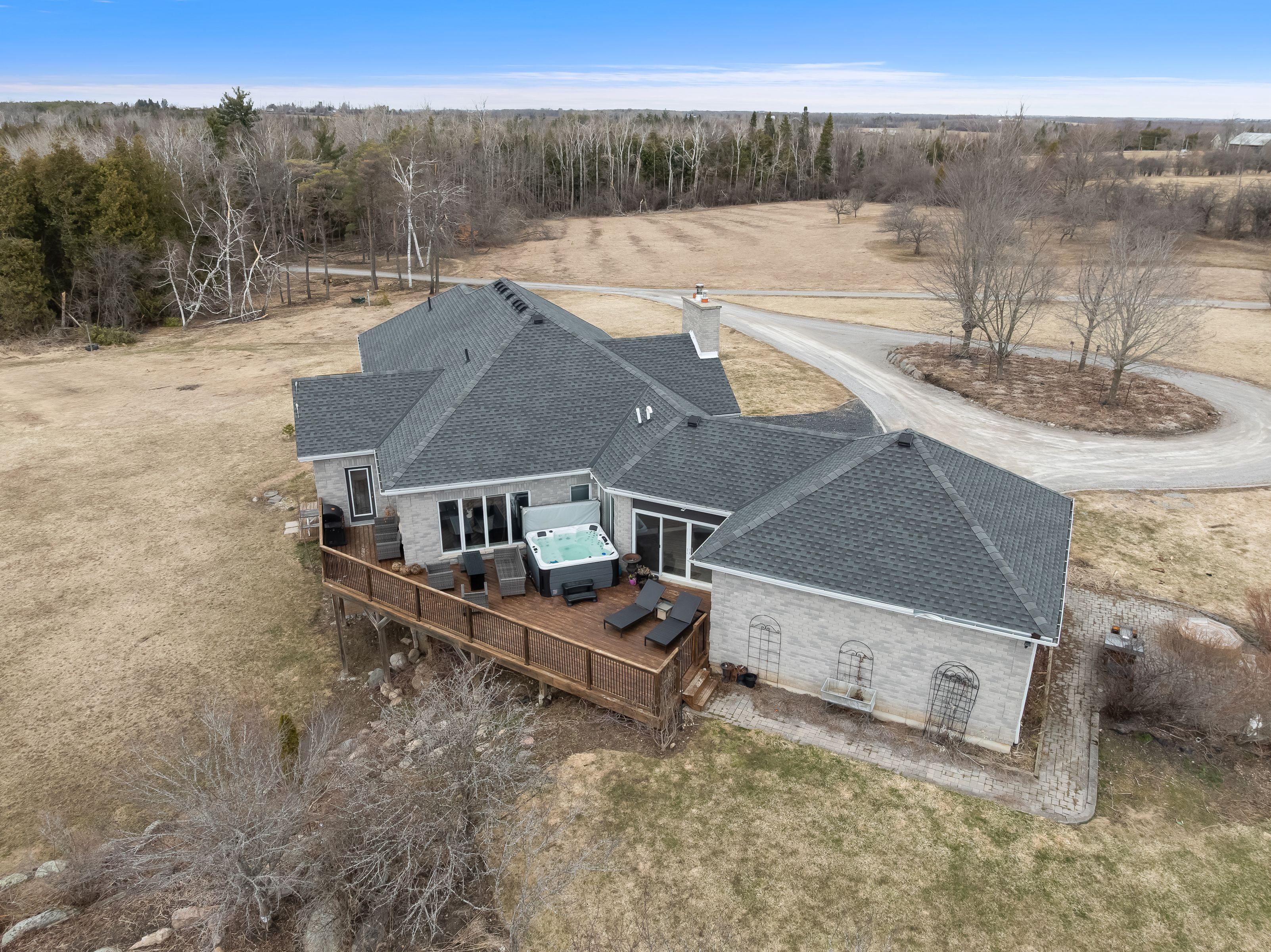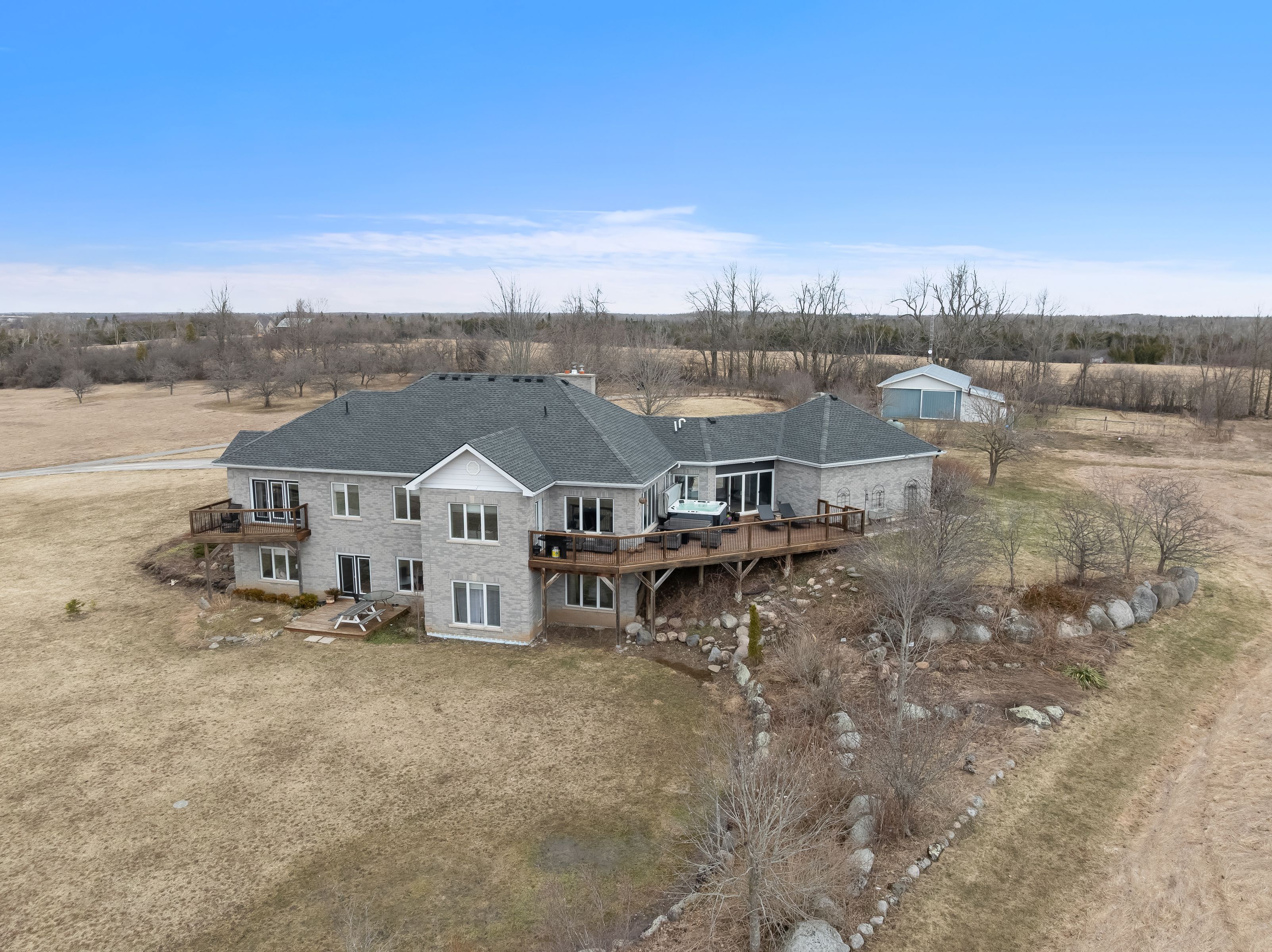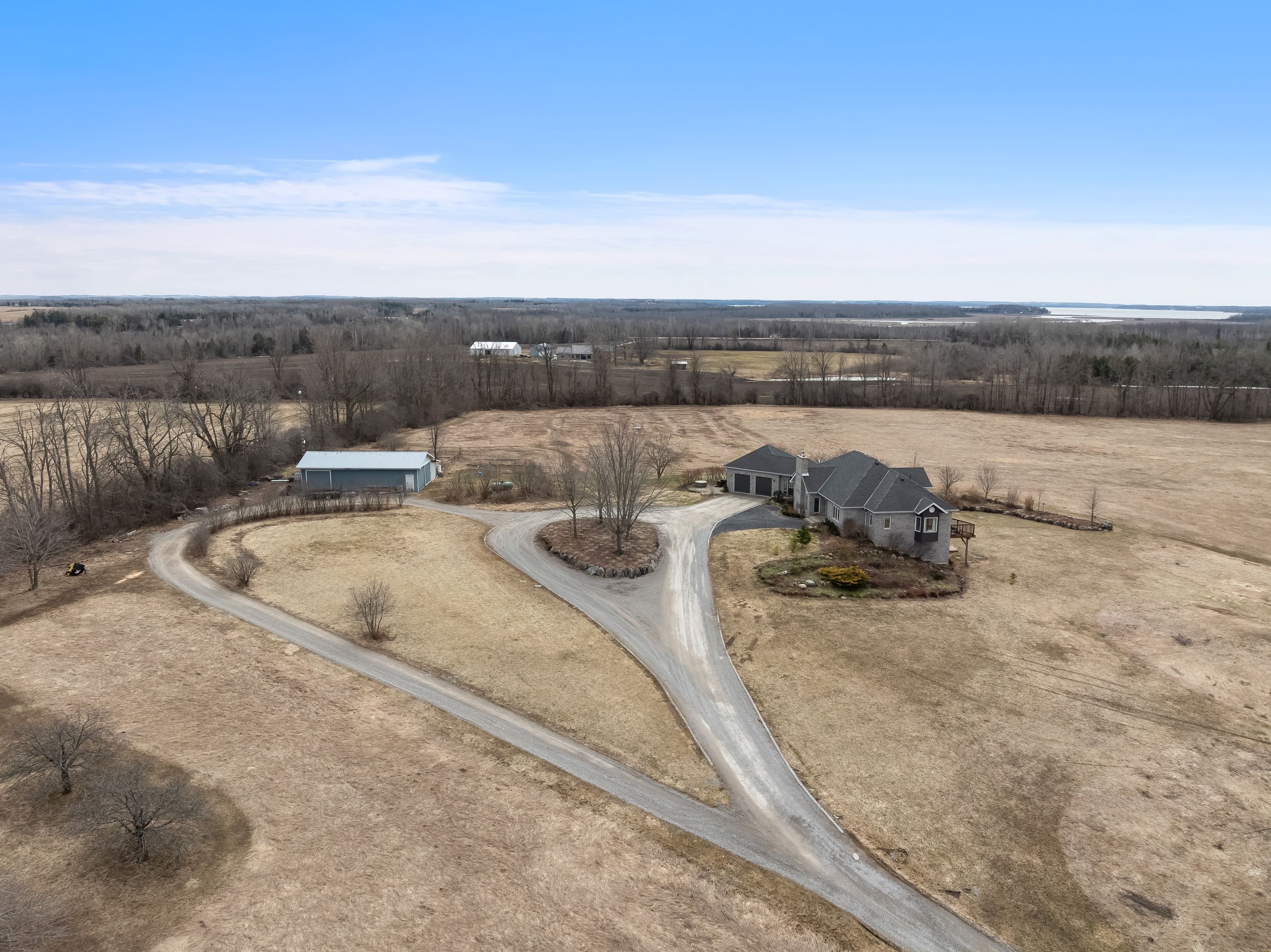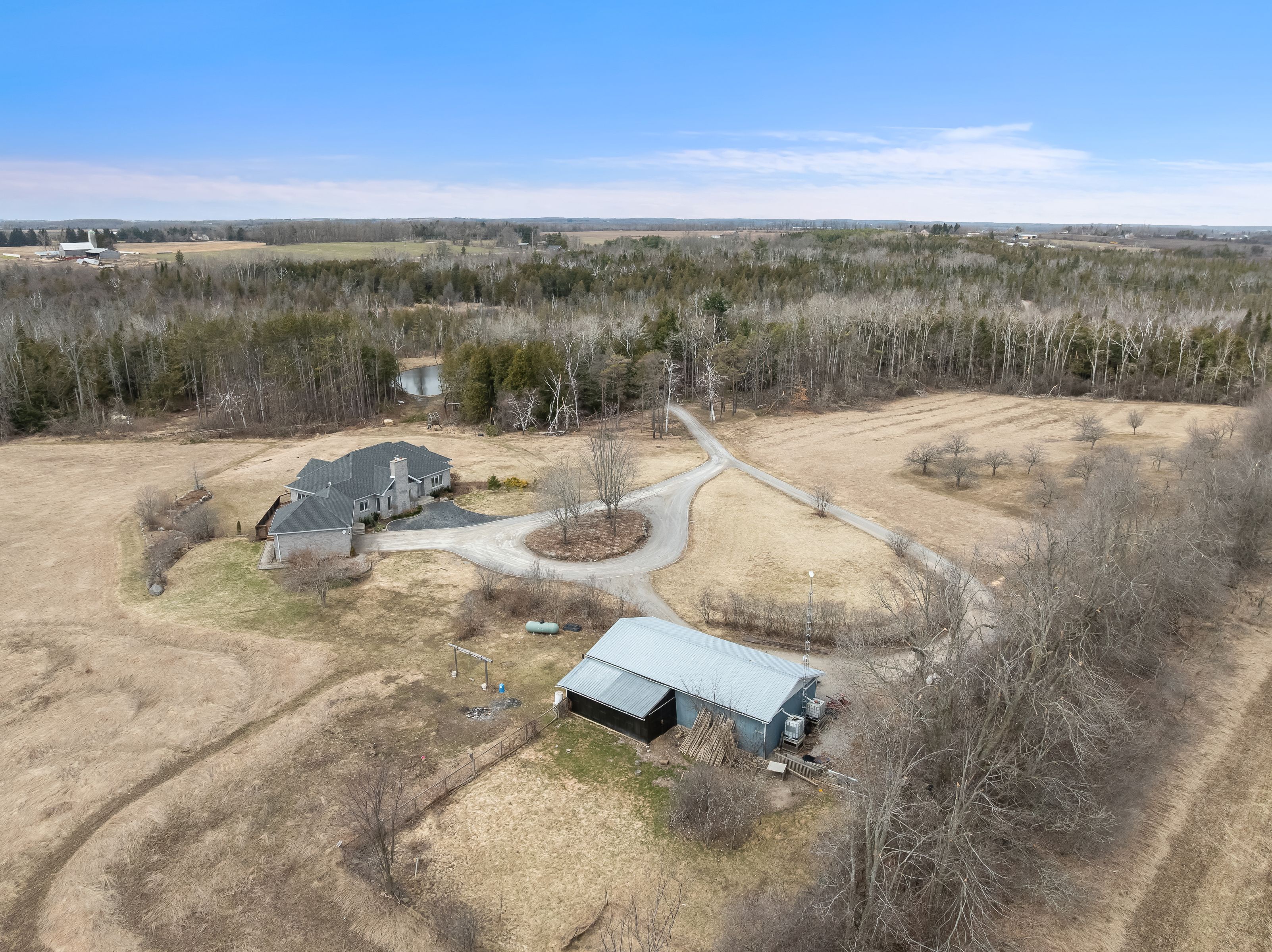 Escape to complete privacy on this stunning 49-acre property featuring a spacious custom 2+3 bedroom, 5-bathroom brick bungalow with over 4,000 total finished square feet of living space (per floor plans), a double garage and walkout basement. Set back from the road with a long, winding driveway through mature forest, this home offers peace, seclusion, and breathtaking views in every direction. The home is thoughtfully designed for comfortable living, with a main floor that includes a sun-filled living room with a wood-burning fireplace, an open-concept kitchen with quartz counters, a dining area, and a breakfast nook plus multiple walkouts to an elevated deck with panoramic views. The primary suite features its own private balcony, walk-in closet, and ensuite, while a second main floor bedroom also enjoys a private ensuite. Main floor laundry and a sunroom connecting to the double garage add everyday convenience. The walkout basement boasts 3 large bedrooms, each with walk-in closets and oversized above-grade windows, including one with an ensuite. A kitchenette on the lower level accomodates large families, multi-generational living or a potential in-law/rental suite. Outdoors, enjoy a large pond, a beautifully landscaped fire pit area, and approximately 14 cleared acres. A 24 x 48 detached workshop with a 12 x 25 addition is perfect for hobbyists or extra storage. The ICF foundation ensures energy efficiency and long-term durability. Ideally located between Port Perry and Lindsay and just a short drive to Lake Scugog, this is the ultimate private country retreat with all the comforts of home.