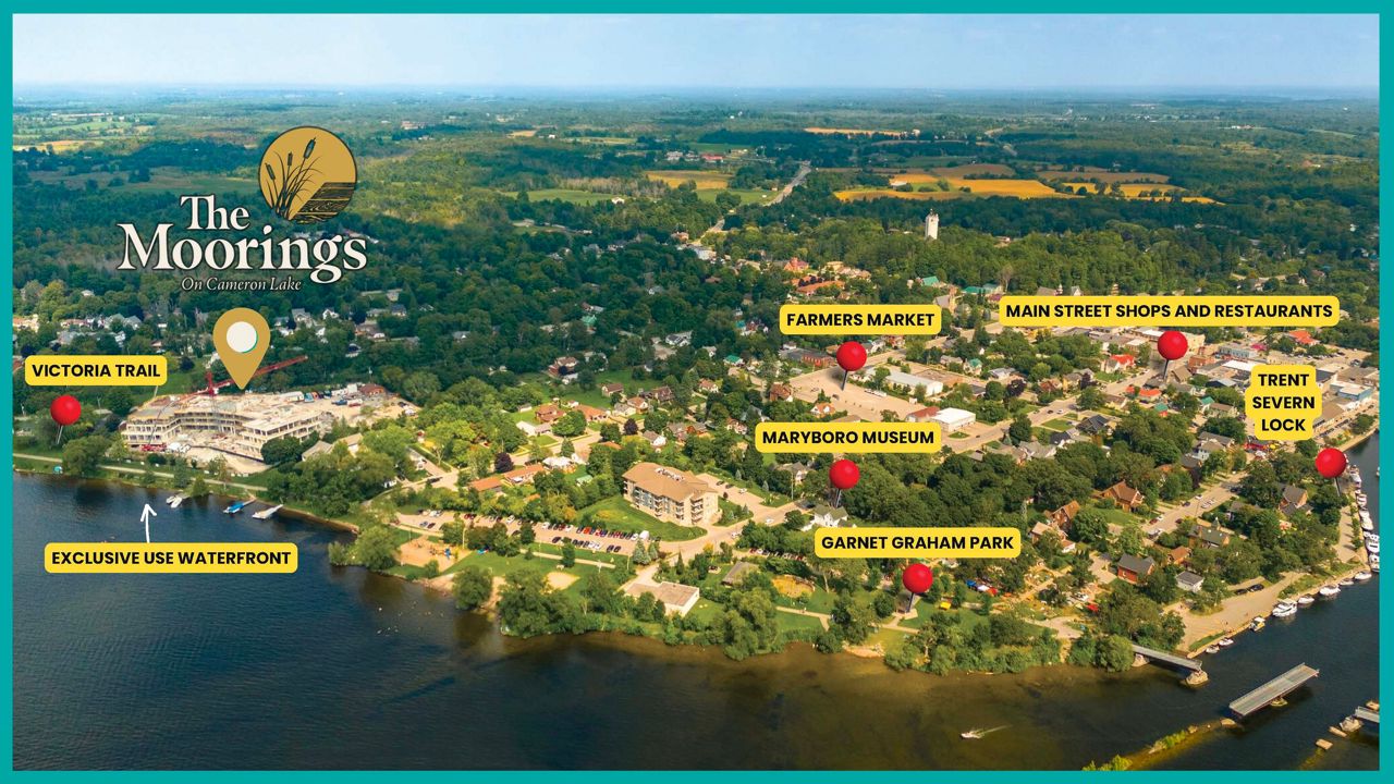 The Moorings on Cameron Lake is Fenelon Falls premiere new waterfront condo property with an un-matched location and impressive outdoor terraces with BBQ hookup and hose bib. Direct waterfront access to Cameron Lake with stunning sunset views. A short stroll to local shops, restaurants, farmers market, parks, locks...literally everything in town you would need is approx. a 10 min. walk! Direct access to the 55 km Victoria Rail Trail for endless scenic biking and walking in a beautiful natural environment. Short drive to golf and spa. Approx. 10 ft. ceiling height with massive windows and 2 walk outs provide light and bright interior living spaces that transition to 2 incredibly large outdoor terraces measuring 37.5" x 9'10" and 25'10" x 9'10". Gorgeous kitchen with island, quartz counters and quartz backsplash. Engineered Hardwood throughout. Porcelain tile in Bathrooms and Laundry Room. Quartz counters in Bathrooms. Price includes Parking and Locker.**EXTRAS** S/S Appliances - Refrigerator, Beverage Fridge, Wall Oven with Microwave, Gas Cooktop, Dishwasher, Range Hood. Quartz countertops in Kitchen and Bathrooms. Laundry room with Side by Side Washer and Dryer.