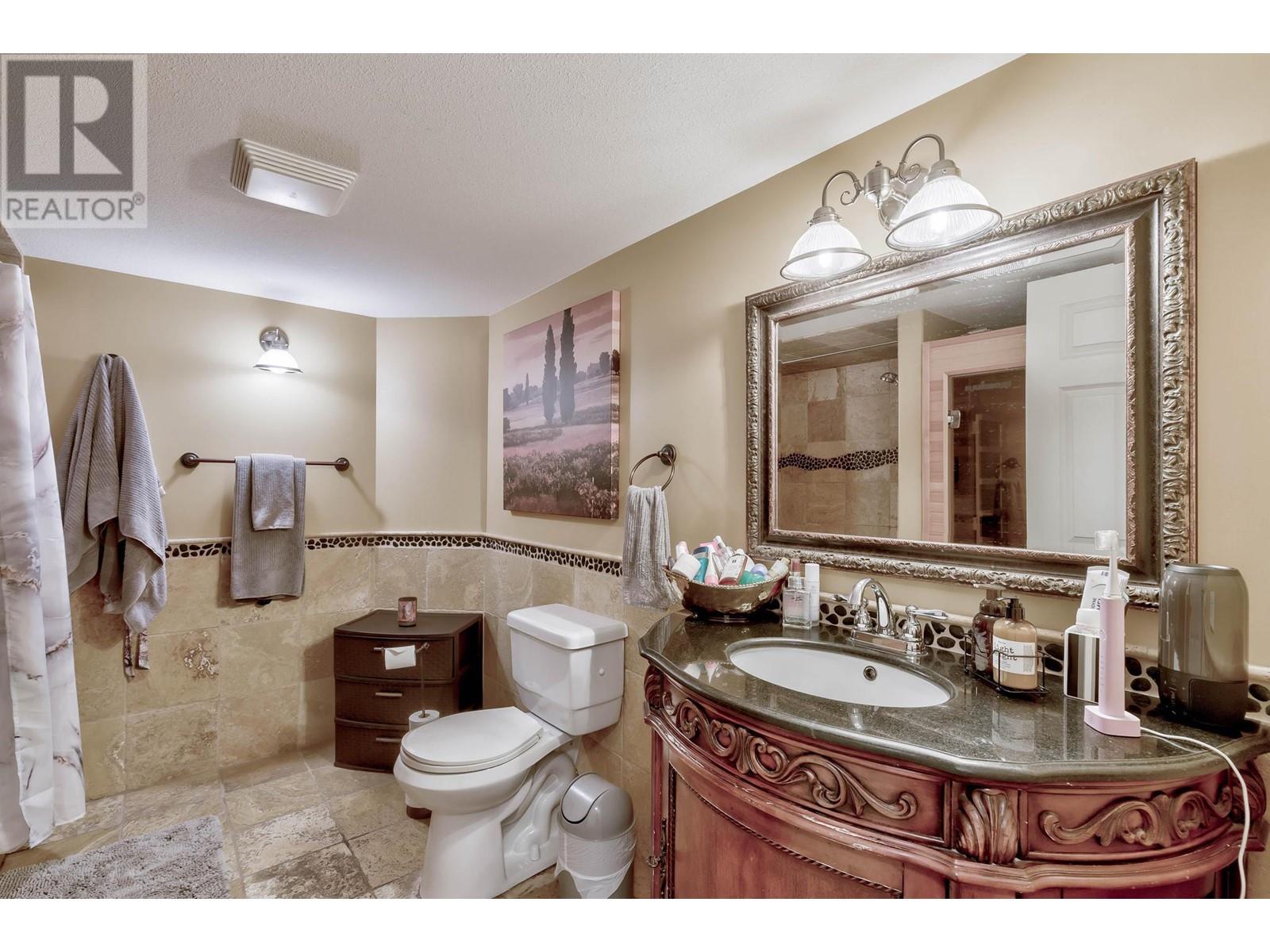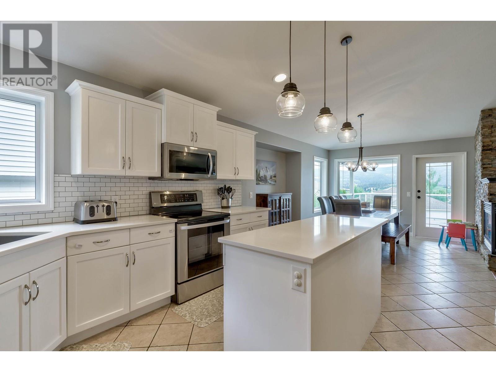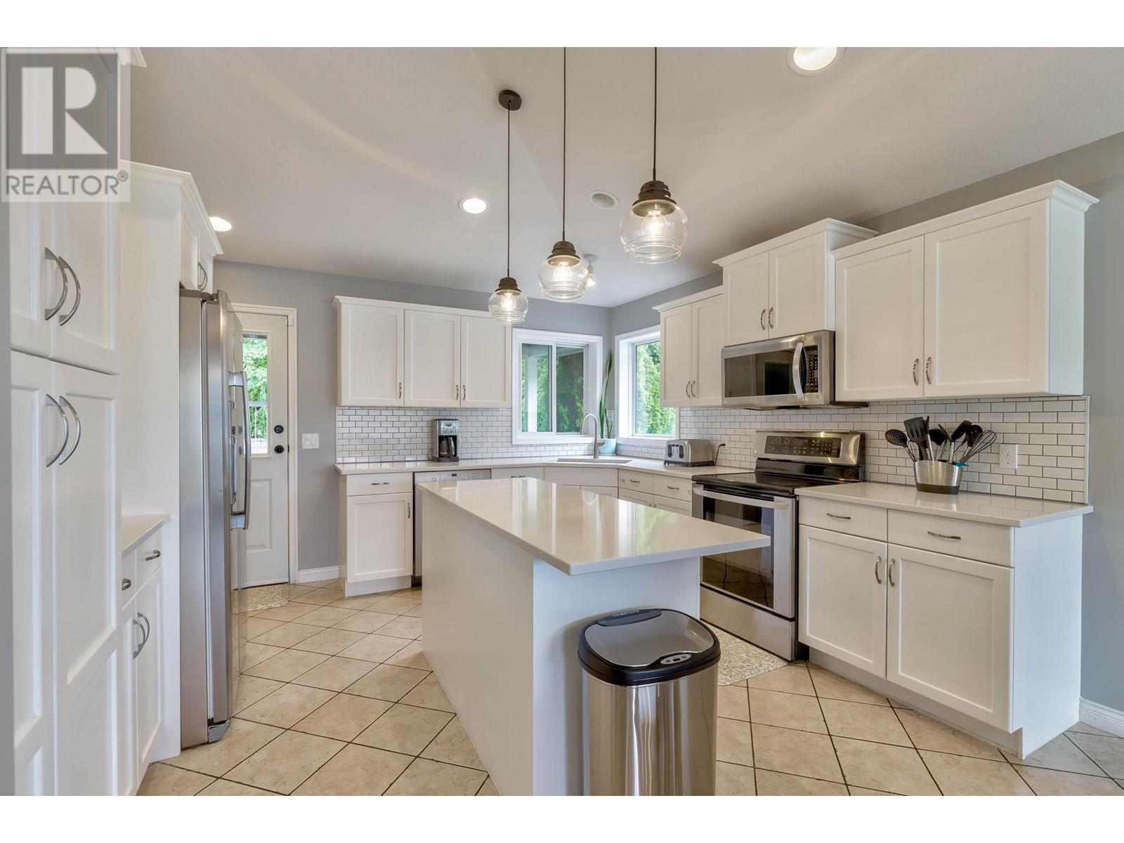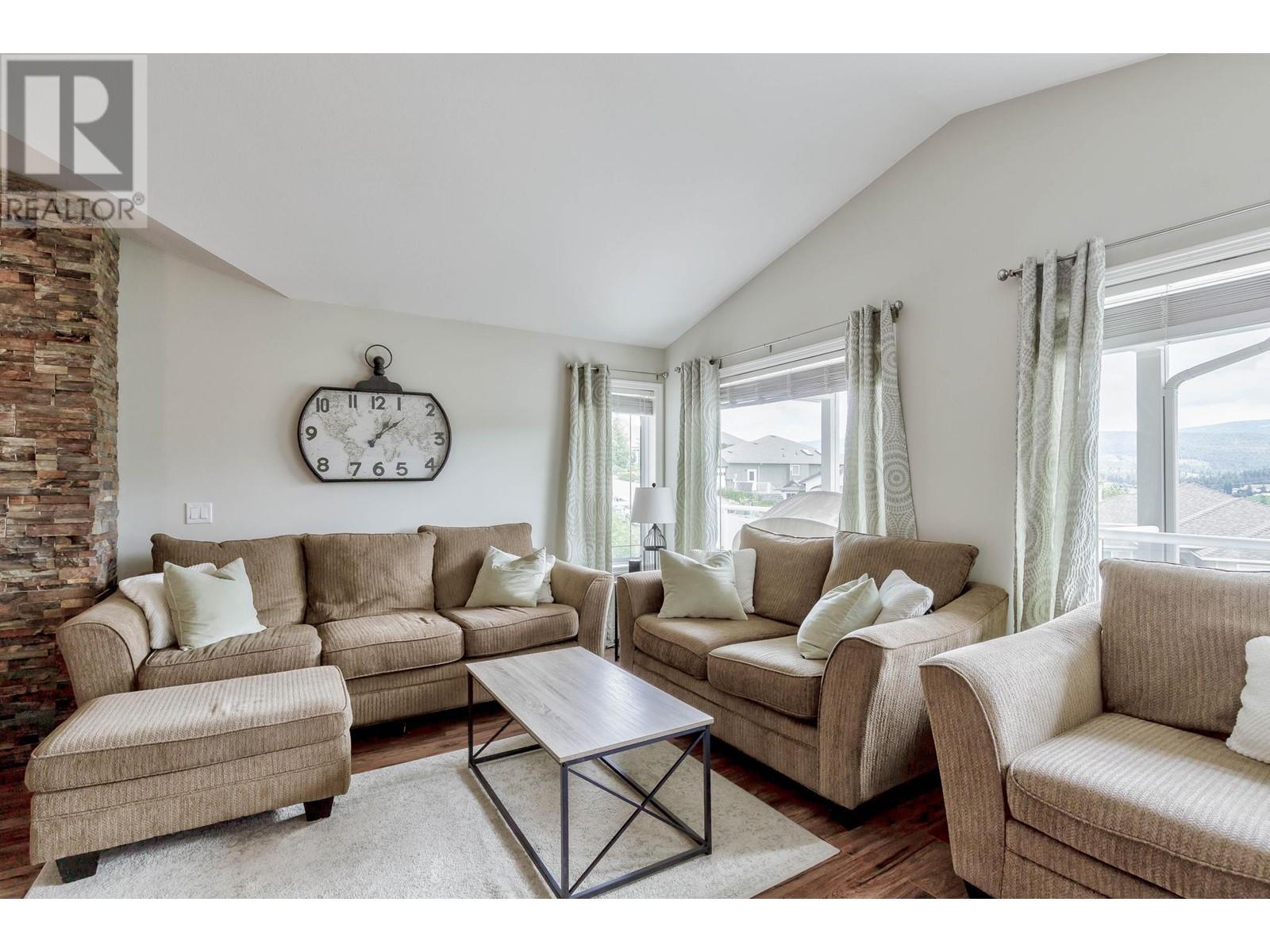 Don’t miss this 5 Bedroom home in a quiet, family friendly neighborhood just minutes from Black Mountain Elementary School and Golf Course, hiking trails and a park! Enter from the front door or the oversized garage to the tiled foyer, where you can head up the elegant curved staircase which takes you to the main level. The living room has large windows and a 3-sided gas fireplace that is shared with the dining room. Step onto the covered front deck with peaceful mountain views from the dining room. The beautiful, recently updated island kitchen boasts quartz countertops, white tile backsplash, newer stainless appliances and tons of cupboard space with built-in pantry! Enjoy easy access from the kitchen to the covered patio and private backyard - Perfect for those summer BBQ’s! You will find 3 bedrooms upstairs on the main level, including the Primary Bedroom featuring a Walk-in closet and 4-piece Ensuite Bathroom with walk-in shower, luxurious soaker tub and makeup vanity. Another full bathroom and convenient main floor laundry room with extra storage and laundry sink complete this level of the home. The ground level has French Doors which lead to the spacious rec room, and 2 huge bedrooms, a 3 piece bathroom featuring a tile walk-in shower and built in sauna, and mechanical room with lots of extra space for storage. Extra parking on the flat driveway. (id:22211)