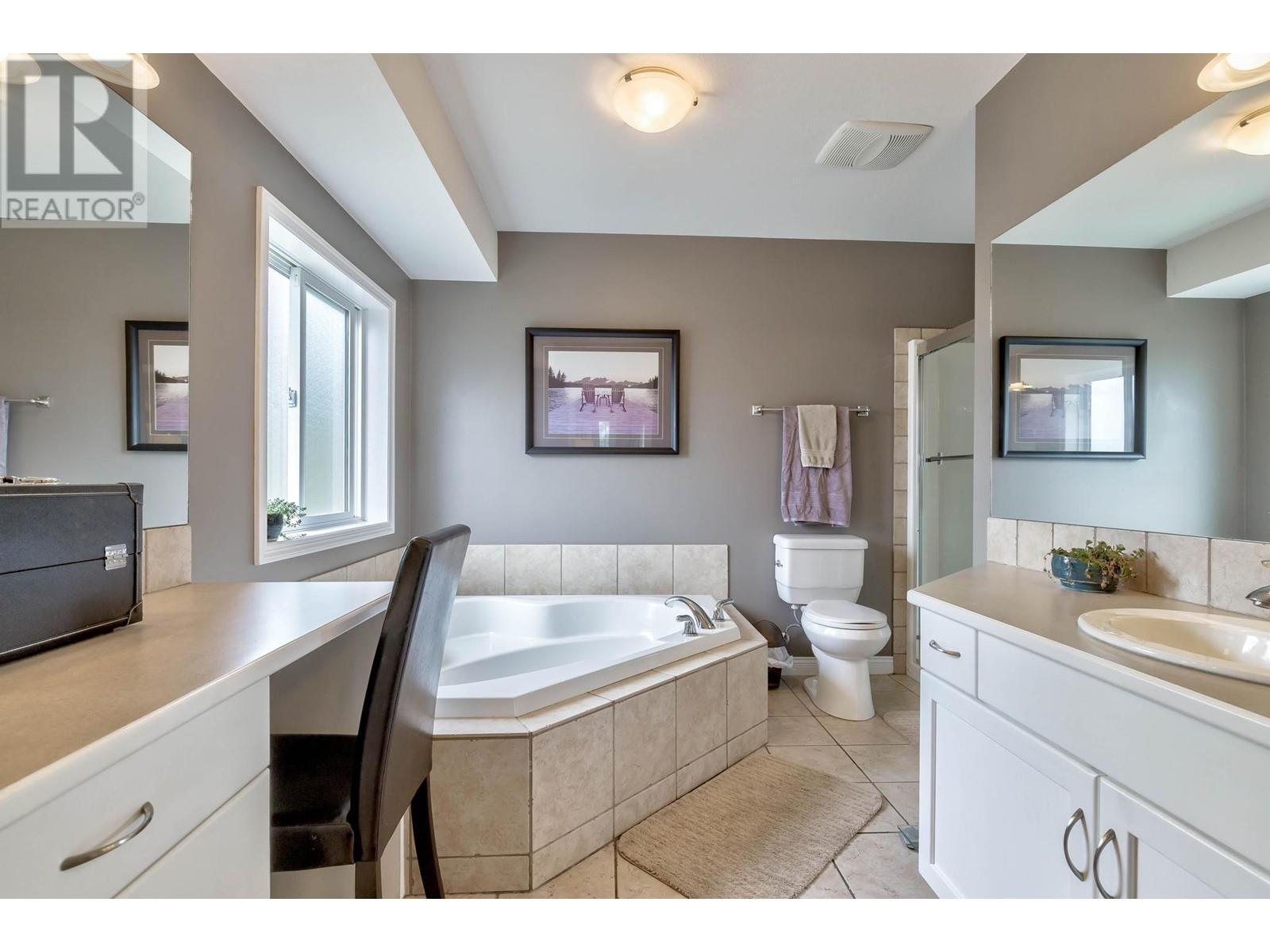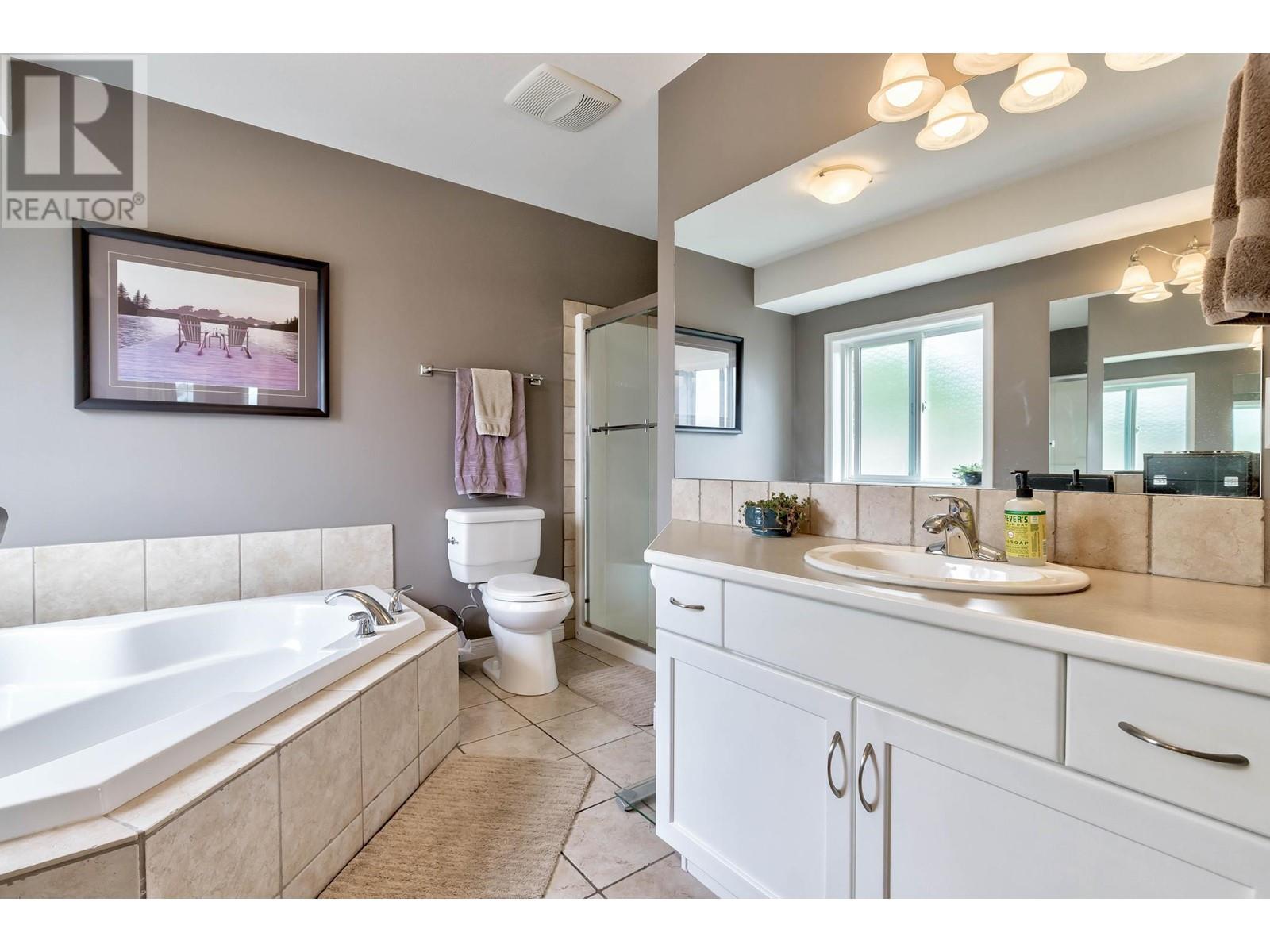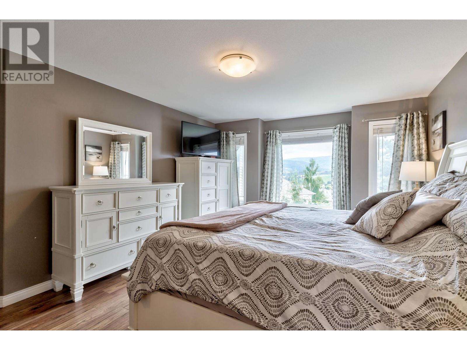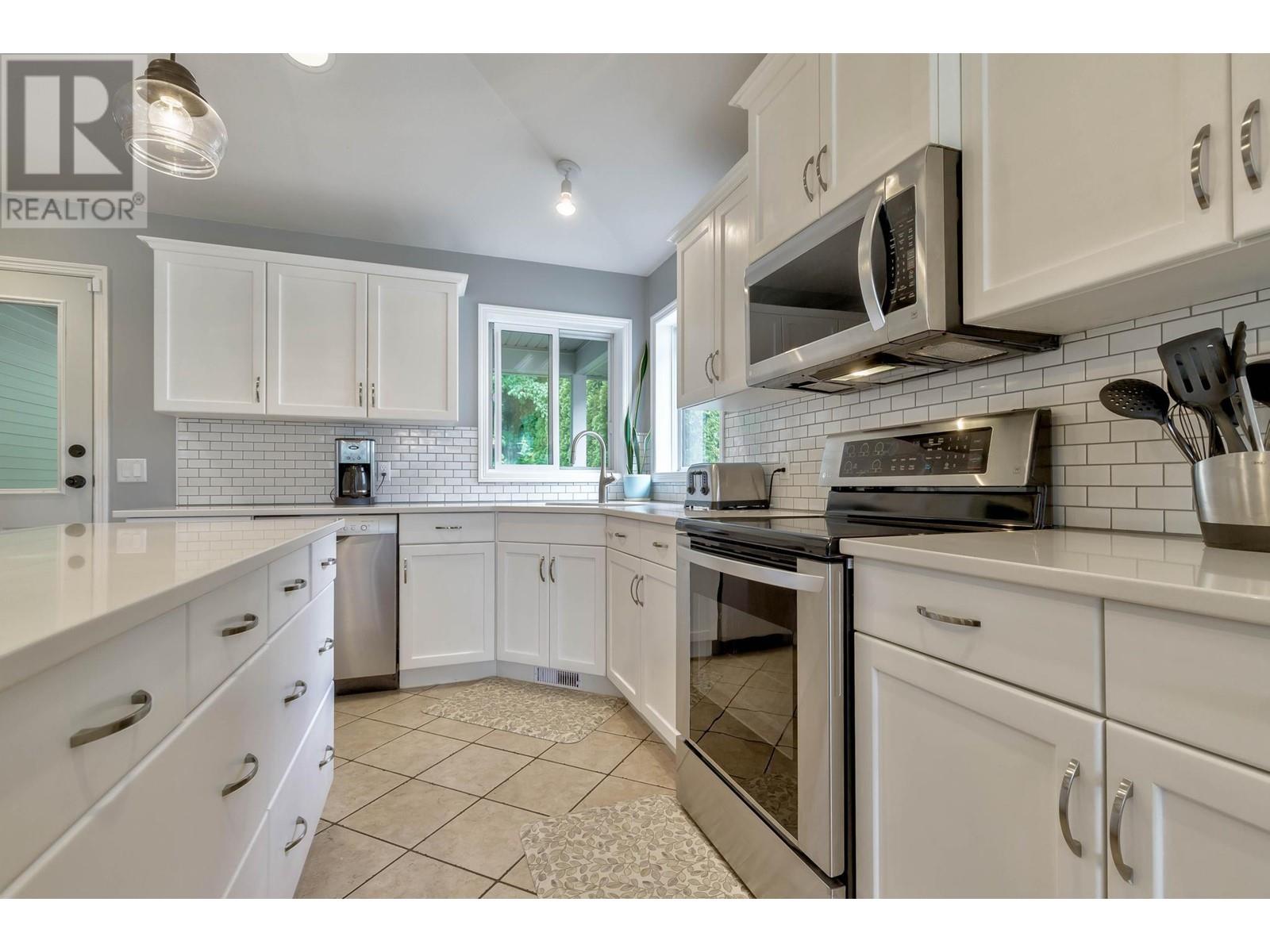 Don’t miss this 5 Bedroom home in a quiet, family friendly neighborhood just minutes from Black Mountain Elementary School and Golf Course, hiking trails and a park! Enter from the front door or the oversized garage to the tiled foyer, where you can head up the elegant curved staircase which takes you to the main level. The living room has large windows and a 3-sided gas fireplace that is shared with the dining room. Step onto the covered front deck with peaceful mountain views from the dining room. The beautiful, recently updated island kitchen boasts quartz countertops, white tile backsplash, newer stainless appliances and tons of cupboard space with built-in pantry! Enjoy easy access from the kitchen to the covered patio and private backyard - Perfect for those summer BBQ’s! You will find 3 bedrooms upstairs on the main level, including the Primary Bedroom featuring a Walk-in closet and 4-piece Ensuite Bathroom with walk-in shower, luxurious soaker tub and makeup vanity. Another full bathroom and convenient main floor laundry room with extra storage and laundry sink complete this level of the home. The ground level has French Doors which lead to the spacious rec room, and 2 huge bedrooms, a 3 piece bathroom featuring a tile walk-in shower and built in sauna, and mechanical room with lots of extra space for storage. Extra parking on the flat driveway. (id:22211)