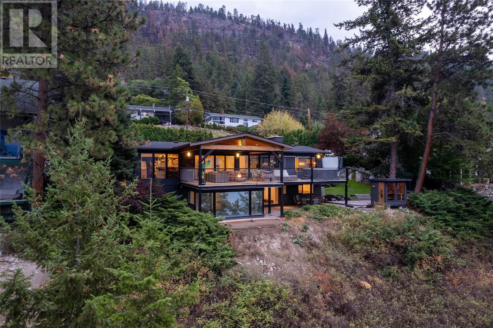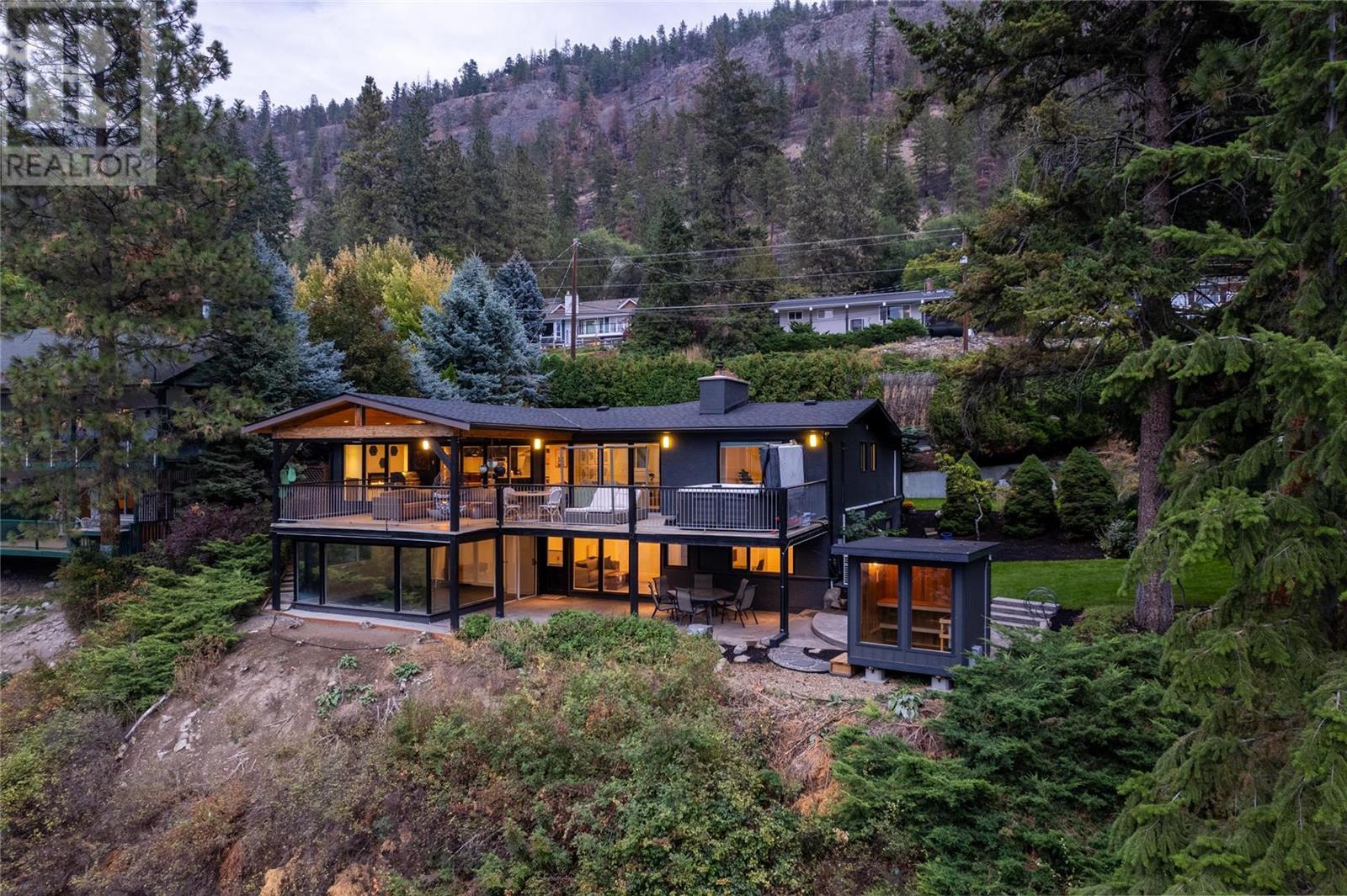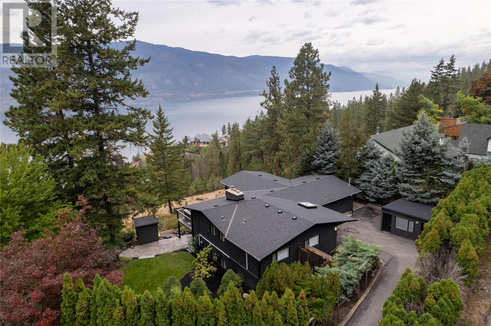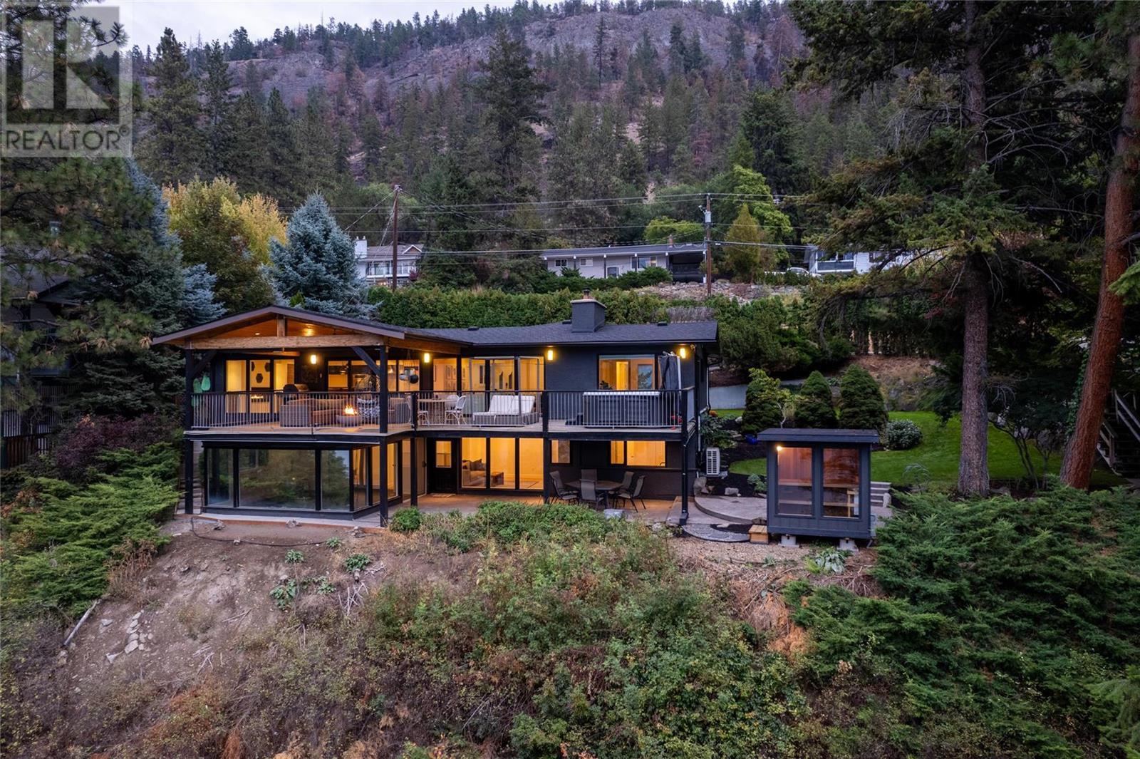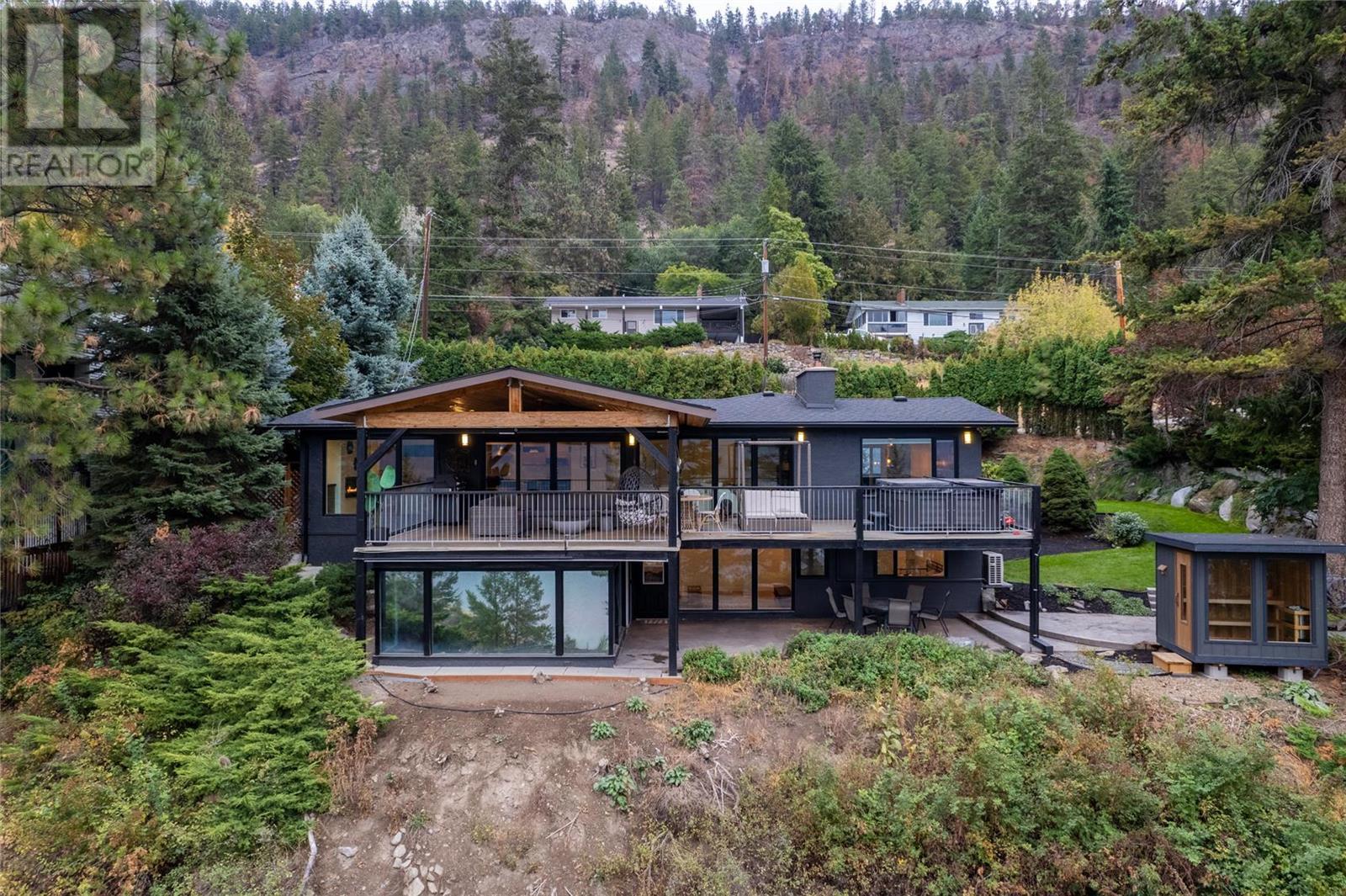 Incredible unobstructed lakeview treehouse just mins from everything. Totally renovated inside and completely furnished with west coast modern lakehouse design. Big lake+sunset views with no home in front + room for pool. Ideal yard for family, w/mature trees, garden on this large .40 ac lot. Perched overlooking Okanagan Lake, this home Feels like a private cottage or retreat yet under 10 mins to downtown and 5 mins to the lake. Convert or expand the garage/shop. Recent updates include paint, roof, a/c, floors, home automation/security. Open chefs kitchen w/quartz counters, custom cabinets, s/s appliances, wine fridge, dining seats 12+. 3 bdrms on main level, 2 on lower level, plus gym and large storage room. Covered deck with bbq, fire table hot tub. Covered walk-out lower deck with lakeview sauna. Warm entryway w/skylight. Great neighbors, the ultimate family home in a great neighborhood. Walk directly out to Lochview trail. Explore short term rental possibilities to offset your investment. The community shares deed access to a private 200 foot beach off Lochview Road. (id:22211)