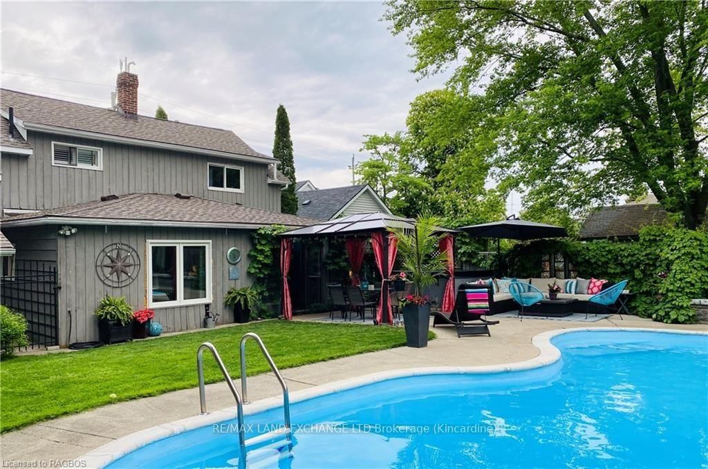 Charming 3-Bedroom Home with In-Ground Pool, Steps from Downtown. Located just a short stroll from downtown shopping, golf courses, scenic trails, and beautiful beaches, this well-maintained 3-bedroom, 1.5-storey home offers the perfect home in the middle of all the action. Over the years, the home has seen numerous updates, including a newer gas furnace, roof, kitchen, flooring, and wood siding treatment, just to name a few. The spacious eat-in kitchen flows seamlessly into both the media and living rooms, creating a welcoming space for entertaining and everyday living. Step outside to the stunning backyard patio, where a concrete in-ground pool awaits, painted in 2020 and equipped with a newer pump and filter for worry-free enjoyment. The finished basement features a large rec room and an additional 3-piece bathroom, offering extra living space for family or guests. An insulated and heated double-car garage is connected to the home by a convenient breezeway, which also provides direct access to the backyard. This move-in-ready home is a rare find, schedule your private showing today!