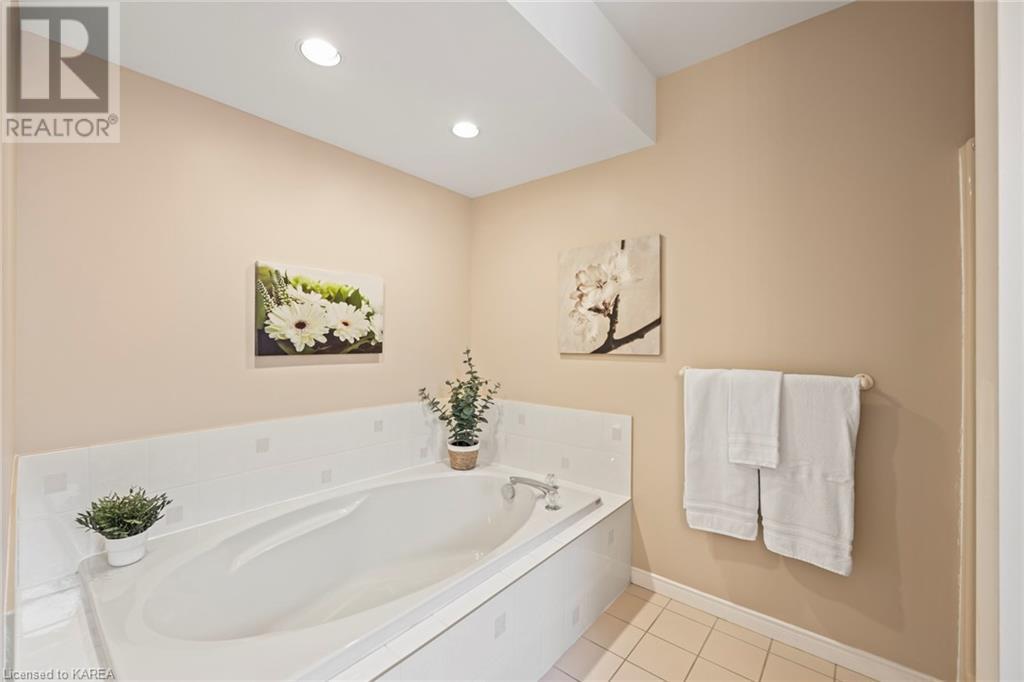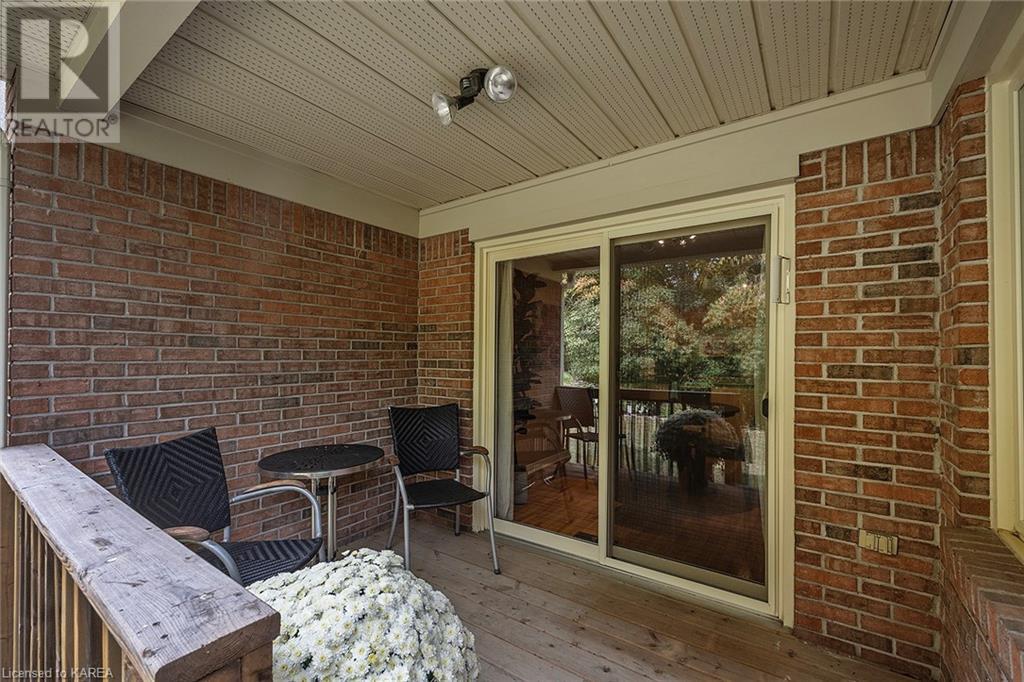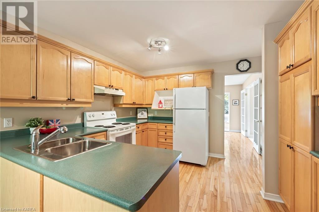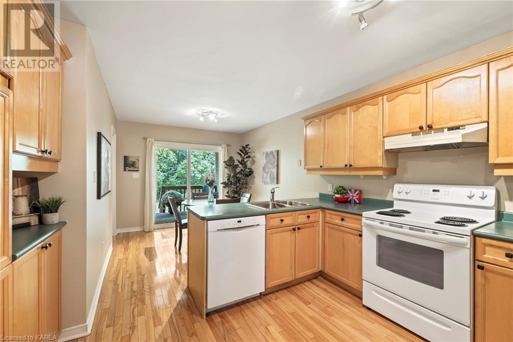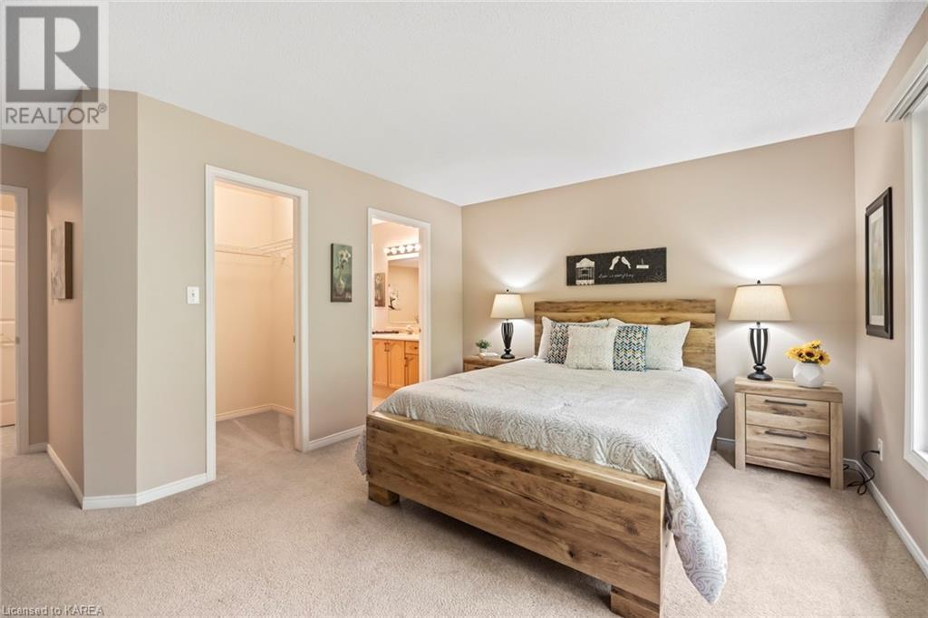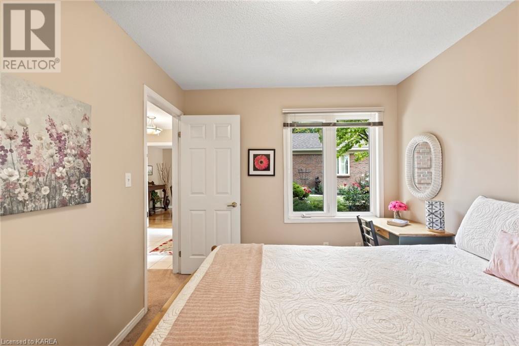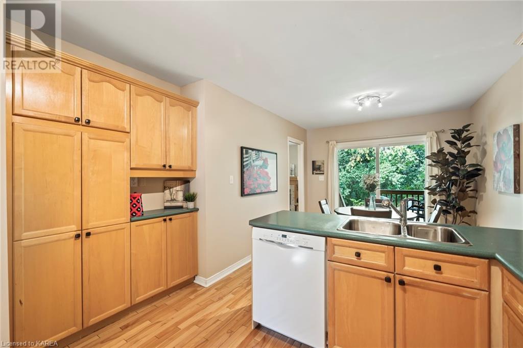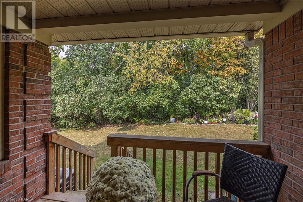 An opportunity awaits in the coveted waterfront community of Rideau Village on Kingston’s east side. This all-brick, well-maintained, semi-detached bungalow has three bedrooms, two full bathrooms and 1630 ft2 of finished space. The dining room features hardwood floors and a sunny bay window filling the room with lots of light. Hardwood floors flow through to the kitchen and dinette area, pairing perfectly with natural maple cabinetry. The spacious family room has a cozy gas fireplace to enjoy on cool autumn nights. Open the sliding patio doors onto the covered deck and private backyard with a beautiful treed view. The large primary bedroom can accommodate a king-sized bed and features a walk-in closet and 4-piece ensuite with a separate shower and soaker tub. There are two more bedrooms for family, guests or a home office. The convenient main floor laundry has direct inside entry to the two-car garage. The lower level awaits your future plans for finishing and boasts an abundance of storage space. Professionally painted throughout and fully-equipped with appliances. Exterior maintenance including landscaping and snow removal is covered by the condominium corporation. Be a part of the carefree lifestyle this community has to offer, swim in the private outdoor pool or a walk along the trails. Conveniently located just minutes to downtown and surrounded by amenities. Don’t wait! (id:22211)