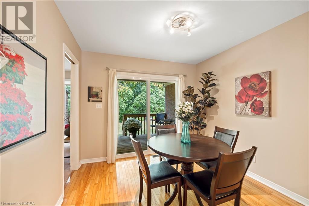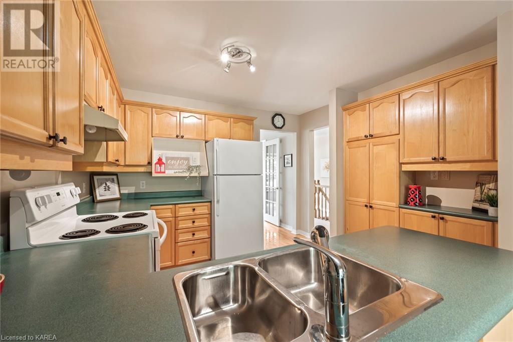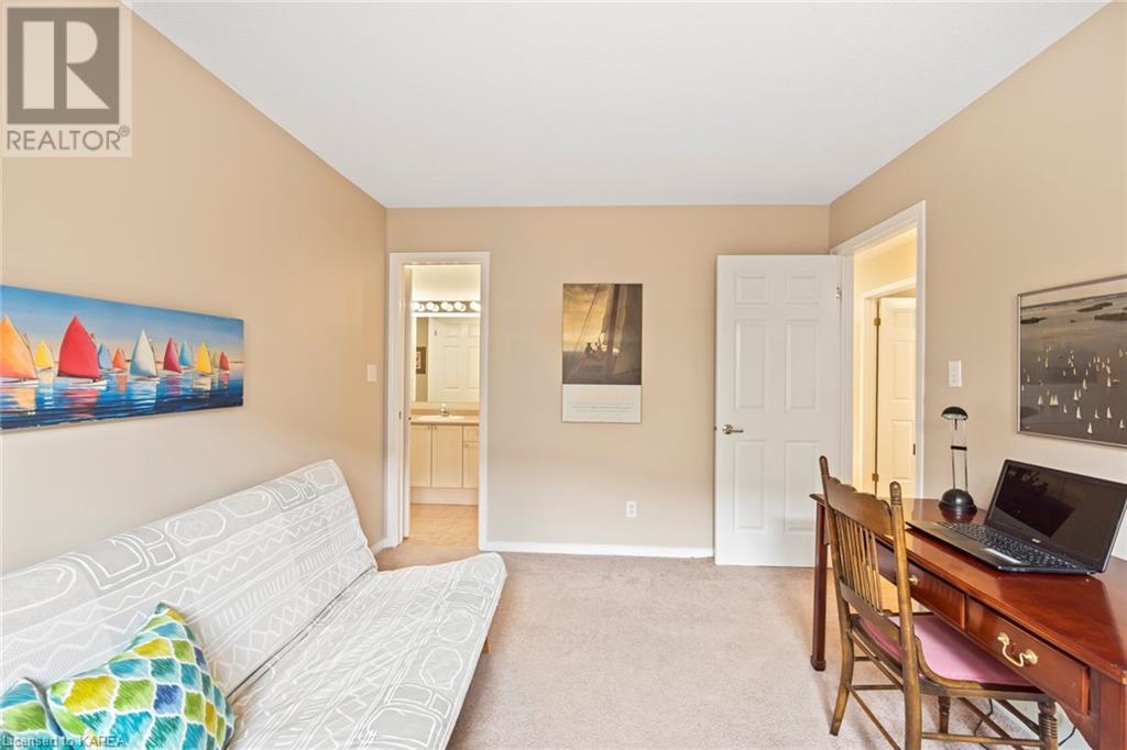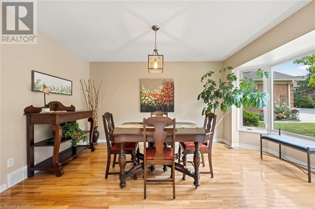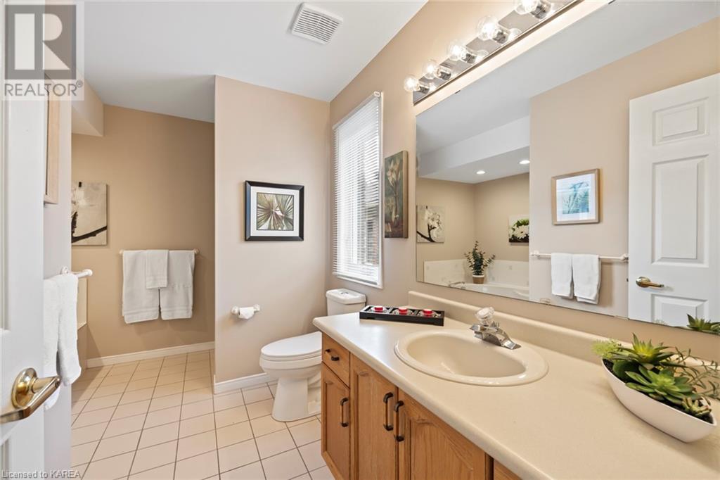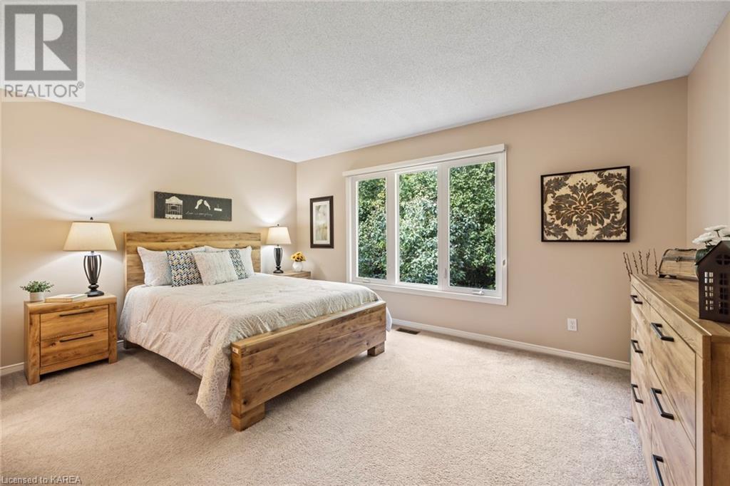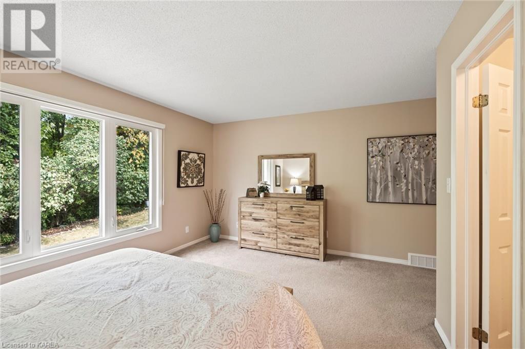 An opportunity awaits in the coveted waterfront community of Rideau Village on Kingston’s east side. This all-brick, well-maintained, semi-detached bungalow has three bedrooms, two full bathrooms and 1630 ft2 of finished space. The dining room features hardwood floors and a sunny bay window filling the room with lots of light. Hardwood floors flow through to the kitchen and dinette area, pairing perfectly with natural maple cabinetry. The spacious family room has a cozy gas fireplace to enjoy on cool autumn nights. Open the sliding patio doors onto the covered deck and private backyard with a beautiful treed view. The large primary bedroom can accommodate a king-sized bed and features a walk-in closet and 4-piece ensuite with a separate shower and soaker tub. There are two more bedrooms for family, guests or a home office. The convenient main floor laundry has direct inside entry to the two-car garage. The lower level awaits your future plans for finishing and boasts an abundance of storage space. Professionally painted throughout and fully-equipped with appliances. Exterior maintenance including landscaping and snow removal is covered by the condominium corporation. Be a part of the carefree lifestyle this community has to offer, swim in the private outdoor pool or a walk along the trails. Conveniently located just minutes to downtown and surrounded by amenities. Don’t wait! (id:22211)