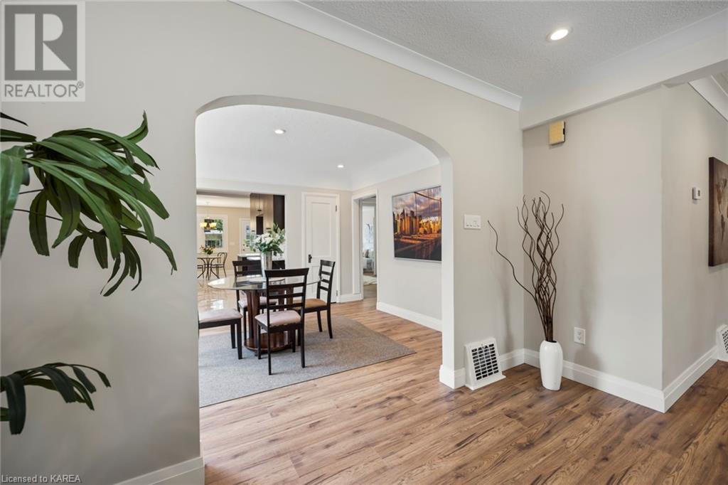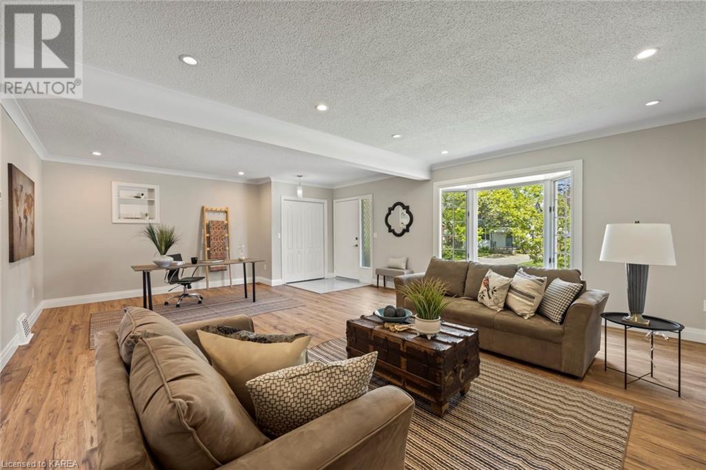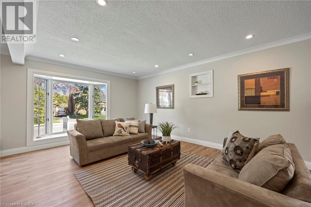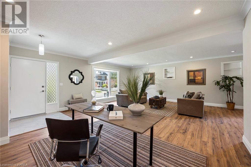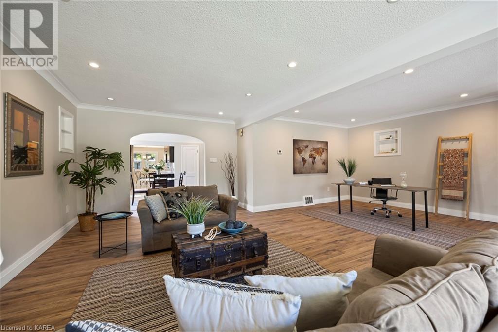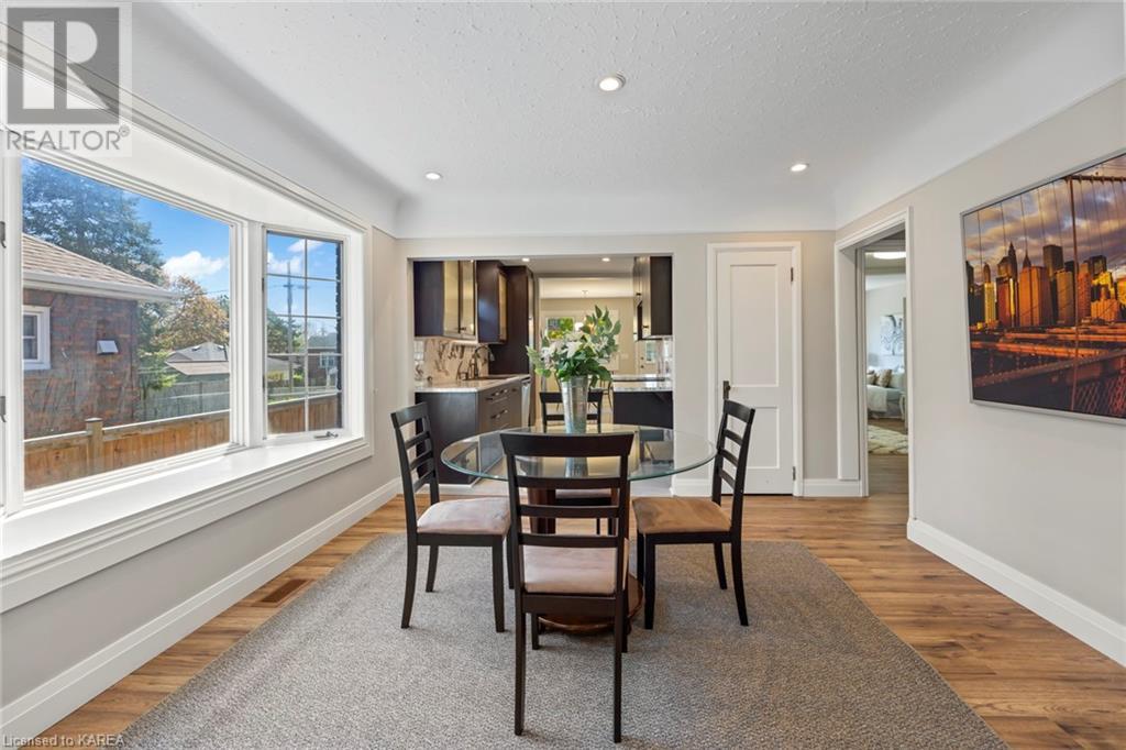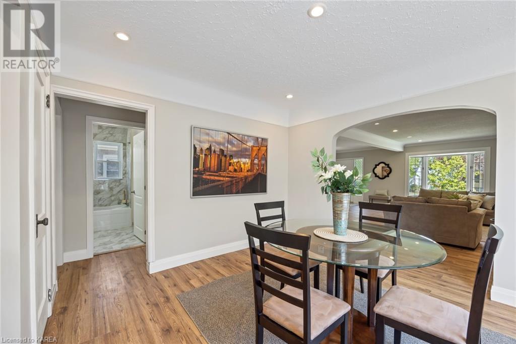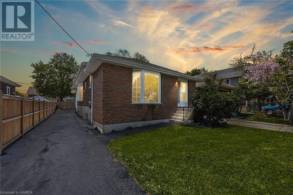 Charming and tastefully renovated elevated bungalow located in central Kingston! Only 10 min walk to downtown Kingston and situated on a quiet residential street near all amenities. Excellent schools, grocery stores, hospitals, restaurants all in the immediate area. This spacious 2 bedroom bungalow will provide you with lots of space to live and you will love the new renovations to flooring, main bathroom along with elegant pot lighting throughout the main floor. The living room is massive and bright! It is ideal for entertaining and could easily be reduced to allow for a 3rd upper level bedroom/office. The gallery kitchen offers lots of room for storage and leads to a dining nook with access to the backyard. The lower level is partly finished offering a large rec room ideal for an entertainment centre or play area for children. The basement is complete with a bathroom (2 piece) and a bonus room which could serve multiple purposes. Newer roof shingles (2021). The backyard can park 2 cars and there is a small deck leading to a small low maintenance backyard space. Quick possession available. (id:22211)