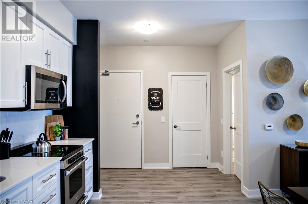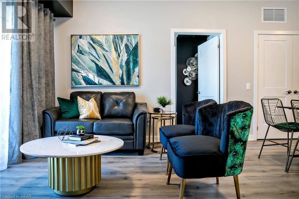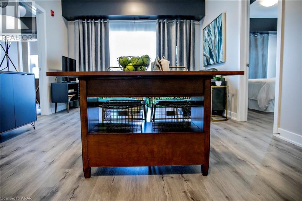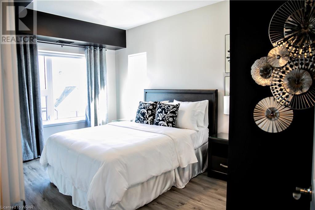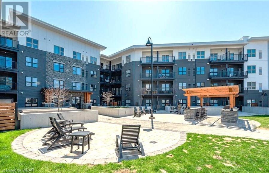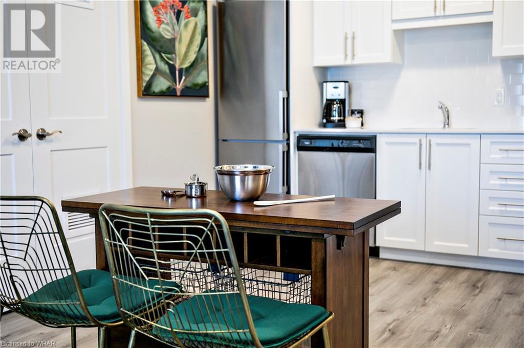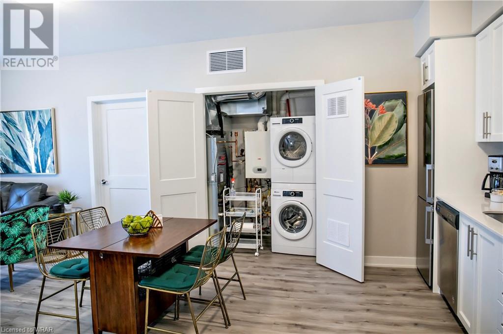 TWO underground parking spots, TWO bedrooms, TWO full baths - Don't miss this one! A suite that has everything you could need. This property is perfect for the divorcee starting over, someone immigrating to the Waterloo Region, the first time buyer leaving the rental scene. Updates include shaker style cabinetry, carpet-free throughout with luxury vinyl plank flooring, primary suite with built-in closet organizers and walk-in shower. This unit is the SEQUOIA floor plan with 9' ceilings, on-demand hot water, stacked washer/dryer, stainless appliances, quartz countertops. The second bedroom is currently set up as a den with an exquisite feature wall, perfect for working from home. This corner unit faces west letting that gorgeous afternoon sun in. Enjoy your morning coffee on your private balcony! Amenities include a stunning courtyard complete with landscaping, outdoor furniture and BBQ; a private party room that anyone would love; moving room, garbage and recycling room and an awesome underground garage complete with bicycle storage area - parking issues are solved this winter! You'll be proud to own this suite! Close to highways, 401, public transit and major shopping centres. All furnishings are available. (id:22211)