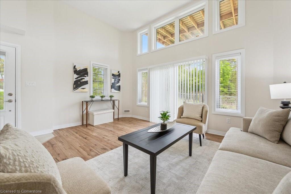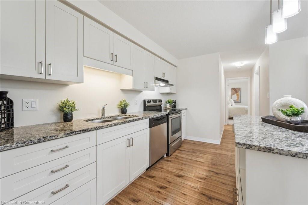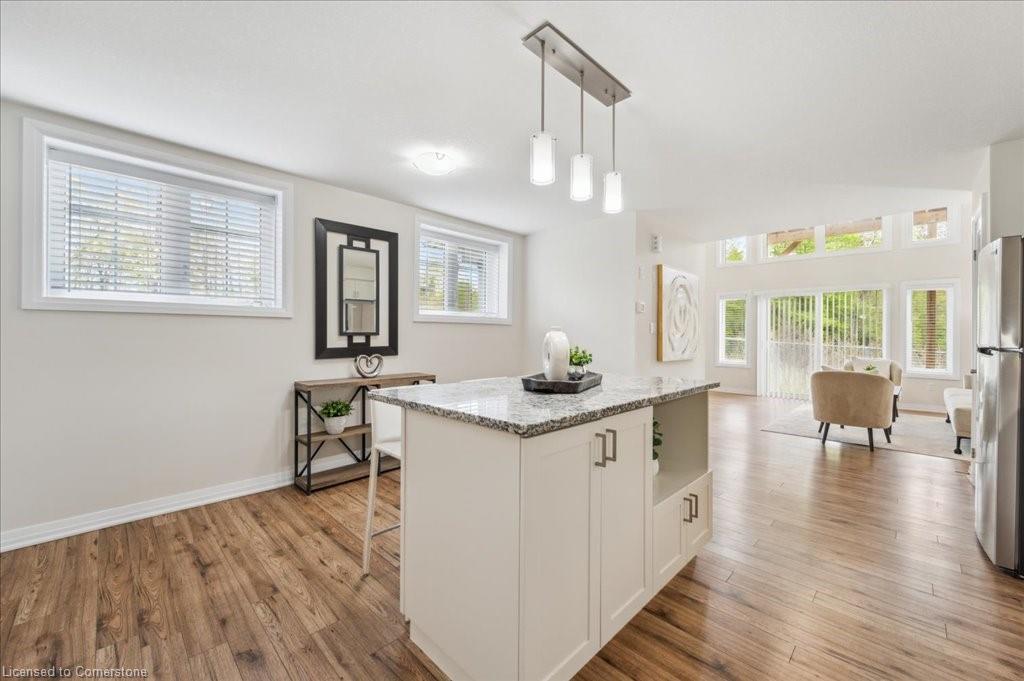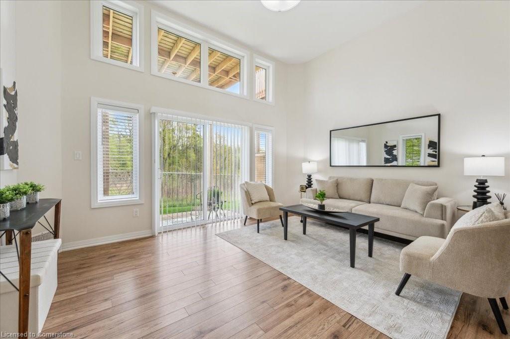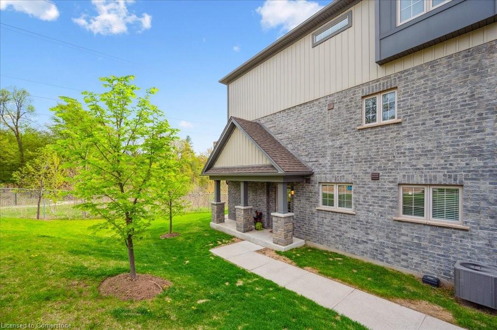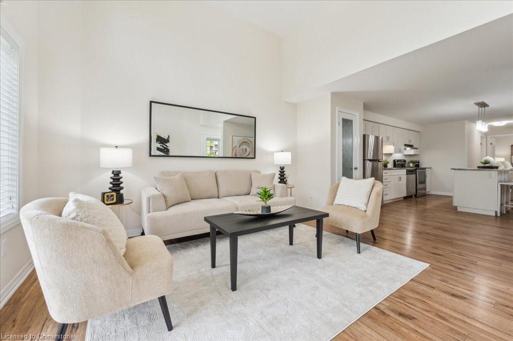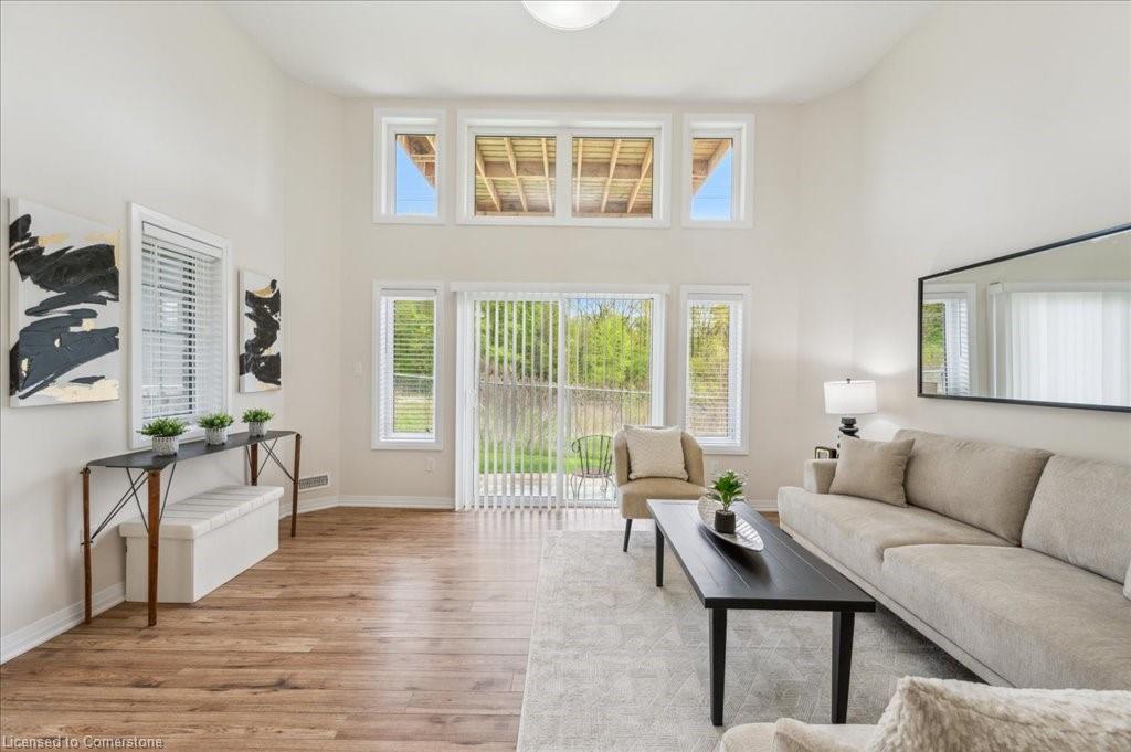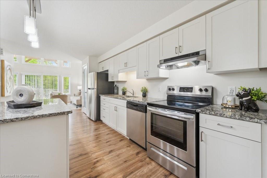 WOW! A Gorgeous luxury Condo located minutes from Hwy 401. This Bright and Airy 1 Bedroom 1 bath unit backs on Greenbelt. Private entry to your home, coat closet at the front door flows into the large great-room with 12 foot high ceilings! Wall to ceiling windows and patio doors overlooking the greenbelt. Enjoy nature and this beautiful view from your great room, kitchen or on your private patio. Custom Kitchen with beautiful painted cabinetry, a kitchen island with built in Microwave shelf, Granite counters and all stainless steel appliances (Fridge/Stove/Dishwasher) Quality & durable laminate floor throughout the main living area, ceramic in the entrance and bathroom. In-suite laundry, with a front load stacked Washer and Dryer. Primary bedroom includes a large walk in closet. All Window coverings included. Central Air included. Unit built with Core Slab Concrete ceilings for added noise separation. 1 parking spot + ample of visitor parking through out the complex. Access to walking trails, parks and more. Fresh Paint (April 2025), New Carpet (Feb 2025) Don't miss this fantastic rare opportunity!
