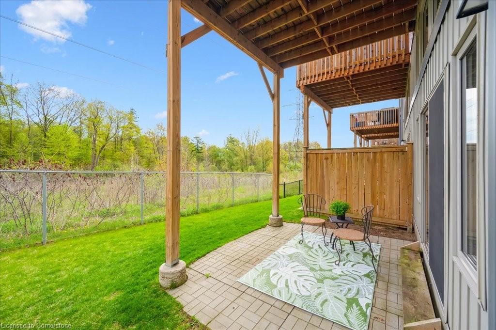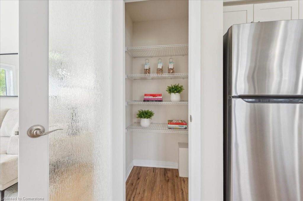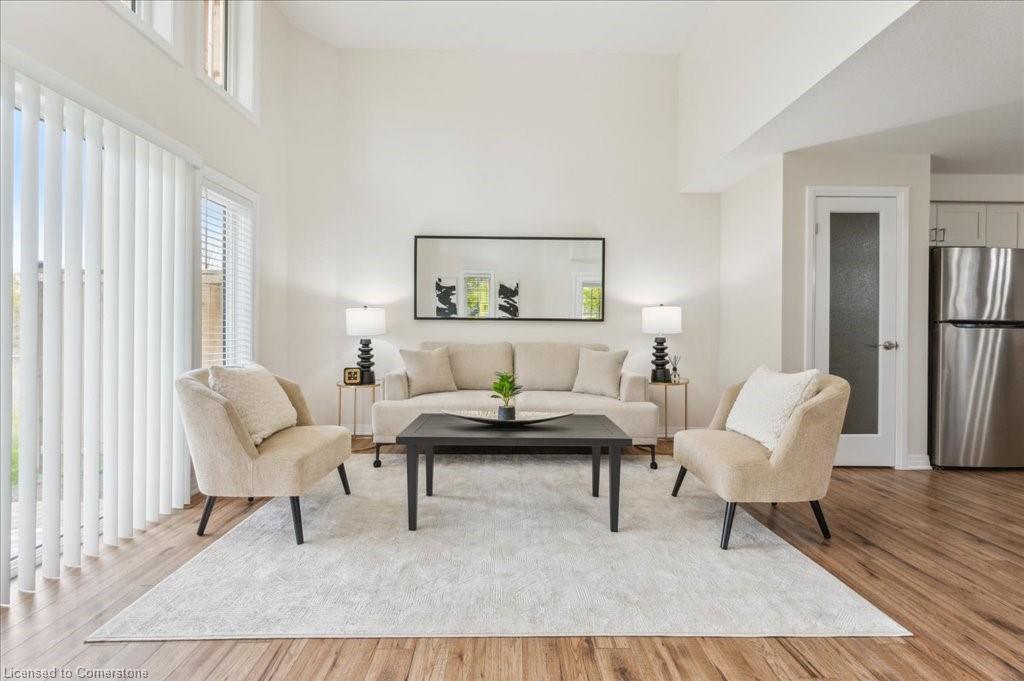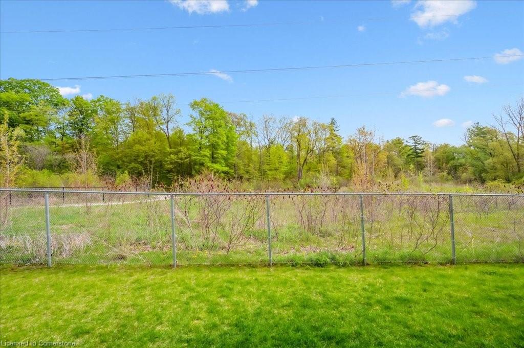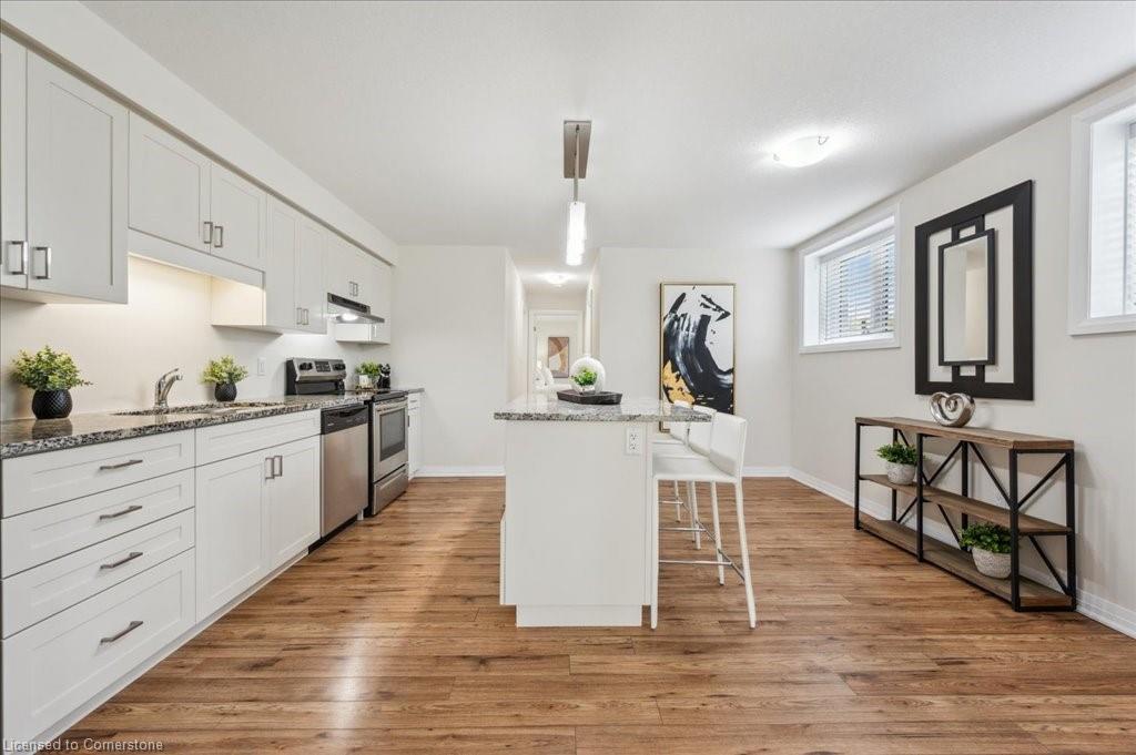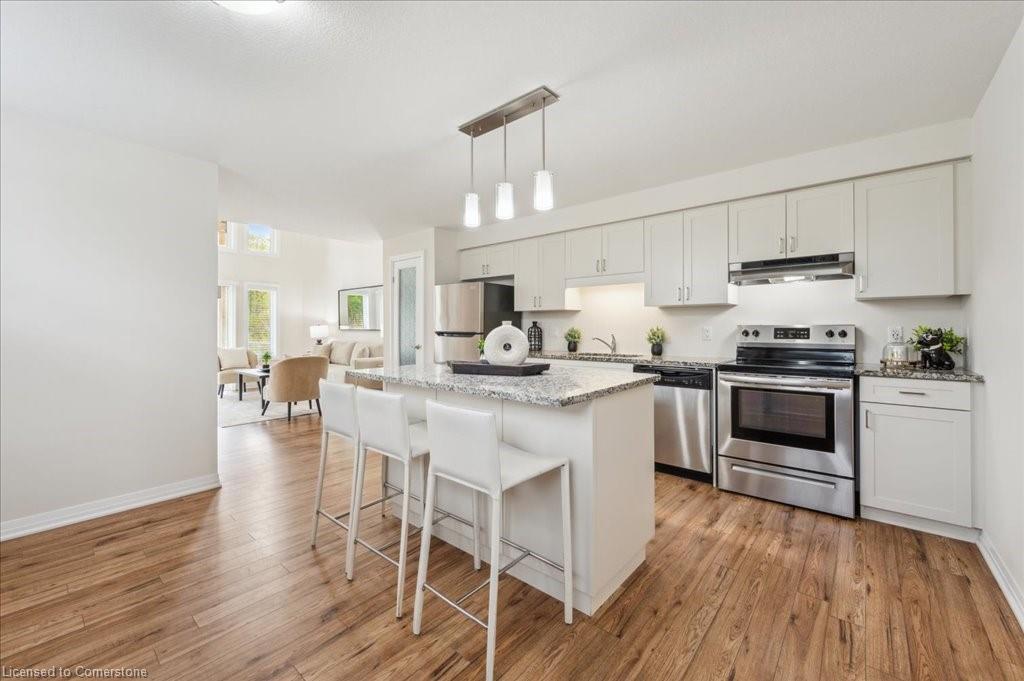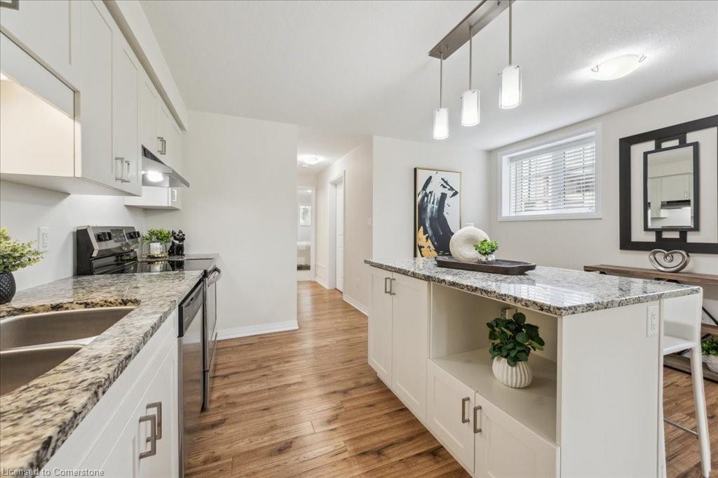 WOW! A Gorgeous luxury Condo located minutes from Hwy 401. This Bright and Airy 1 Bedroom 1 bath unit backs on Greenbelt. Private entry to your home, coat closet at the front door flows into the large great-room with 12 foot high ceilings! Wall to ceiling windows and patio doors overlooking the greenbelt. Enjoy nature and this beautiful view from your great room, kitchen or on your private patio. Custom Kitchen with beautiful painted cabinetry, a kitchen island with built in Microwave shelf, Granite counters and all stainless steel appliances (Fridge/Stove/Dishwasher) Quality & durable laminate floor throughout the main living area, ceramic in the entrance and bathroom. In-suite laundry, with a front load stacked Washer and Dryer. Primary bedroom includes a large walk in closet. All Window coverings included. Central Air included. Unit built with Core Slab Concrete ceilings for added noise separation. 1 parking spot + ample of visitor parking through out the complex. Access to walking trails, parks and more. Fresh Paint (April 2025), New Carpet (Feb 2025) Don't miss this fantastic rare opportunity!