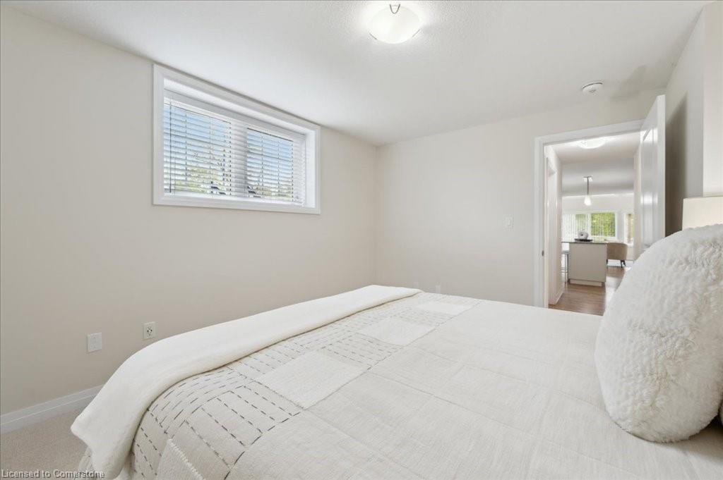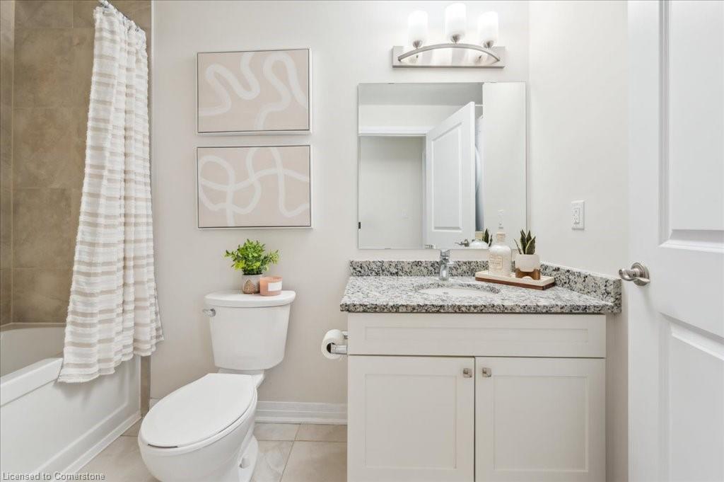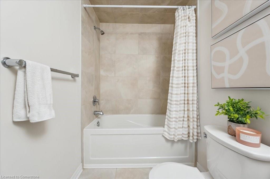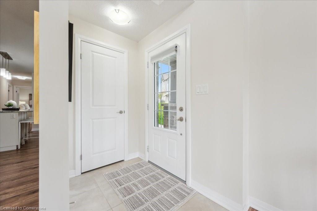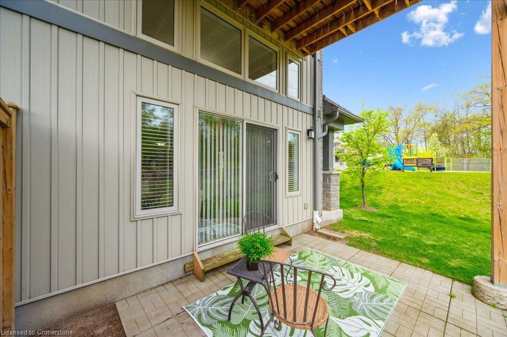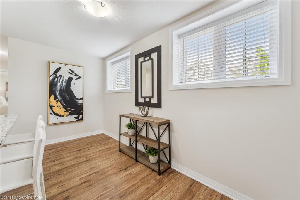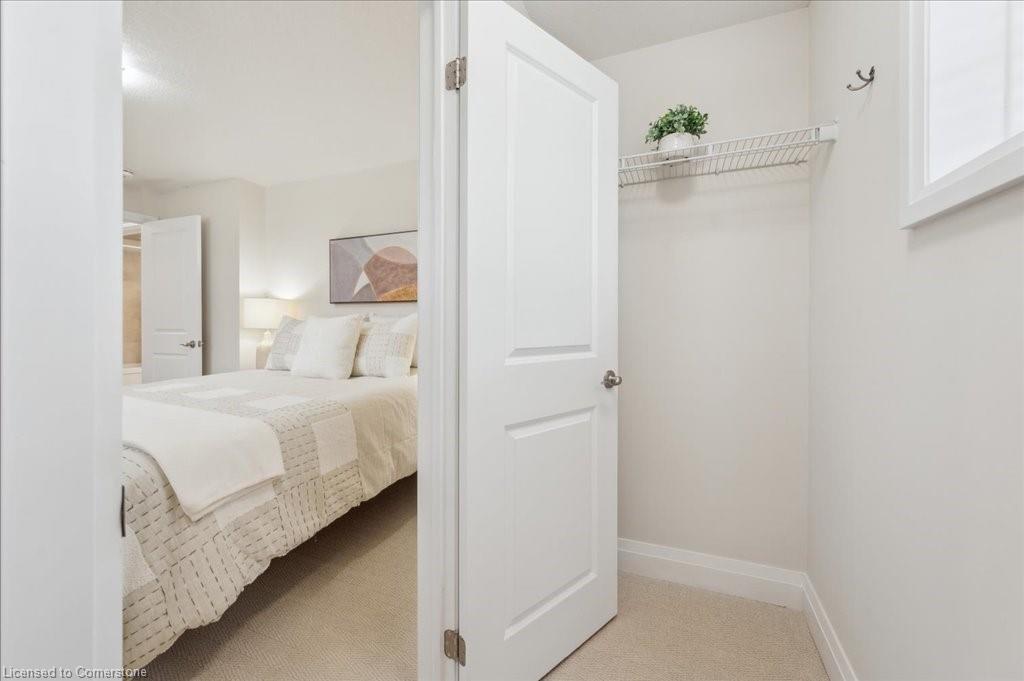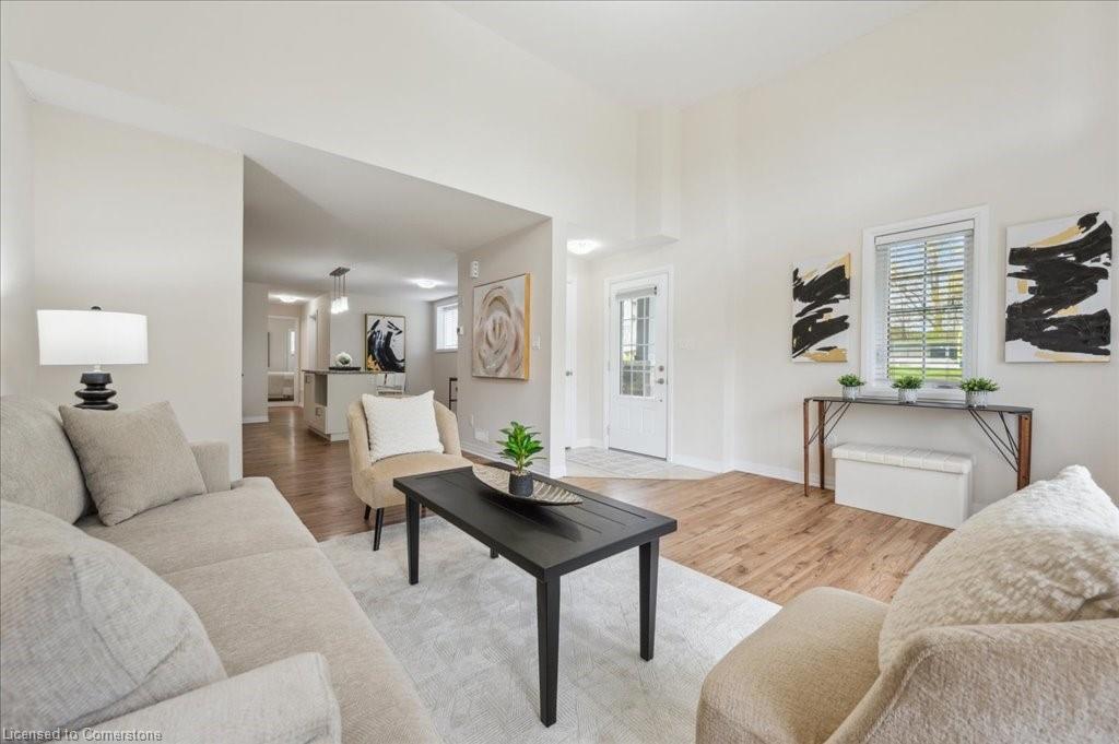 WOW! A Gorgeous luxury Condo located minutes from Hwy 401. This Bright and Airy 1 Bedroom 1 bath unit backs on Greenbelt. Private entry to your home, coat closet at the front door flows into the large great-room with 12 foot high ceilings! Wall to ceiling windows and patio doors overlooking the greenbelt. Enjoy nature and this beautiful view from your great room, kitchen or on your private patio. Custom Kitchen with beautiful painted cabinetry, a kitchen island with built in Microwave shelf, Granite counters and all stainless steel appliances (Fridge/Stove/Dishwasher) Quality & durable laminate floor throughout the main living area, ceramic in the entrance and bathroom. In-suite laundry, with a front load stacked Washer and Dryer. Primary bedroom includes a large walk in closet. All Window coverings included. Central Air included. Unit built with Core Slab Concrete ceilings for added noise separation. 1 parking spot + ample of visitor parking through out the complex. Access to walking trails, parks and more. Fresh Paint (April 2025), New Carpet (Feb 2025) Don't miss this fantastic rare opportunity!
