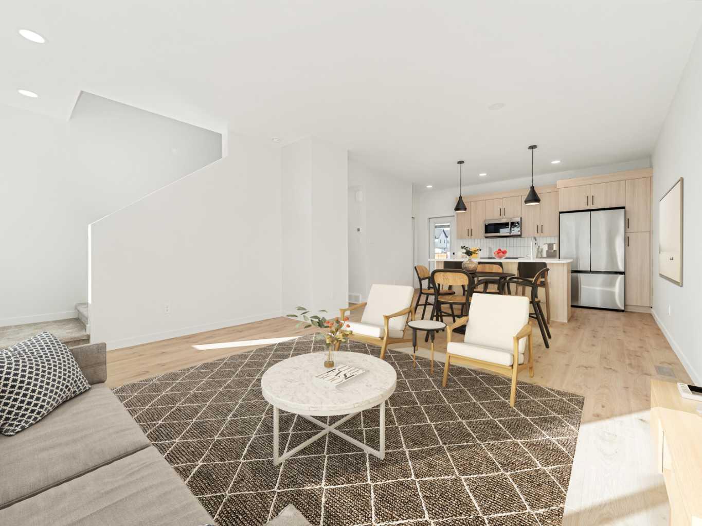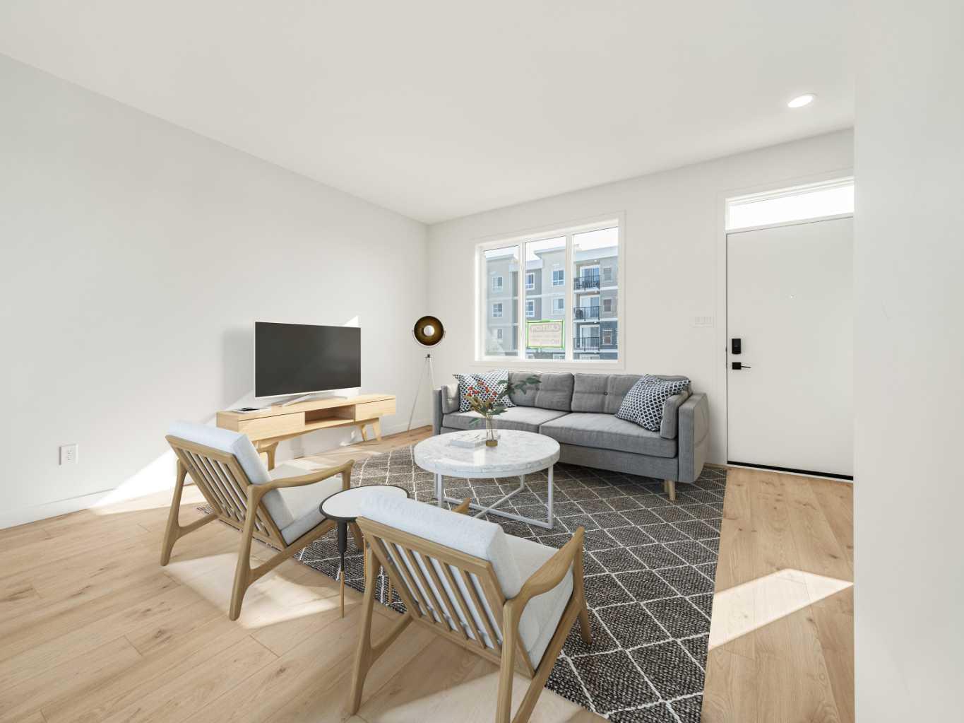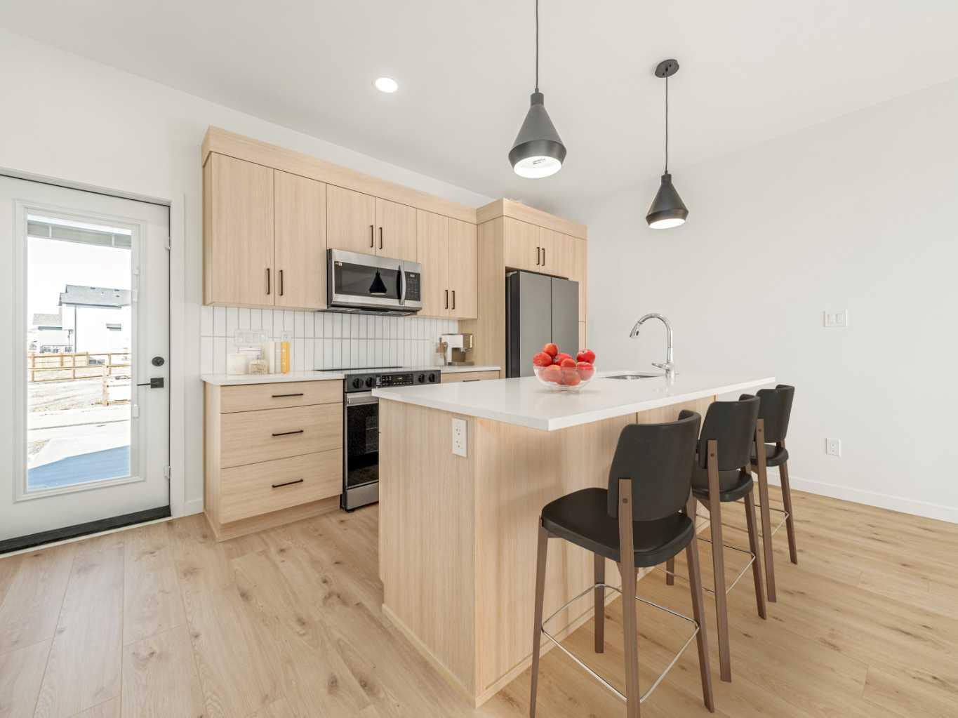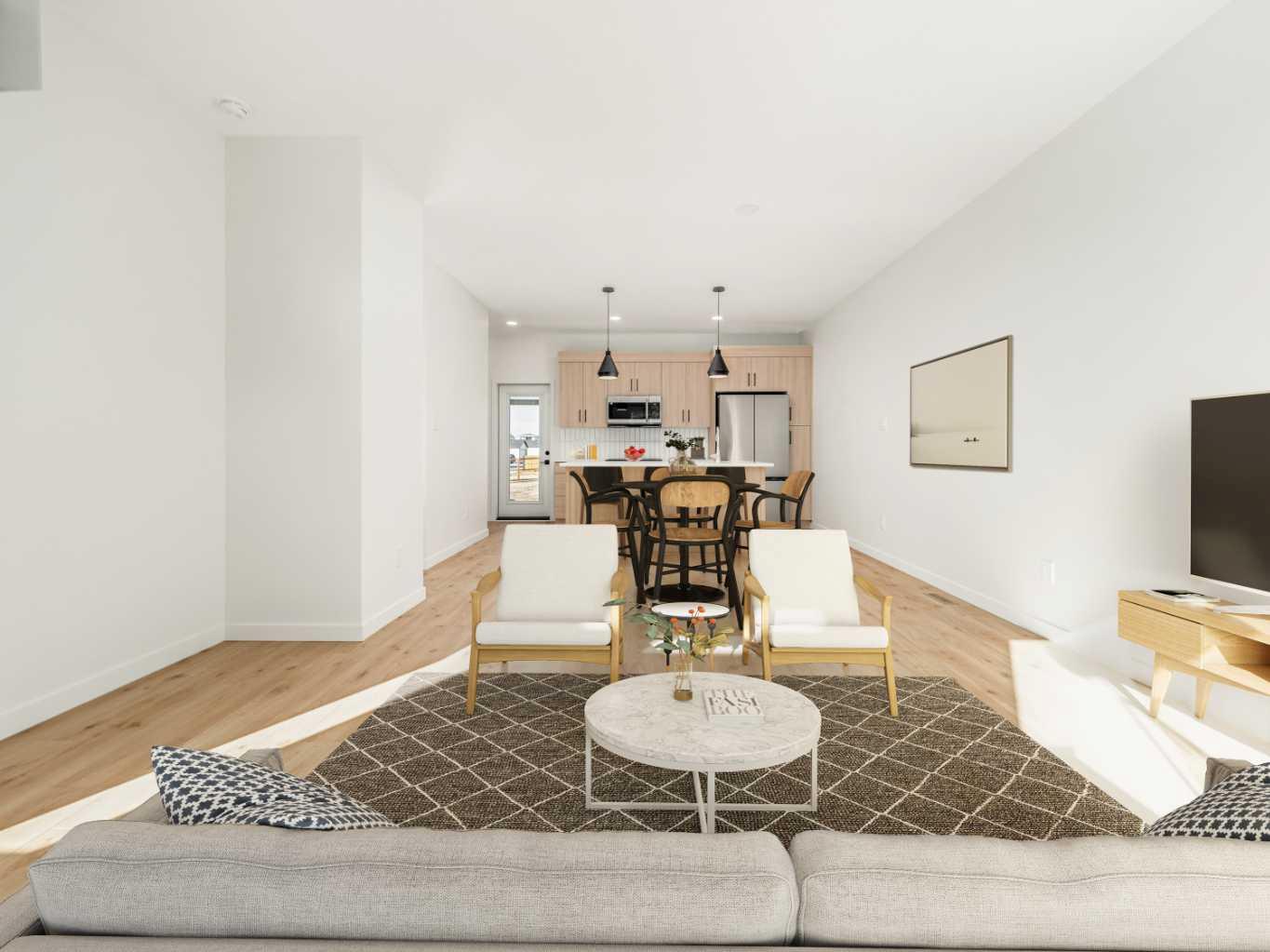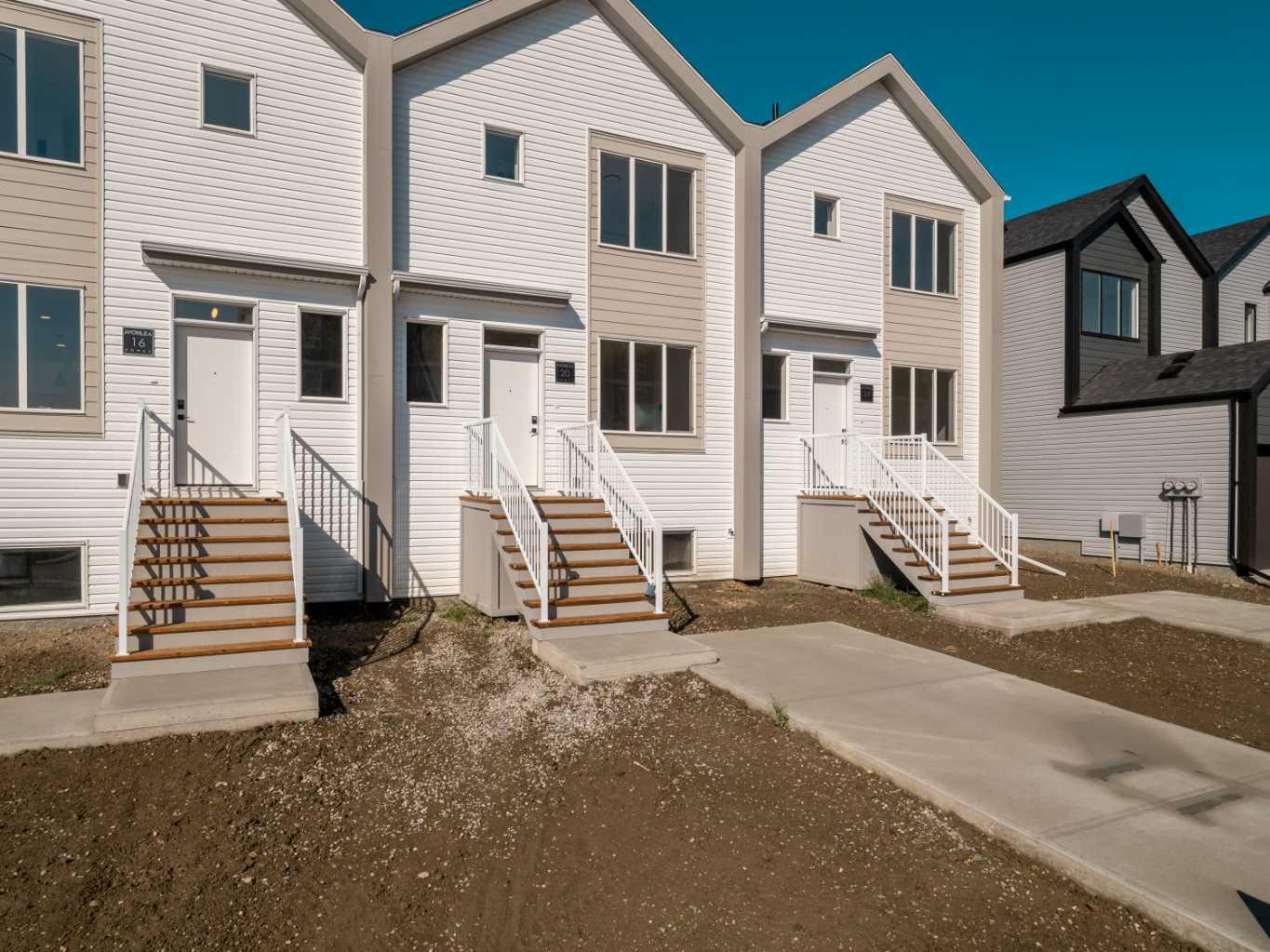 The "Leo" By Avonlea Homes. Super modern town homes located close to Legacy Park. Wide open floor plans, High (painted)ceilings on the main floor, no more Texture. Quartz counter tops, tiled floors in all bathrooms, 3 bedrooms up with ensuite in the primary Bedroom. Convenience of laundry upstairs as well. Single parking pad in front double parking pad in back. Fully Landscaped and Fenced Back Yard included as well.This particular unit is the middle unit, end units are for sale as well at a different price point. Excellent location close to all the amenities the 73 ACRE Legacy Park has to offer. Home is virtually staged. New Home Warranty.