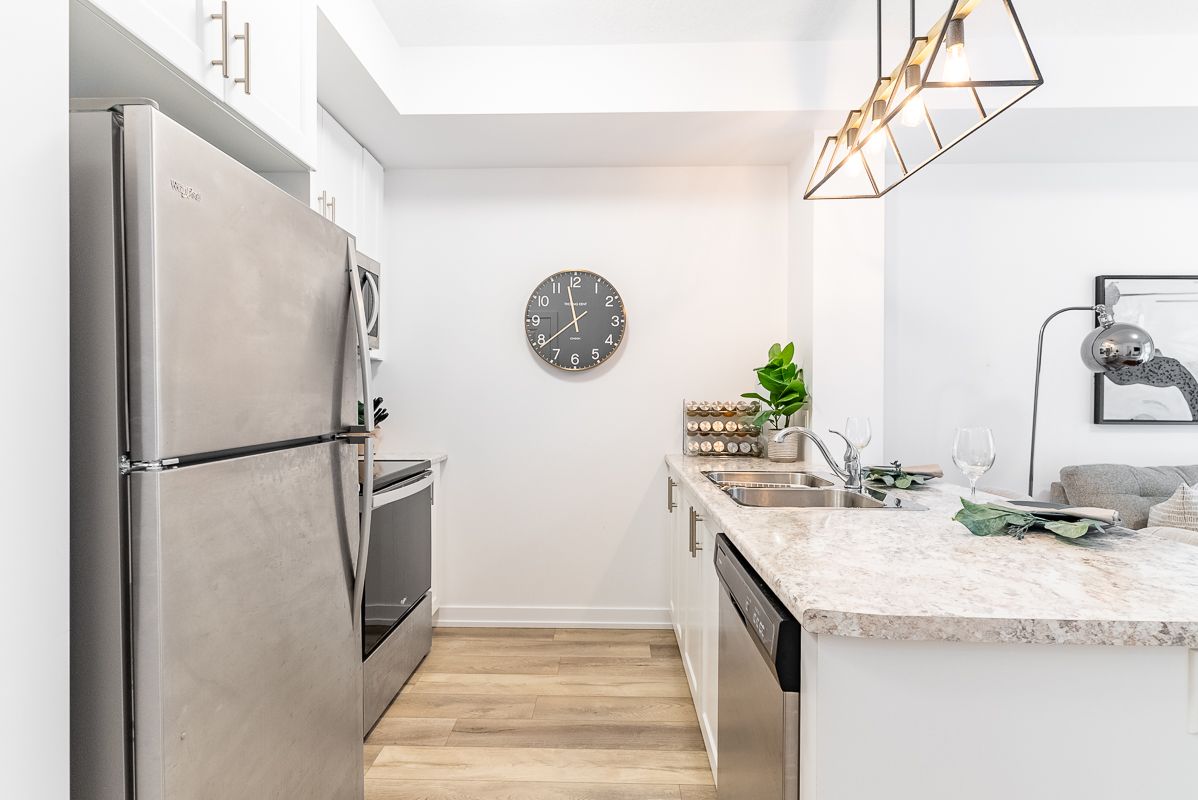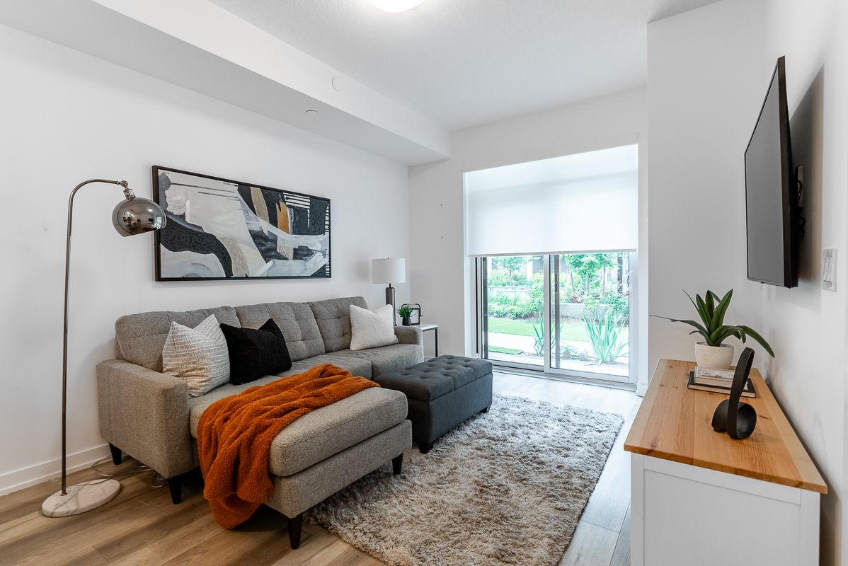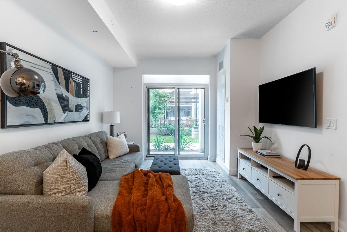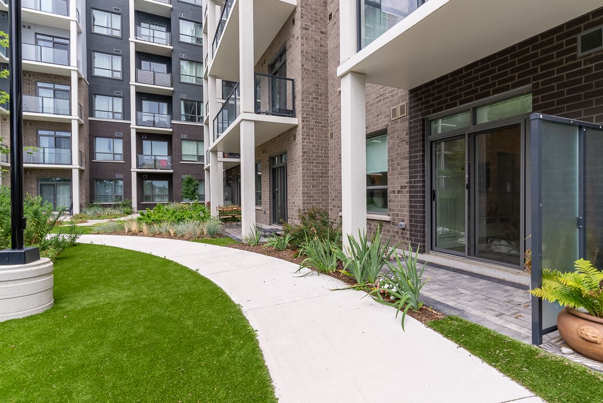 Presenting an exceptional opportunity to embrace urban living at its finest. This sophisticated 1-bedroom plus den condominium, strategically situated on the ground floor of a new building, seamlessly blends contemporary elegance with utmost convenience. This modern space seamlessly combines elegance with convenience. The open-concept living area is filled with natural light, and the den offers versatility as a home office or reading corner. The well-equipped kitchen boasts quality appliances and ample storage. Sliding doors lead to a private patio and courtyard. Additional perks include underground parking, storage, a fitness room, party area, rooftop patio, and indoor bike storage. Don't miss this exceptional offer!Interior Features: