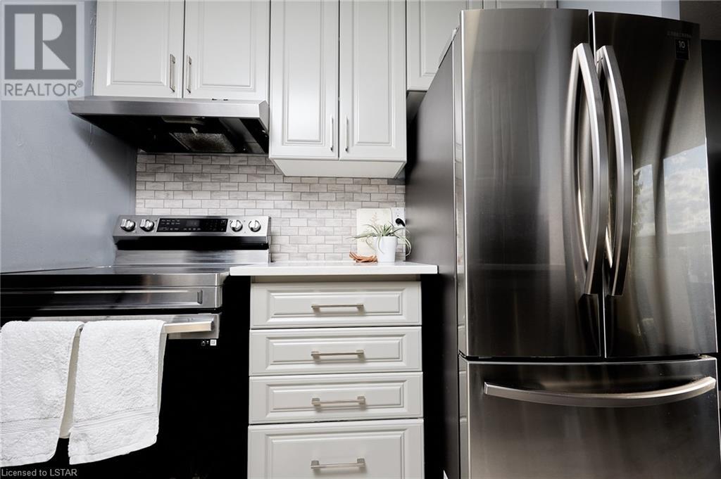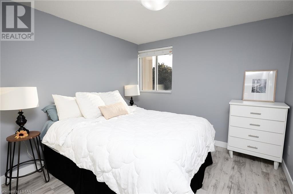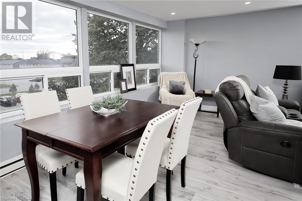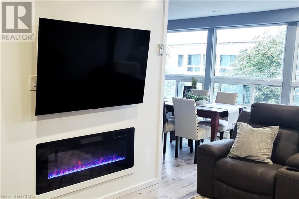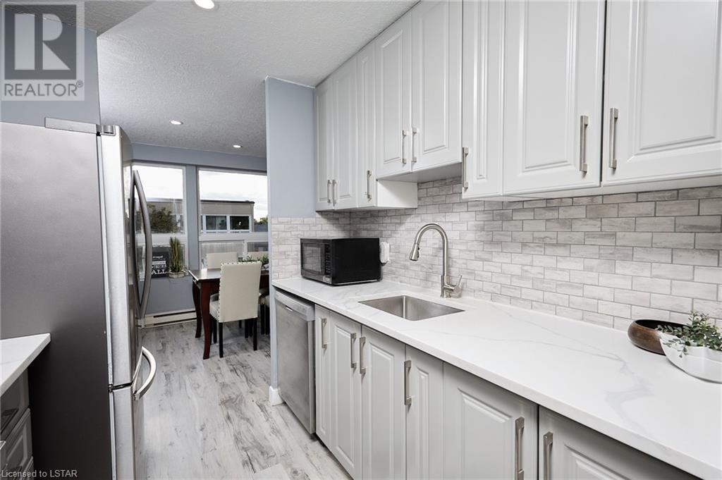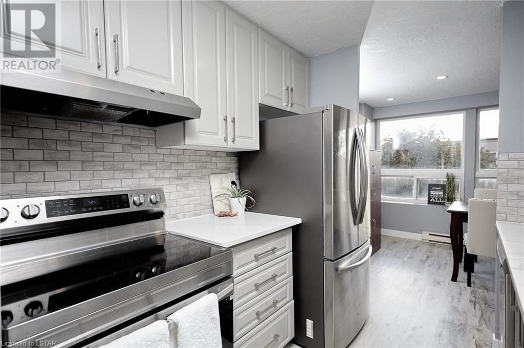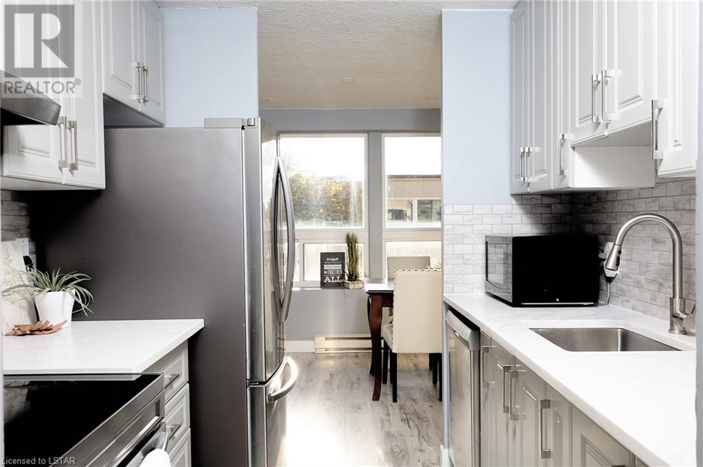 GORGEOUSLY RENOVATED WITH PRIVATE IN-SUITE LAUNDRY. This bright 2 bedroom, 1 bath, top floor end unit is move in ready. Very quiet building and this unit enjoys even more peace with only 1 side neighbor and no one above them. Beautifully updated home features rare in-suite laundry, 1 type of plank flooring throughout unit (carpet free), great closet spaces, newer appliances, updated bathroom with glassed in tile shower and lovely natural light. Incredibly-sized living room impressive fireplace wall and pot lighting connects to the open concept dining area right off the well-appointed kitchen with gorgeous quartz countertops, tumbled backsplash and modern grey classic cabinetry. Clean, safe and cared for building with controlled entry and ample parking. Conveniently located near public transit, schools (including Fanshawe College), shopping and restaurants. (id:22211)