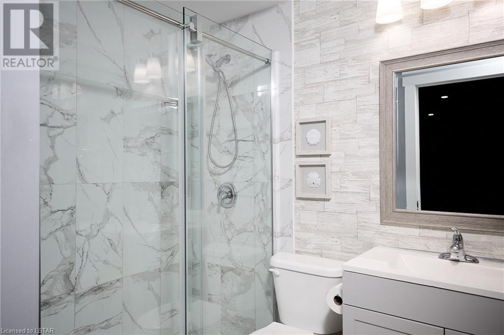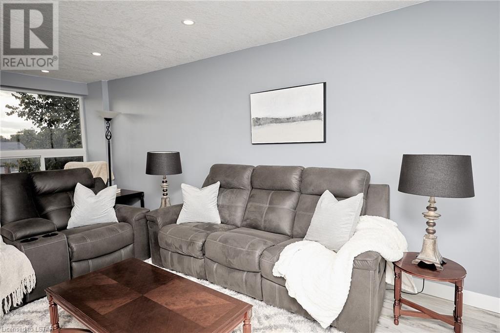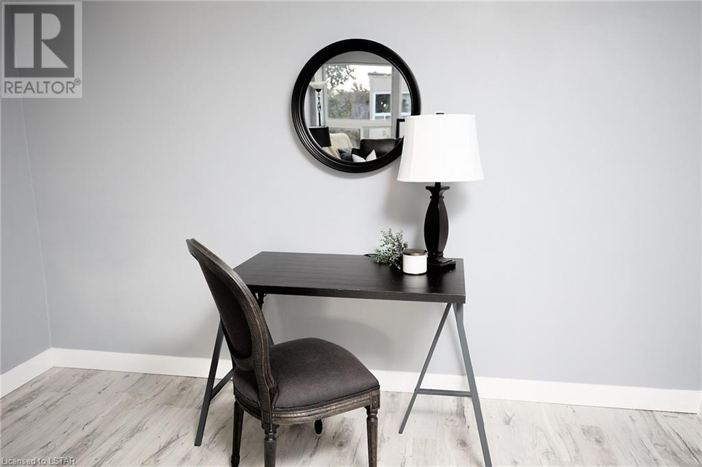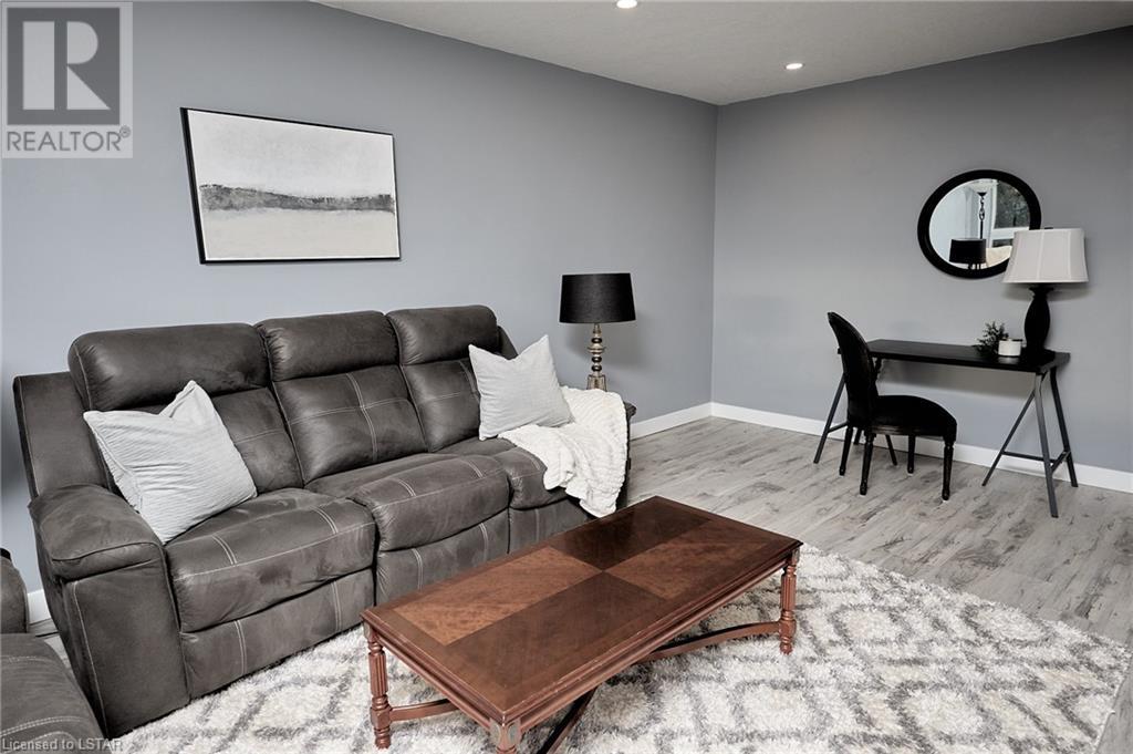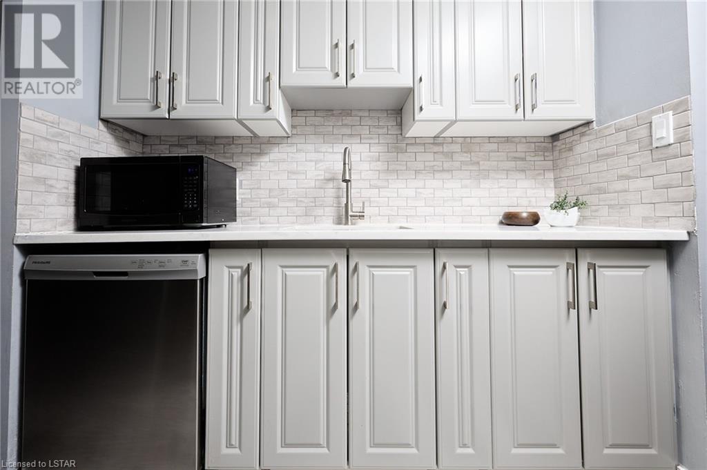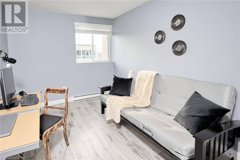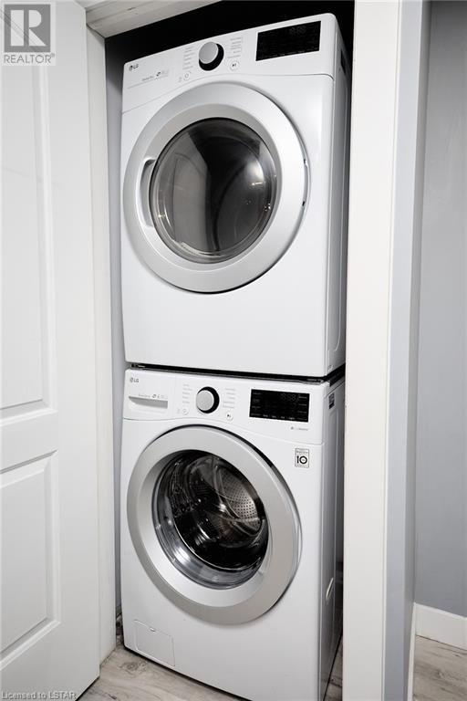 GORGEOUSLY RENOVATED WITH PRIVATE IN-SUITE LAUNDRY. This bright 2 bedroom, 1 bath, top floor end unit is move in ready. Very quiet building and this unit enjoys even more peace with only 1 side neighbor and no one above them. Beautifully updated home features rare in-suite laundry, 1 type of plank flooring throughout unit (carpet free), great closet spaces, newer appliances, updated bathroom with glassed in tile shower and lovely natural light. Incredibly-sized living room impressive fireplace wall and pot lighting connects to the open concept dining area right off the well-appointed kitchen with gorgeous quartz countertops, tumbled backsplash and modern grey classic cabinetry. Clean, safe and cared for building with controlled entry and ample parking. Conveniently located near public transit, schools (including Fanshawe College), shopping and restaurants. (id:22211)