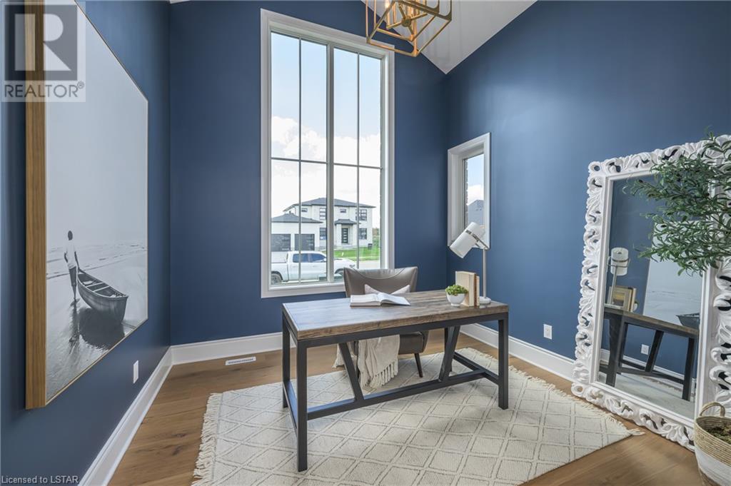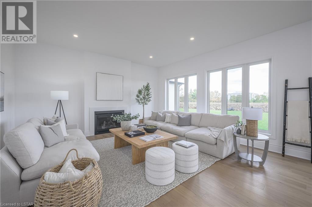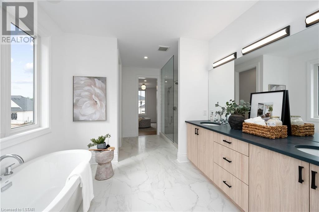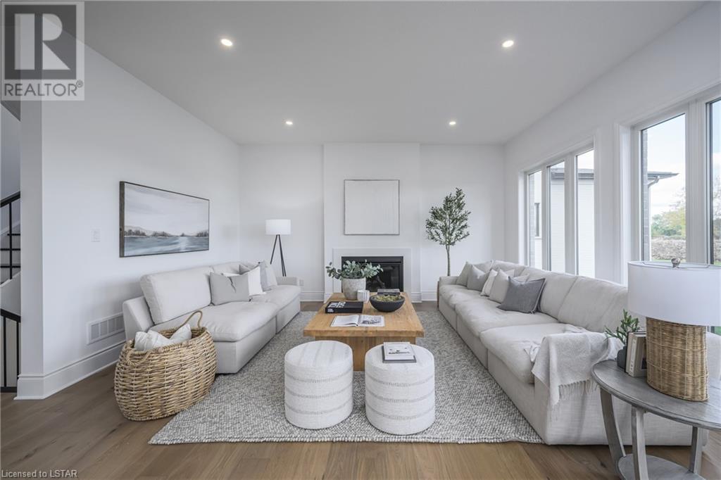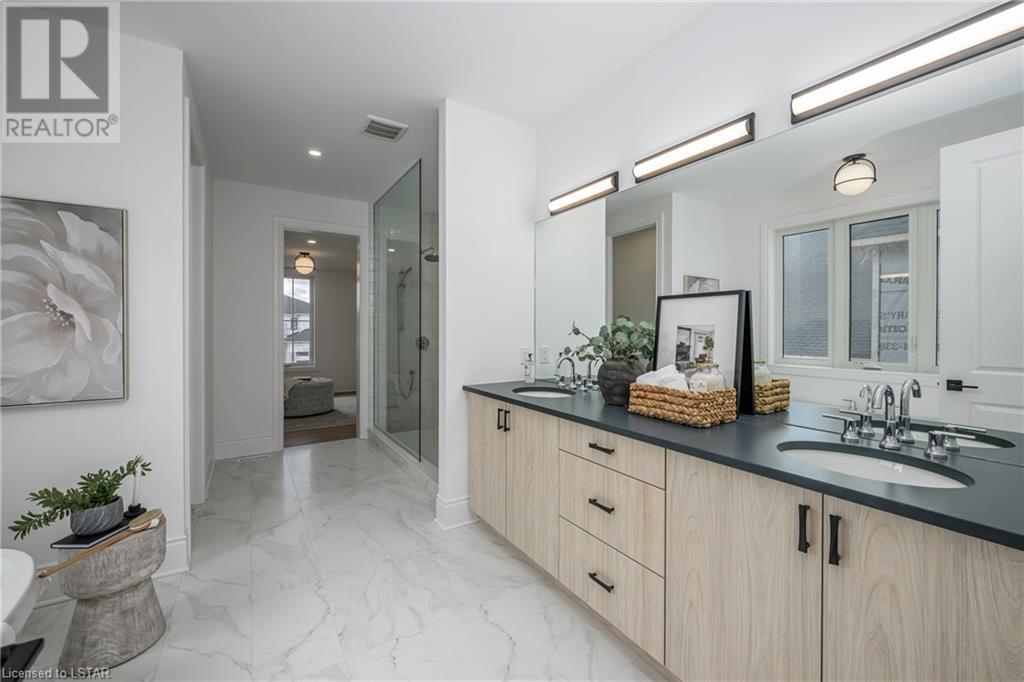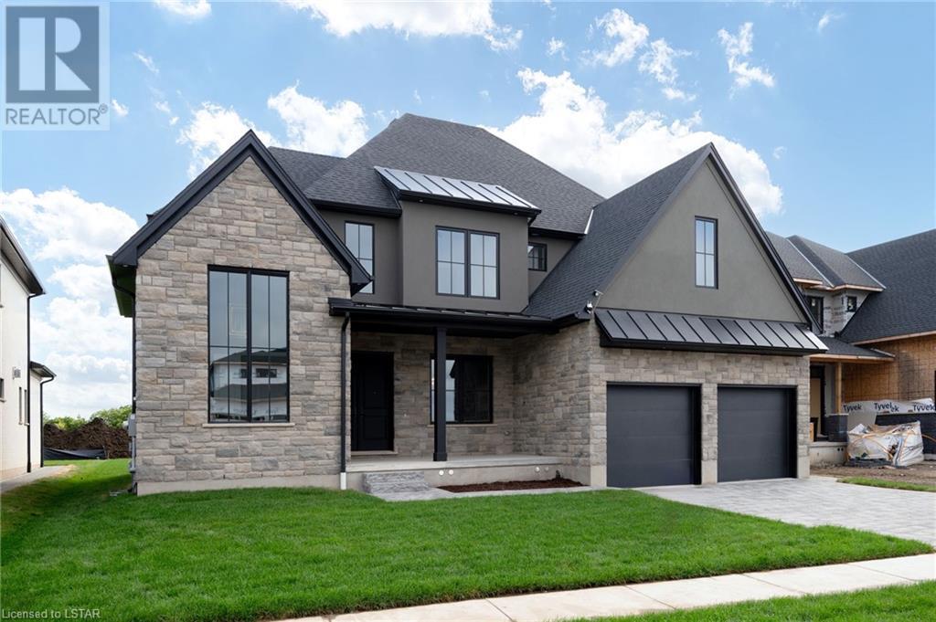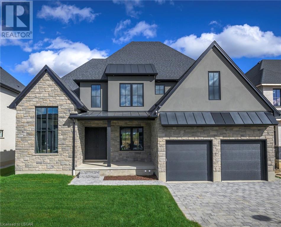Impressive curb appeal w/ a combination of stone, graphite-tone stucco, black frame windows & standing-seam metal roof detailing. This 5-bedroom, 5-bathroom Westhaven Homes beauty offers a spacious, open-concept plan + finished basement for a total of ~4000 sq. ft of living in Sunningdale Court–North London’s executive lifestyle enclave. 10 ft ceilings & gorgeous windows draw natural light through the living spaces & across the White Oak floors. Great room combines a culinary haven w/ multiple gathering spaces. Outstanding kitchen design features extensive lower cabinetry/drawers in soft black tones w/gold detailing & crisp white uppers including mullioned glass display cabinets & extensive quartz surfaces. An arched entry into the Butler’s pantry extends serving & storage. Double islands, seating 10, open onto an inviting living room w/ 46 inch gas fireplace & large windows. 8 ft patio doors open onto covered back deck. Servery, just steps from dining room, creates impact w/ ceiling-height emerald-green artisan tile. Private main floor office w/ 13 ft cathedral ceiling. Locker-style millwork in the mudroom .Solid wood staircase ascends the 2nd floor where White Oak continues through the hallway & into the spacious primary suite. Primary ensuite displays blonde birch-style Scandinavian cabinetry w/ “soapstone” quartz counters, oversized glass shower w/ full tile surround/floor & niche, separate water closet & free-standing tub. Crossing the heated floors of the ensuite you arrive at a huge dressing room w/ natural light. Bedroom 2 enjoys a private 3-piece ensuite. 3rd & 4th bedrooms share a 5-piece ensuite w/ separated tub/toilet for convenience. Upper level laundry & 9 ft ceilings. Fully finished lower level adds large rec room/media room, 5th bedrooms & a 4-piece cheater ensuite. Generous 2 car garage with height for lifts. 63 ft x 129 ft pool sized lot. Prime location walking distance to Sunningdale Golf & the serene trails of the Medway Valley Heritage Forest. (id:22211)