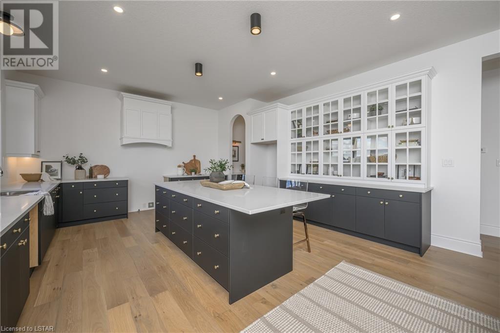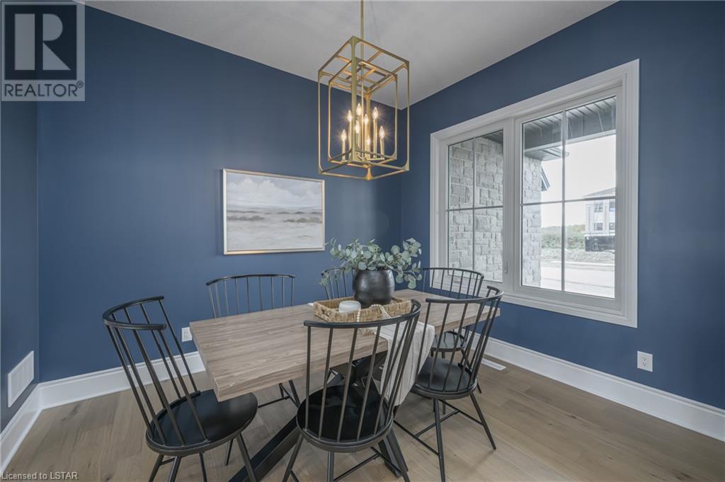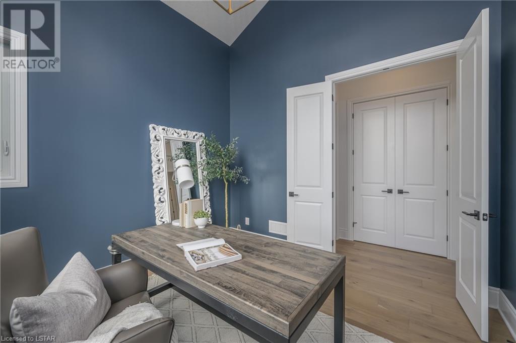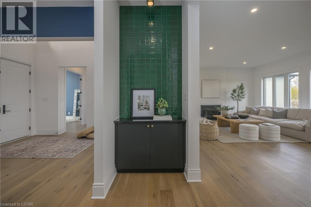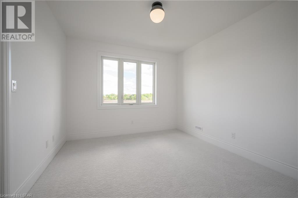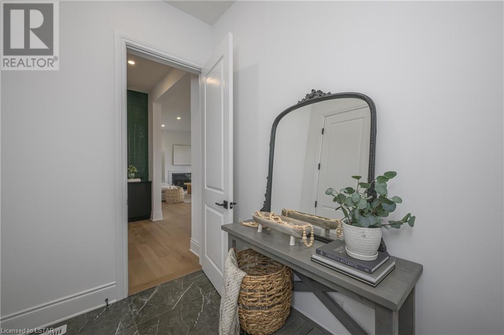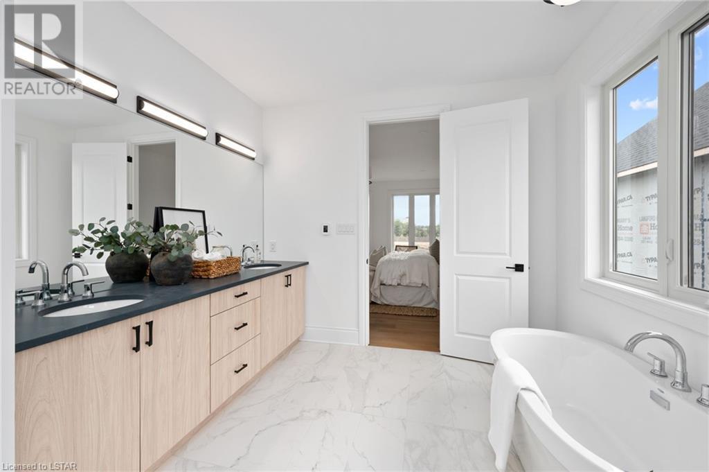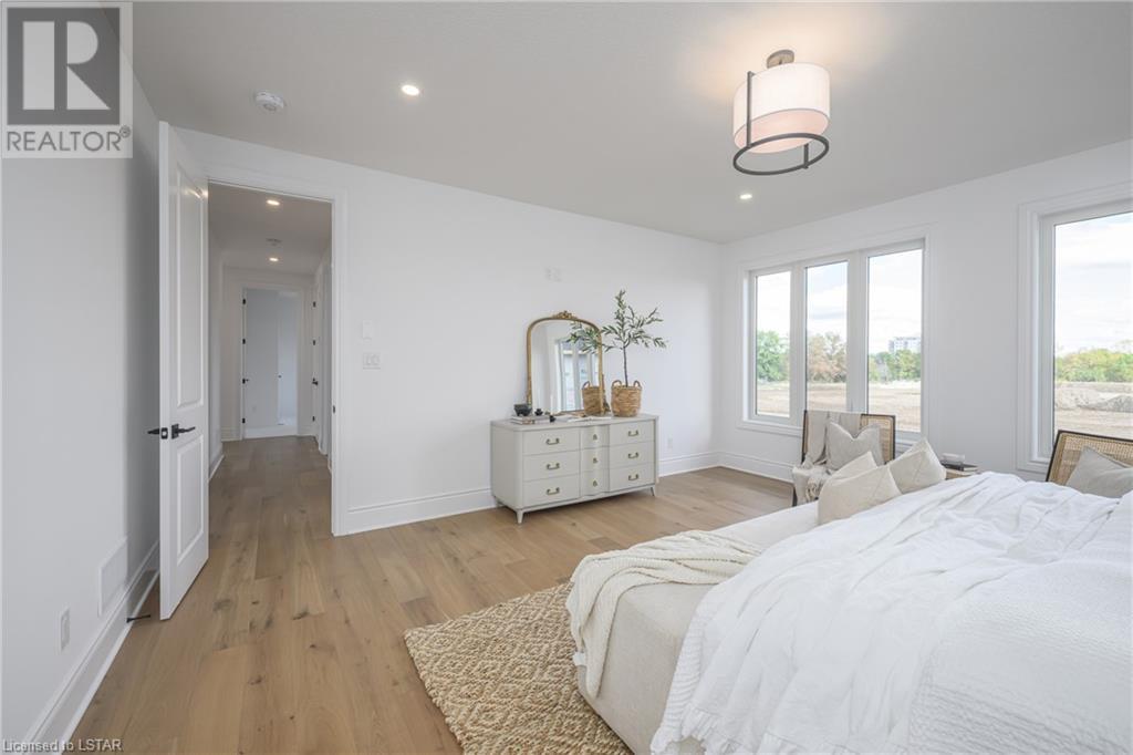 Impressive curb appeal w/ a combination of stone, graphite-tone stucco, black frame windows & standing-seam metal roof detailing. This 5-bedroom, 5-bathroom Westhaven Homes beauty offers a spacious, open-concept plan + finished basement for a total of ~4000 sq. ft of living in Sunningdale Court–North London’s executive lifestyle enclave. 10 ft ceilings & gorgeous windows draw natural light through the living spaces & across the White Oak floors. Great room combines a culinary haven w/ multiple gathering spaces. Outstanding kitchen design features extensive lower cabinetry/drawers in soft black tones w/gold detailing & crisp white uppers including mullioned glass display cabinets & extensive quartz surfaces. An arched entry into the Butler’s pantry extends serving & storage. Double islands, seating 10, open onto an inviting living room w/ 46 inch gas fireplace & large windows. 8 ft patio doors open onto covered back deck. Servery, just steps from dining room, creates impact w/ ceiling-height emerald-green artisan tile. Private main floor office w/ 13 ft cathedral ceiling. Locker-style millwork in the mudroom .Solid wood staircase ascends the 2nd floor where White Oak continues through the hallway & into the spacious primary suite. Primary ensuite displays blonde birch-style Scandinavian cabinetry w/ “soapstone” quartz counters, oversized glass shower w/ full tile surround/floor & niche, separate water closet & free-standing tub. Crossing the heated floors of the ensuite you arrive at a huge dressing room w/ natural light. Bedroom 2 enjoys a private 3-piece ensuite. 3rd & 4th bedrooms share a 5-piece ensuite w/ separated tub/toilet for convenience. Upper level laundry & 9 ft ceilings. Fully finished lower level adds large rec room/media room, 5th bedrooms & a 4-piece cheater ensuite. Generous 2 car garage with height for lifts. 63 ft x 129 ft pool sized lot. Prime location walking distance to Sunningdale Golf & the serene trails of the Medway Valley Heritage Forest. (id:22211)