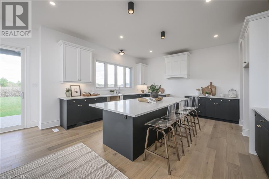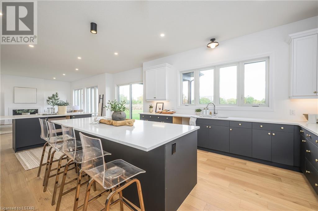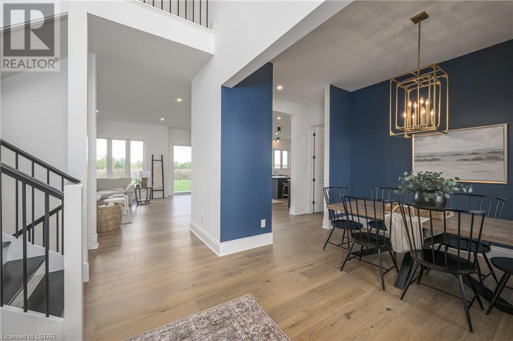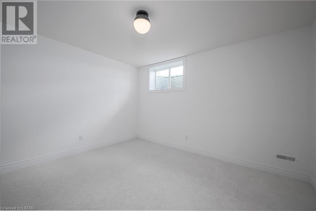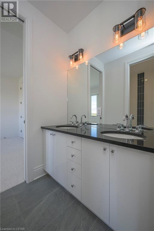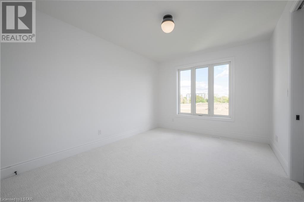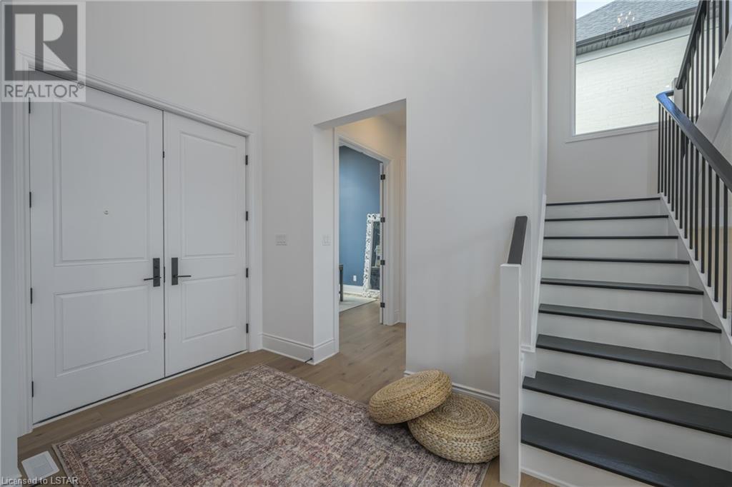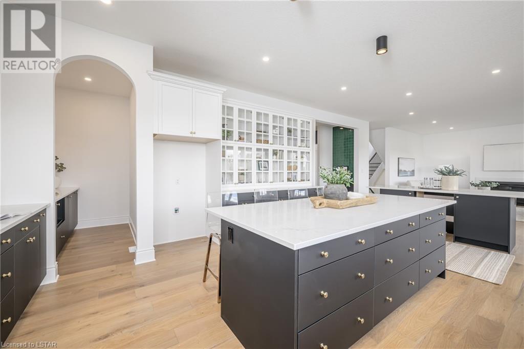 Impressive curb appeal w/ a combination of stone, graphite-tone stucco, black frame windows & standing-seam metal roof detailing. This 5-bedroom, 5-bathroom Westhaven Homes beauty offers a spacious, open-concept plan + finished basement for a total of ~4000 sq. ft of living in Sunningdale Court–North London’s executive lifestyle enclave. 10 ft ceilings & gorgeous windows draw natural light through the living spaces & across the White Oak floors. Great room combines a culinary haven w/ multiple gathering spaces. Outstanding kitchen design features extensive lower cabinetry/drawers in soft black tones w/gold detailing & crisp white uppers including mullioned glass display cabinets & extensive quartz surfaces. An arched entry into the Butler’s pantry extends serving & storage. Double islands, seating 10, open onto an inviting living room w/ 46 inch gas fireplace & large windows. 8 ft patio doors open onto covered back deck. Servery, just steps from dining room, creates impact w/ ceiling-height emerald-green artisan tile. Private main floor office w/ 13 ft cathedral ceiling. Locker-style millwork in the mudroom .Solid wood staircase ascends the 2nd floor where White Oak continues through the hallway & into the spacious primary suite. Primary ensuite displays blonde birch-style Scandinavian cabinetry w/ “soapstone” quartz counters, oversized glass shower w/ full tile surround/floor & niche, separate water closet & free-standing tub. Crossing the heated floors of the ensuite you arrive at a huge dressing room w/ natural light. Bedroom 2 enjoys a private 3-piece ensuite. 3rd & 4th bedrooms share a 5-piece ensuite w/ separated tub/toilet for convenience. Upper level laundry & 9 ft ceilings. Fully finished lower level adds large rec room/media room, 5th bedrooms & a 4-piece cheater ensuite. Generous 2 car garage with height for lifts. 63 ft x 129 ft pool sized lot. Prime location walking distance to Sunningdale Golf & the serene trails of the Medway Valley Heritage Forest. (id:22211)