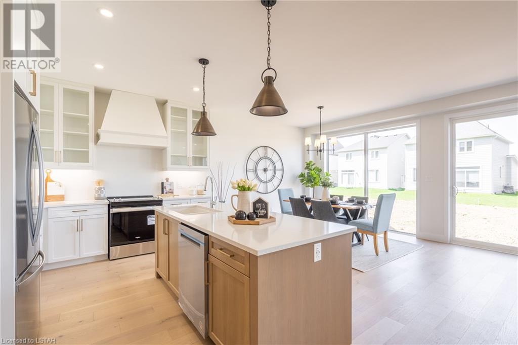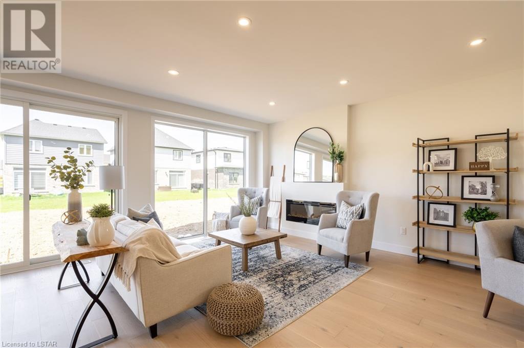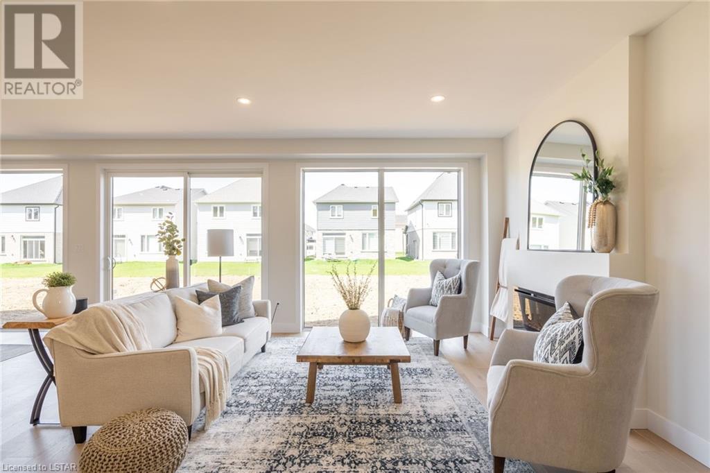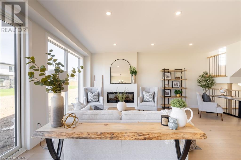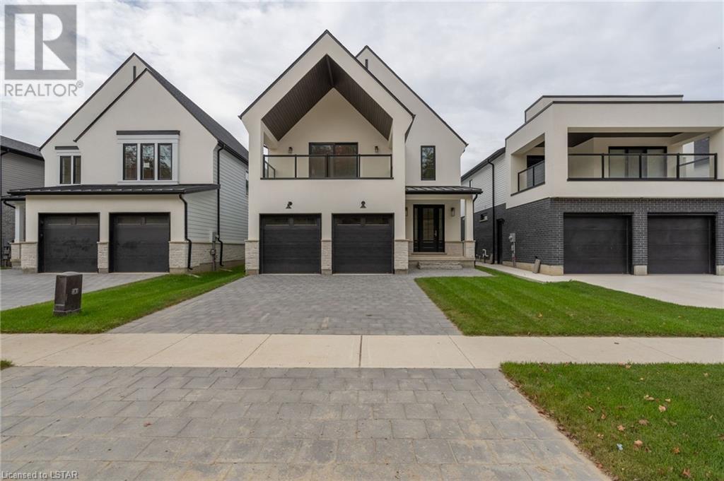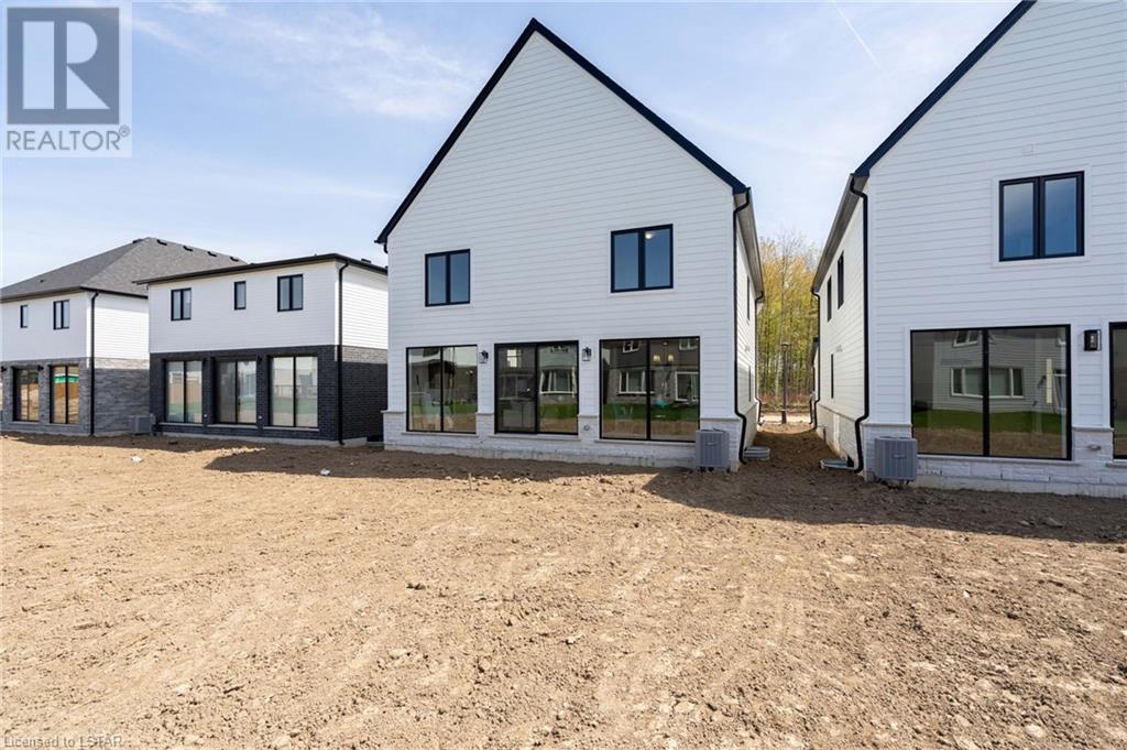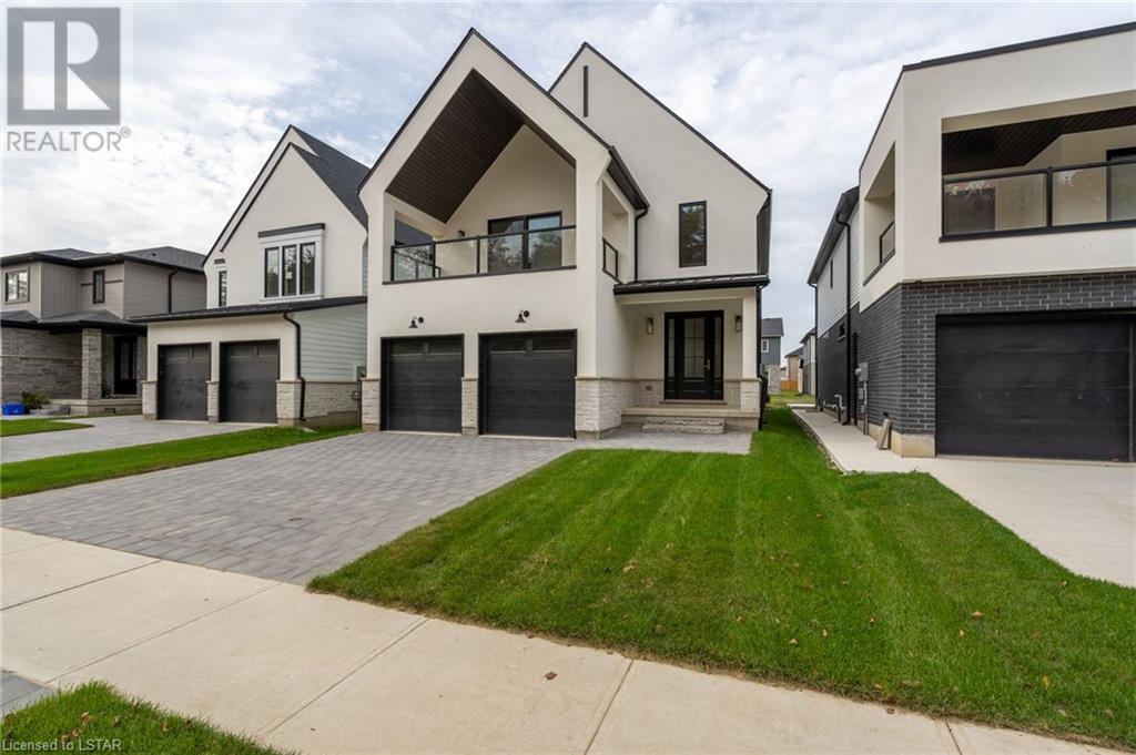 Rockmount Homes Arlington model. 2,480 square feet of beautifully finished living space and striking curb appeal! The exterior is accented with stone, stucco, black window frames and a steel roof over the front porch. Welcoming covered front porch and 8' entrance door. The spacious foyer leads to the open main level floor plan that's ideal for entertaining! 8’ doors throughout the main level. The large kitchen overlooks the dining area and features gorgeous custom cabinetry, huge island with breakfast bar and quartz counters. Generous great room with electric fireplace. Large floor to ceiling windows across the back of the house allow for lots of natural light. Enter from the garage to the spacious mudroom with ceramic tile flooring. Hardwood flooring throughout the balance of the main level. Good sized powder room with vanity and quartz counter. Beautiful wood staircase that’s open to the basement and upper level and is complete with metal spindles. The upper level has four large bedrooms. The principal bedroom has a vaulted ceiling and walk-in closet. Relax in the luxury ensuite featuring double sinks, quartz counter, tiled & glass shower and a soaker tub. Enjoy the view of the treed area from the spacious balcony complete with glass enclosure accessed from the primary bedroom. Convenient upper floor laundry that includes cabinetry and a sink. Custom vanity and quartz counter in the main bathroom. Located in desirable Fox Field Trails community in North London across from a permanent treed area. Easy access from Sunningdale Road. Close to all the great amenities that Hyde Park has to offer including schools, restaurants, shopping and parks. (id:22211)