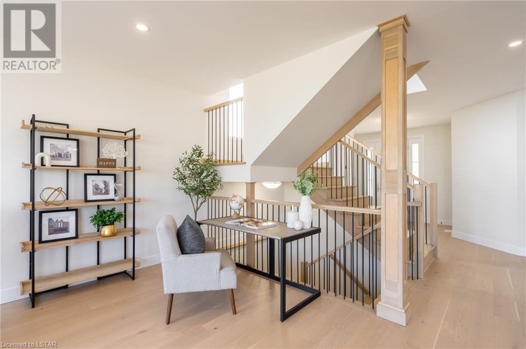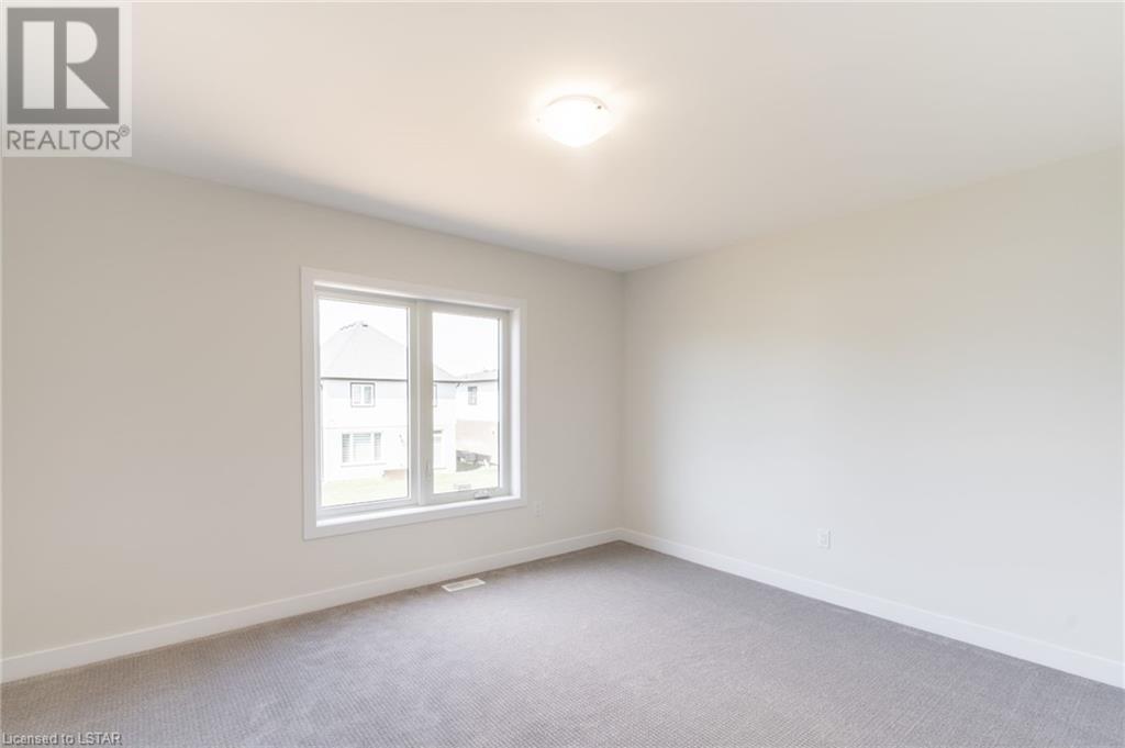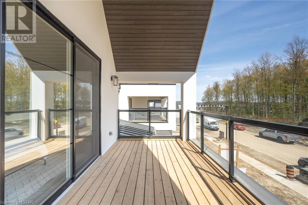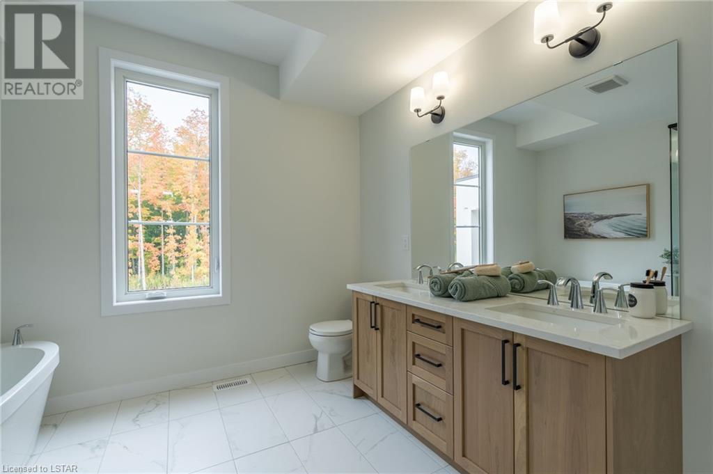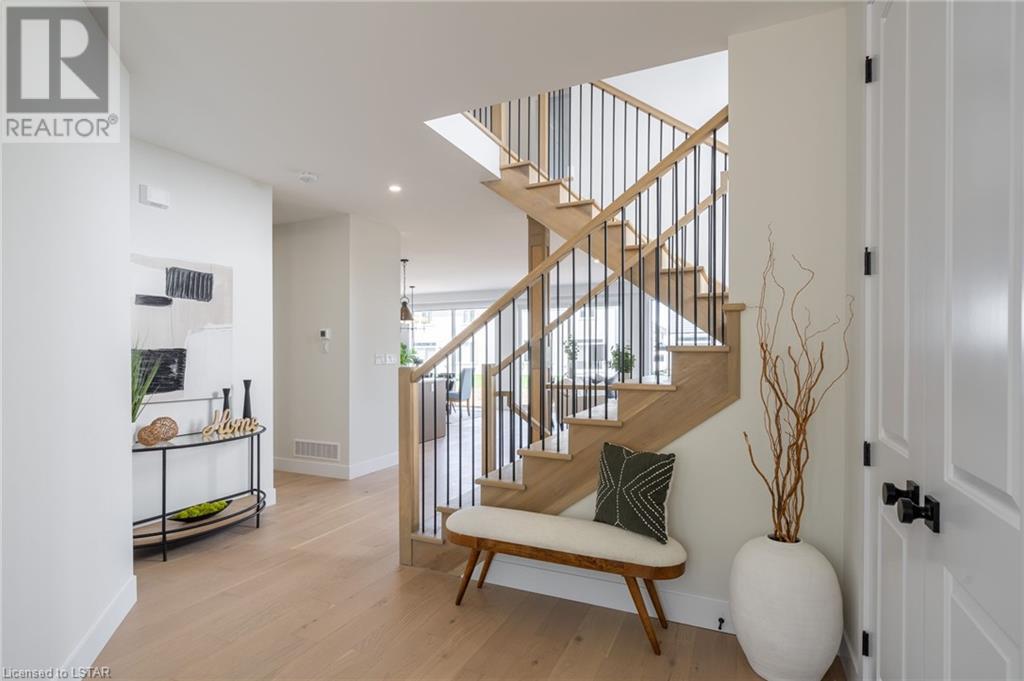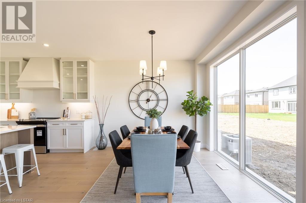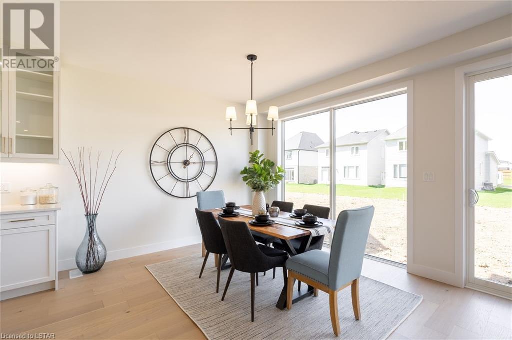 Rockmount Homes Arlington model. 2,480 square feet of beautifully finished living space and striking curb appeal! The exterior is accented with stone, stucco, black window frames and a steel roof over the front porch. Welcoming covered front porch and 8' entrance door. The spacious foyer leads to the open main level floor plan that's ideal for entertaining! 8’ doors throughout the main level. The large kitchen overlooks the dining area and features gorgeous custom cabinetry, huge island with breakfast bar and quartz counters. Generous great room with electric fireplace. Large floor to ceiling windows across the back of the house allow for lots of natural light. Enter from the garage to the spacious mudroom with ceramic tile flooring. Hardwood flooring throughout the balance of the main level. Good sized powder room with vanity and quartz counter. Beautiful wood staircase that’s open to the basement and upper level and is complete with metal spindles. The upper level has four large bedrooms. The principal bedroom has a vaulted ceiling and walk-in closet. Relax in the luxury ensuite featuring double sinks, quartz counter, tiled & glass shower and a soaker tub. Enjoy the view of the treed area from the spacious balcony complete with glass enclosure accessed from the primary bedroom. Convenient upper floor laundry that includes cabinetry and a sink. Custom vanity and quartz counter in the main bathroom. Located in desirable Fox Field Trails community in North London across from a permanent treed area. Easy access from Sunningdale Road. Close to all the great amenities that Hyde Park has to offer including schools, restaurants, shopping and parks. (id:22211)