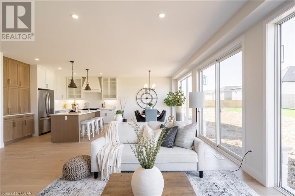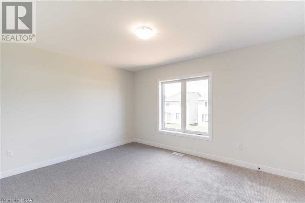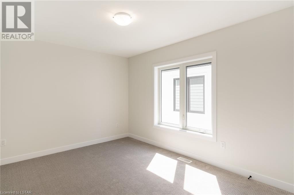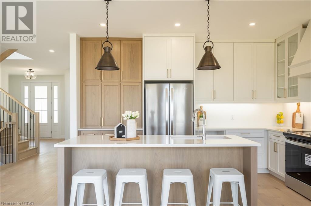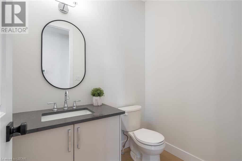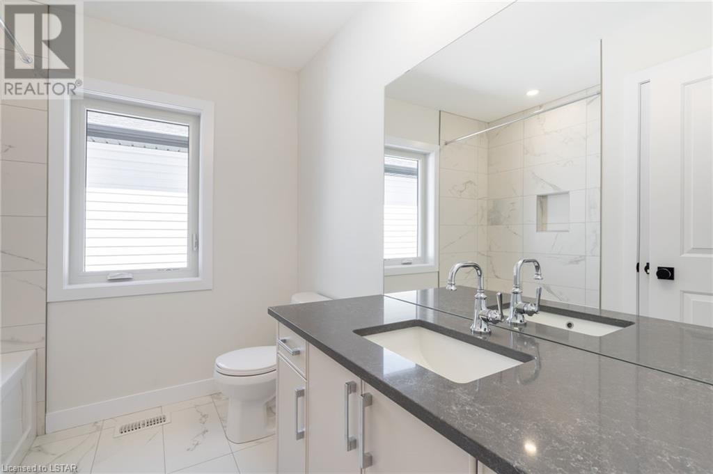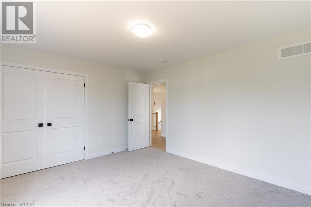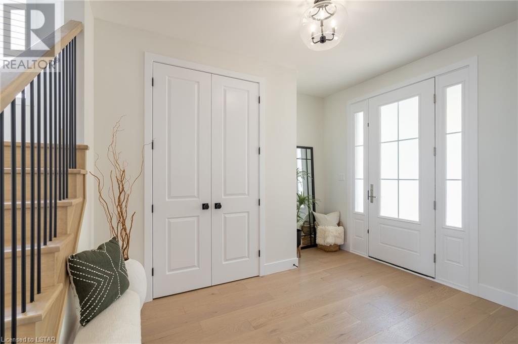 Rockmount Homes Arlington model. 2,480 square feet of beautifully finished living space and striking curb appeal! The exterior is accented with stone, stucco, black window frames and a steel roof over the front porch. Welcoming covered front porch and 8' entrance door. The spacious foyer leads to the open main level floor plan that's ideal for entertaining! 8’ doors throughout the main level. The large kitchen overlooks the dining area and features gorgeous custom cabinetry, huge island with breakfast bar and quartz counters. Generous great room with electric fireplace. Large floor to ceiling windows across the back of the house allow for lots of natural light. Enter from the garage to the spacious mudroom with ceramic tile flooring. Hardwood flooring throughout the balance of the main level. Good sized powder room with vanity and quartz counter. Beautiful wood staircase that’s open to the basement and upper level and is complete with metal spindles. The upper level has four large bedrooms. The principal bedroom has a vaulted ceiling and walk-in closet. Relax in the luxury ensuite featuring double sinks, quartz counter, tiled & glass shower and a soaker tub. Enjoy the view of the treed area from the spacious balcony complete with glass enclosure accessed from the primary bedroom. Convenient upper floor laundry that includes cabinetry and a sink. Custom vanity and quartz counter in the main bathroom. Located in desirable Fox Field Trails community in North London across from a permanent treed area. Easy access from Sunningdale Road. Close to all the great amenities that Hyde Park has to offer including schools, restaurants, shopping and parks. (id:22211)