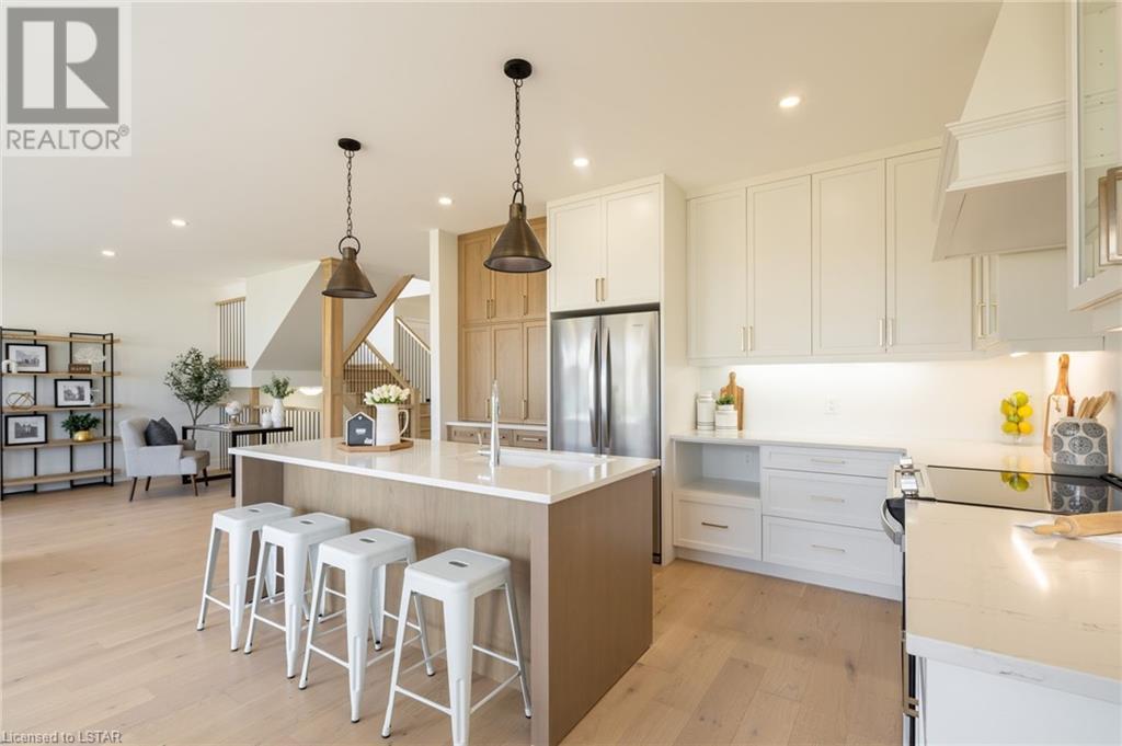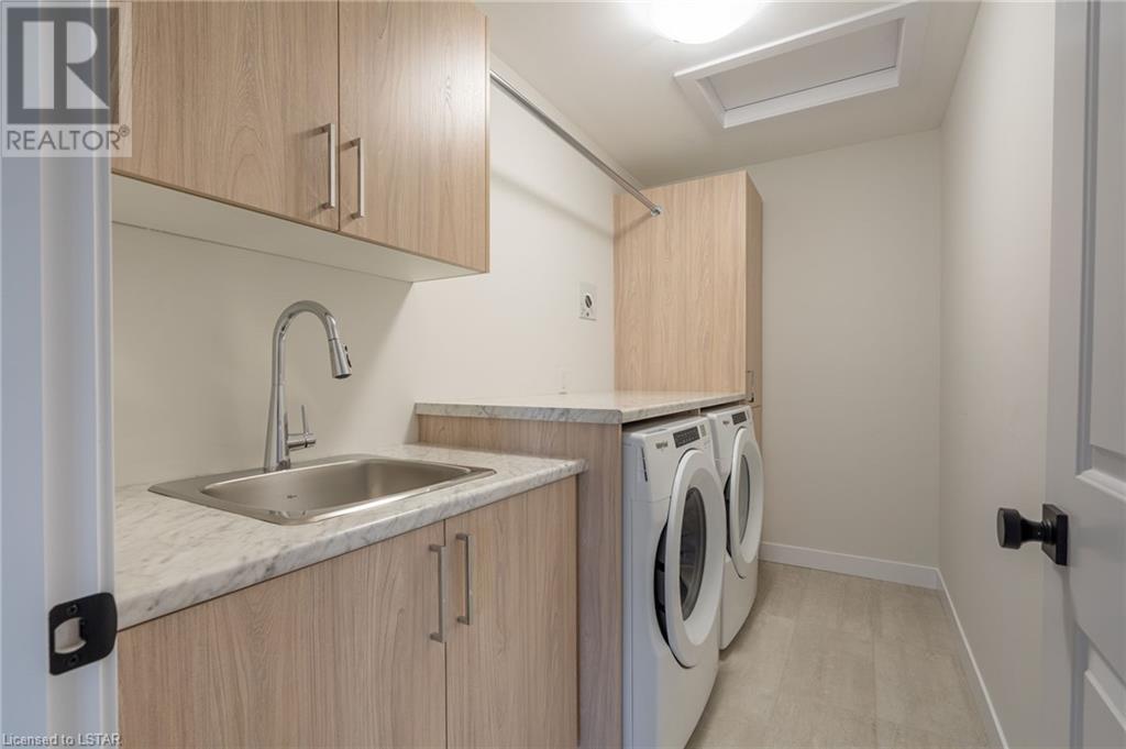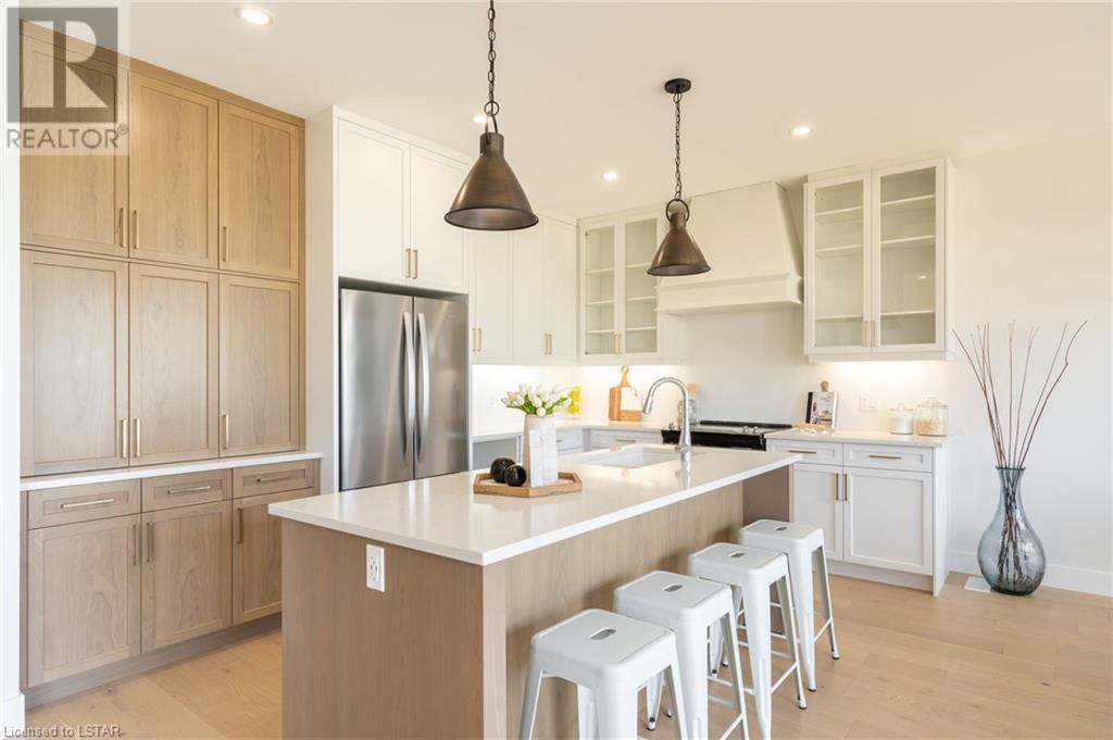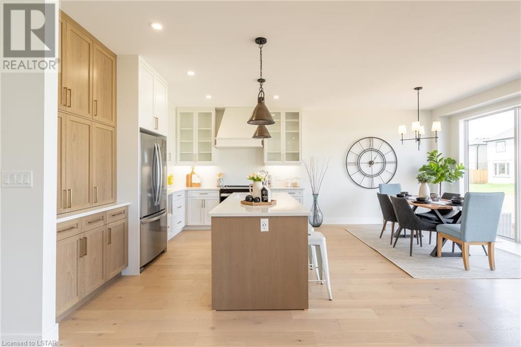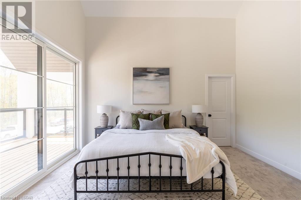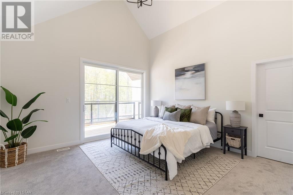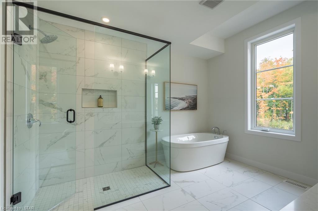 Rockmount Homes Arlington model. 2,480 square feet of beautifully finished living space and striking curb appeal! The exterior is accented with stone, stucco, black window frames and a steel roof over the front porch. Welcoming covered front porch and 8' entrance door. The spacious foyer leads to the open main level floor plan that's ideal for entertaining! 8’ doors throughout the main level. The large kitchen overlooks the dining area and features gorgeous custom cabinetry, huge island with breakfast bar and quartz counters. Generous great room with electric fireplace. Large floor to ceiling windows across the back of the house allow for lots of natural light. Enter from the garage to the spacious mudroom with ceramic tile flooring. Hardwood flooring throughout the balance of the main level. Good sized powder room with vanity and quartz counter. Beautiful wood staircase that’s open to the basement and upper level and is complete with metal spindles. The upper level has four large bedrooms. The principal bedroom has a vaulted ceiling and walk-in closet. Relax in the luxury ensuite featuring double sinks, quartz counter, tiled & glass shower and a soaker tub. Enjoy the view of the treed area from the spacious balcony complete with glass enclosure accessed from the primary bedroom. Convenient upper floor laundry that includes cabinetry and a sink. Custom vanity and quartz counter in the main bathroom. Located in desirable Fox Field Trails community in North London across from a permanent treed area. Easy access from Sunningdale Road. Close to all the great amenities that Hyde Park has to offer including schools, restaurants, shopping and parks. (id:22211)