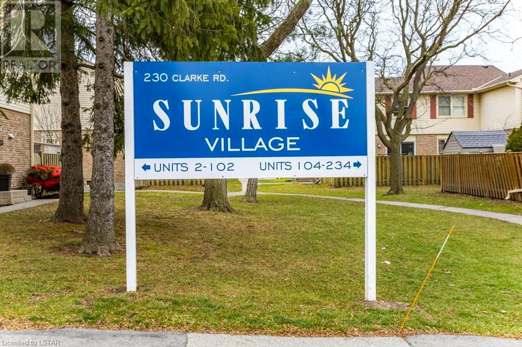Discover the potential of Unit #4 at 230 Clarke Road, Sunrise Village — a promising opportunity for handy people and those looking for sweat equity. Featuring approximately 1,433 square feet of finished living space including unique details such as a finished lower level rec room space with gas fireplace, custom bay window in living room, central vac and *CENTRAL AIR & FURNACE*. Patio door off the eat-in kitchen and good sized living room with lots of natural light. Primary bedroom with double closet. Newer central air, furnace, windows and roof. Parking immediately off the private backyard patio or short walk from front door. Assigned space #4 and additional open parking with lots of visitor parking. Affordable condo fees at $318/month which include water. Complex run by well established Thorne Property Management. Short walk to transit and several amenities. Cosmetic TLC required... bring your vision! (id:22211)