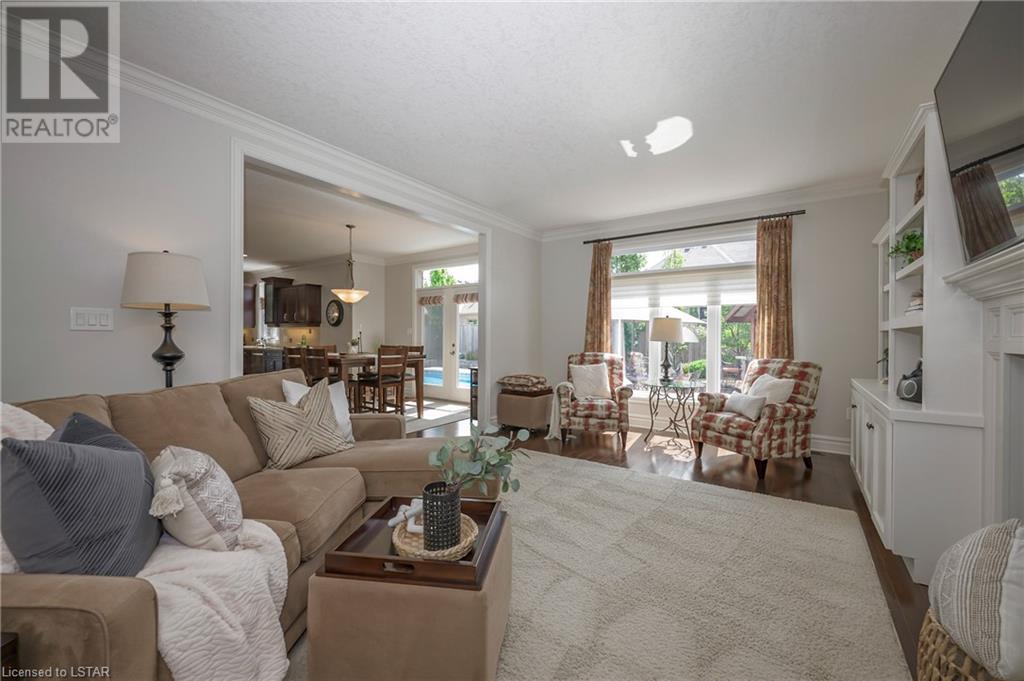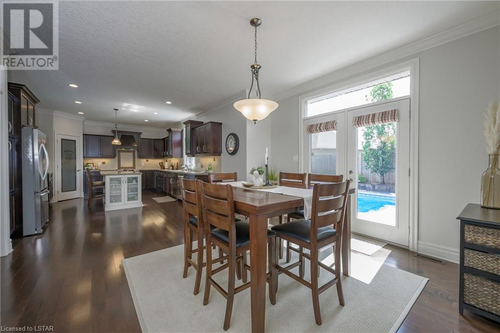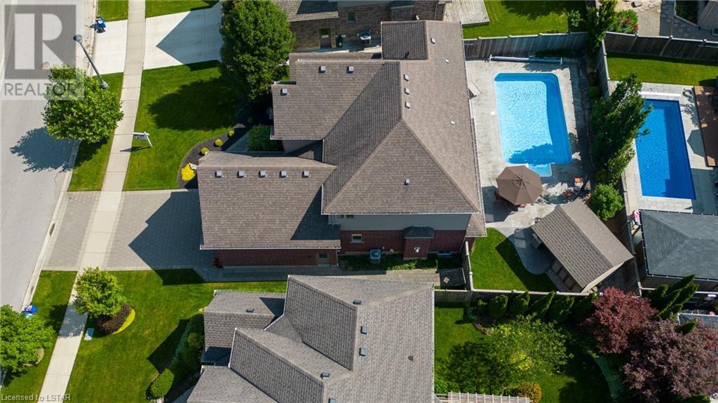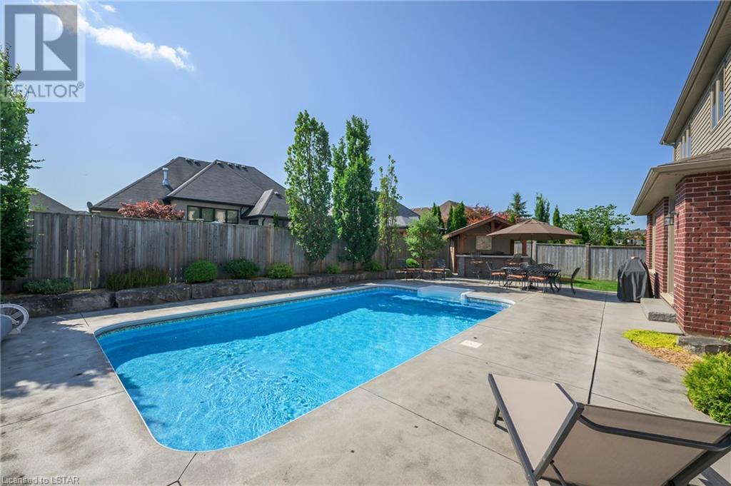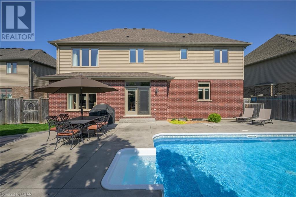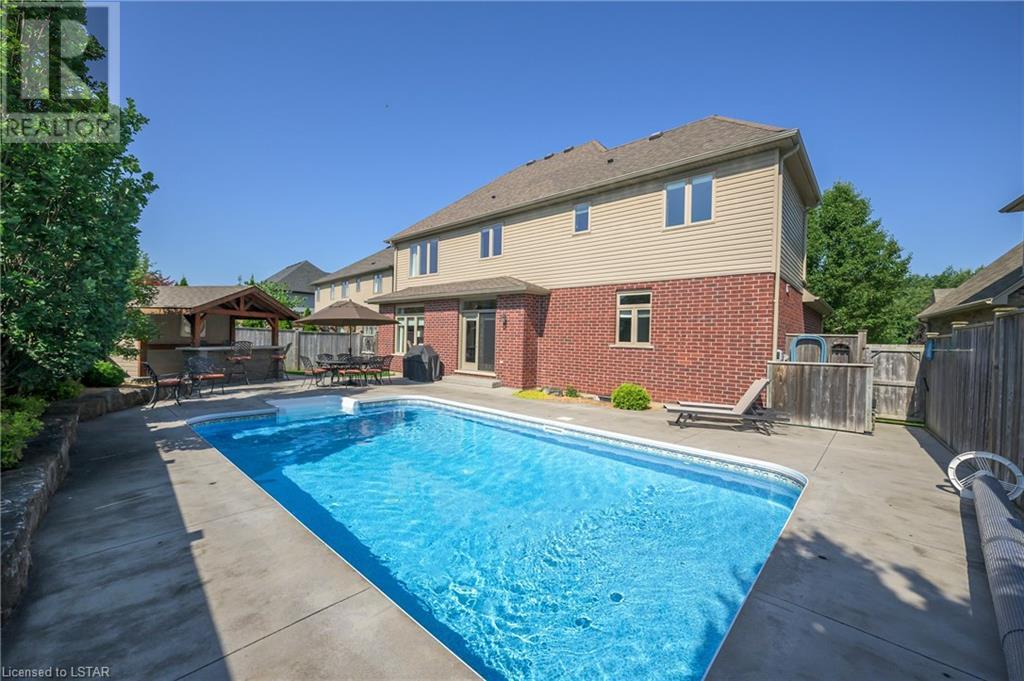 Impressive ~ 2900 sq. ft., 4 bedroom, executive home w/ heated salt-water pool oasis + finished lower level in Eagle Ridge just steps from nature trails through Kains Woods along the river. Timeless red brick exterior, stucco accents, covered front porch & meticulous landscaping create striking curb appeal. Build/workmanship offer meticulous attention to detail. Spacious floor plan & windows allow for seamless flow & an abundance of natural light. Freshly painted interior in soft ivory tones adds fresh sophistication. Rich hardwood flooring throughout main floor leads to separate dining room w/ cathedral ceiling & a private office ideal for remote work. The heart of the home unfolds in the open-concept kitchen/living room. Gourmet kitchen features granite counters, espresso cabinetry, stainless appliances, center island, walk-in pantry & spacious dinette. Kitchen opens into the oversized family room showcasing a beautiful fireplace surrounded by gracious builtins. Ascend the 2nd floor to 4 bedrooms including a large primary suite w/ tray ceiling, 5-piece ensuite w/separate shower, soaker tub & double sinks , walk-in closet & large sunlit windows. Finished lower level boasts a convenient separate garage staircase, expansive media/games room area, bonus room + full bathroom. Step outside to your private retreat in the fully fenced backyard. Thoughtful hardscaping & landscaping offer a low maintenance backyard experience so you can spend your time relaxing poolside or enjoying a refreshing beverage under the shade of the covered Muskoka bar. This executive property seamlessly blends a captivating front exterior with a thoughtfully designed interior, a high-functioning floor plan & a backyard oasis. Oversized garage & extended driveway park 6. Main floor laundry. Pool pump/cartridge filters ~3 yrs. Riverbend Park, schools, playgrounds, shopping, Golf & restaurants. within walking distance. Welcome Home. (id:22211)