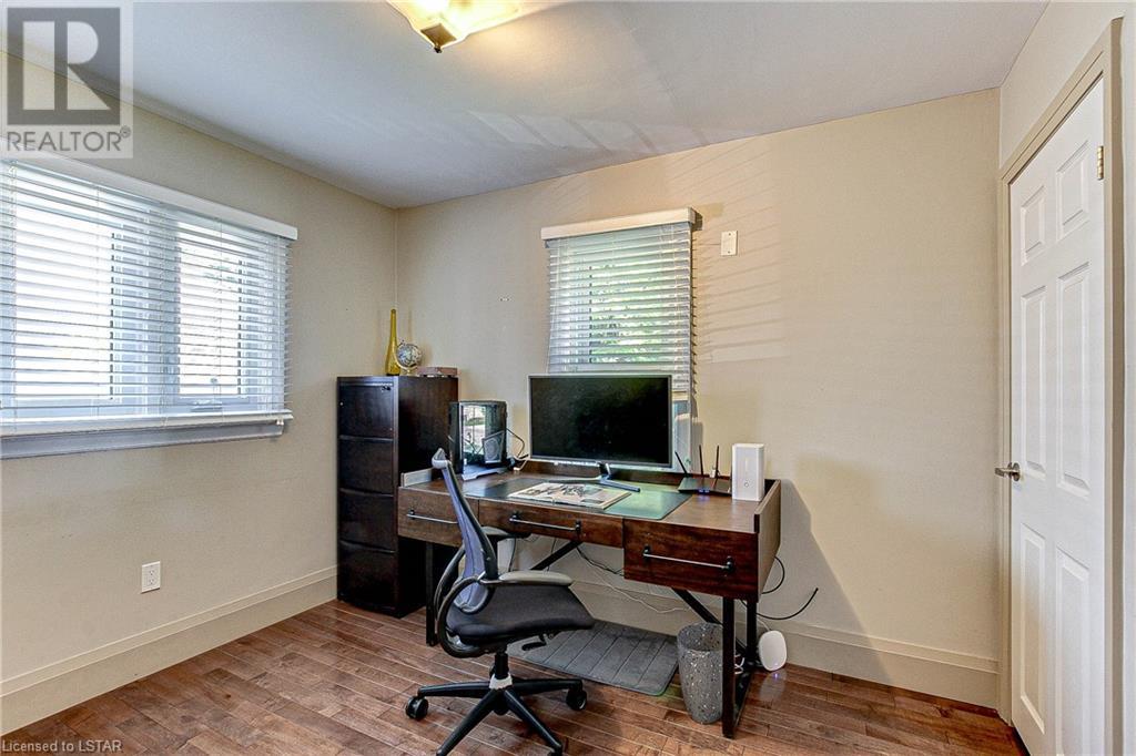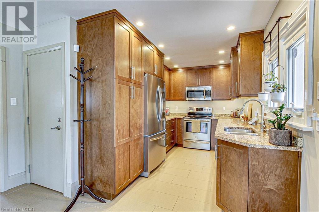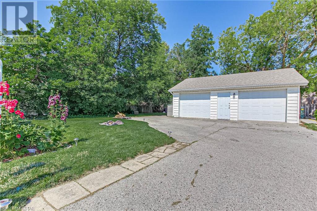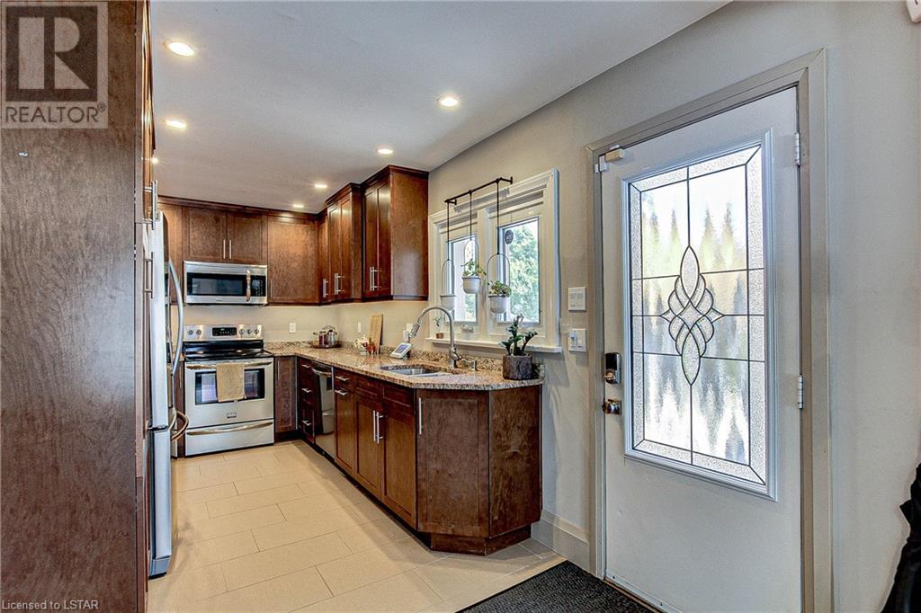 Excellent opportunity to own this solid property with all convenience around! 2 bedrooms on main with upgraded kitchen, flooring & bathroom. Gas fireplace in living room with eating area. The lower level has separate entrance with full kitchen, bathroom and 2 bedrooms perfect for granny suite or additional rental income. Oversized 28x24 foot garage enough for cars and equipment. Located in high traffic area, this property would be perfect for starters with extra rental income, small business owners with exposure on Wellington road. Well maintained! One call you are in! (id:22211)