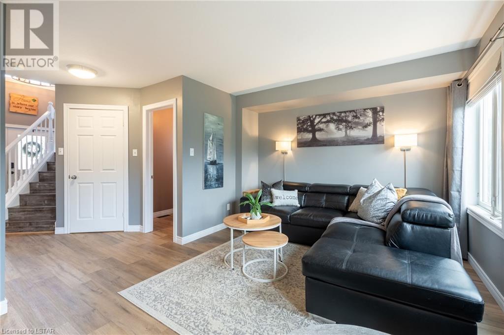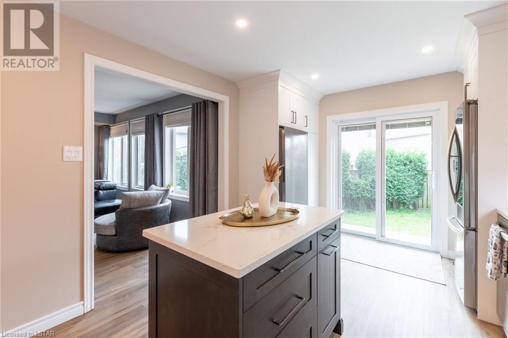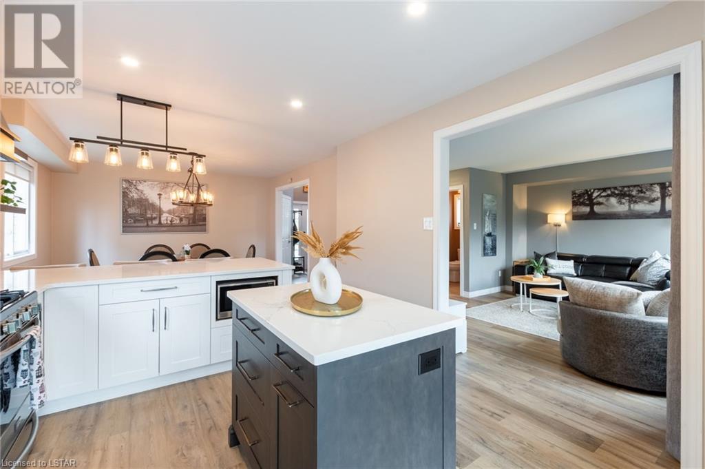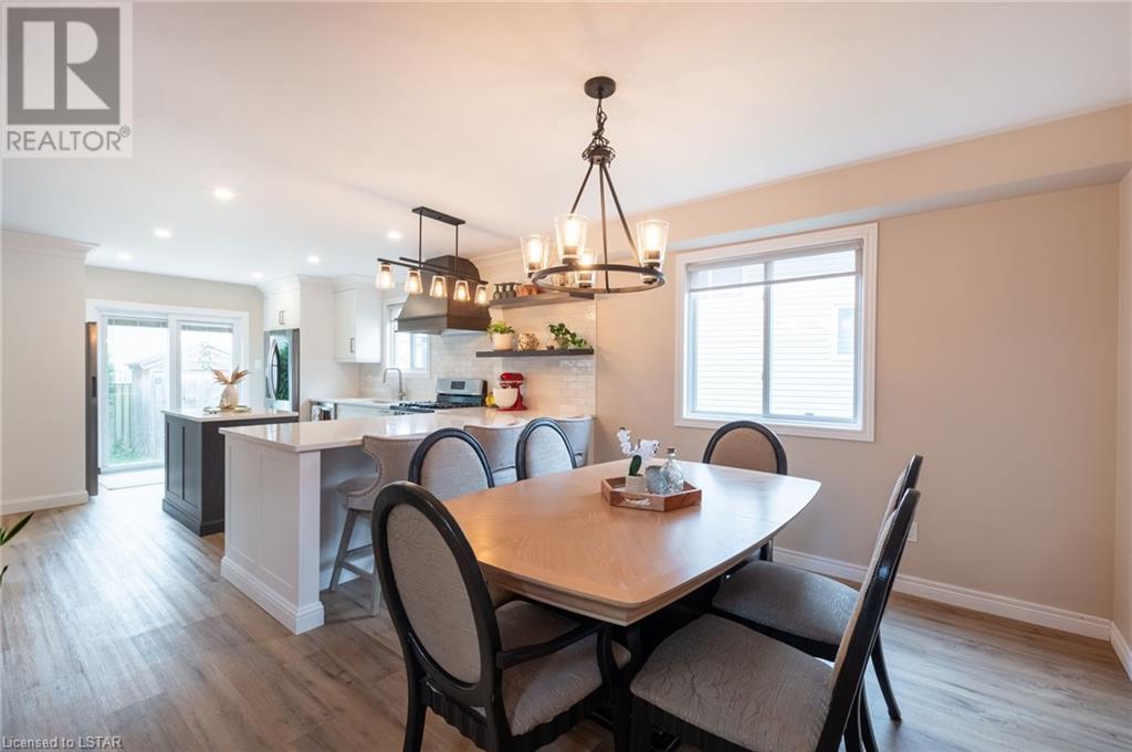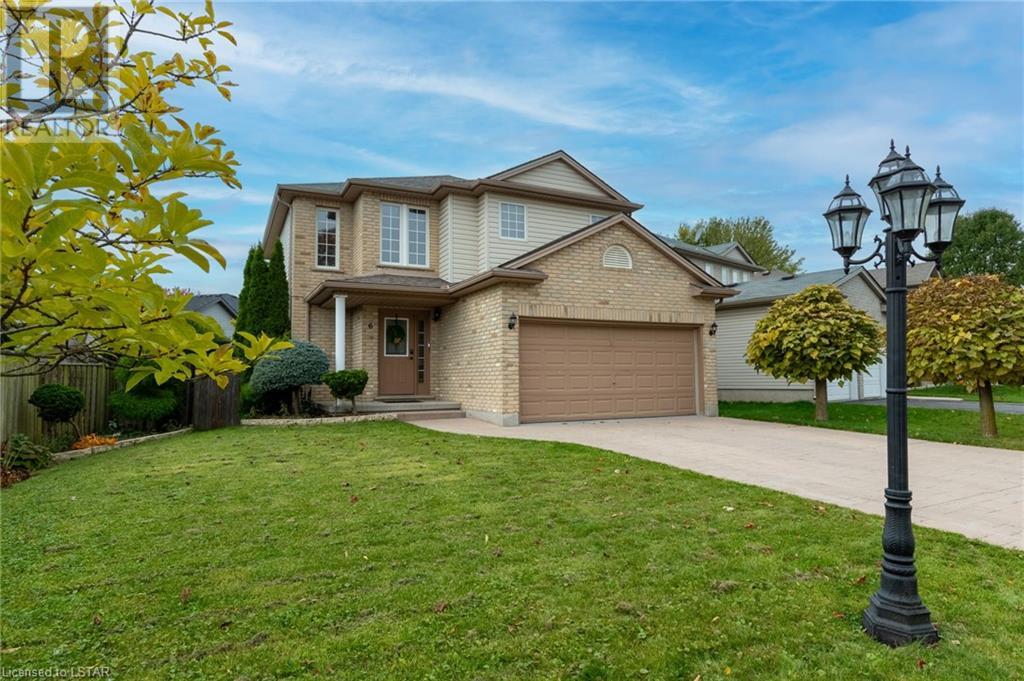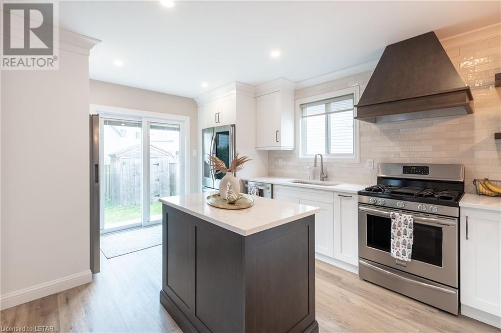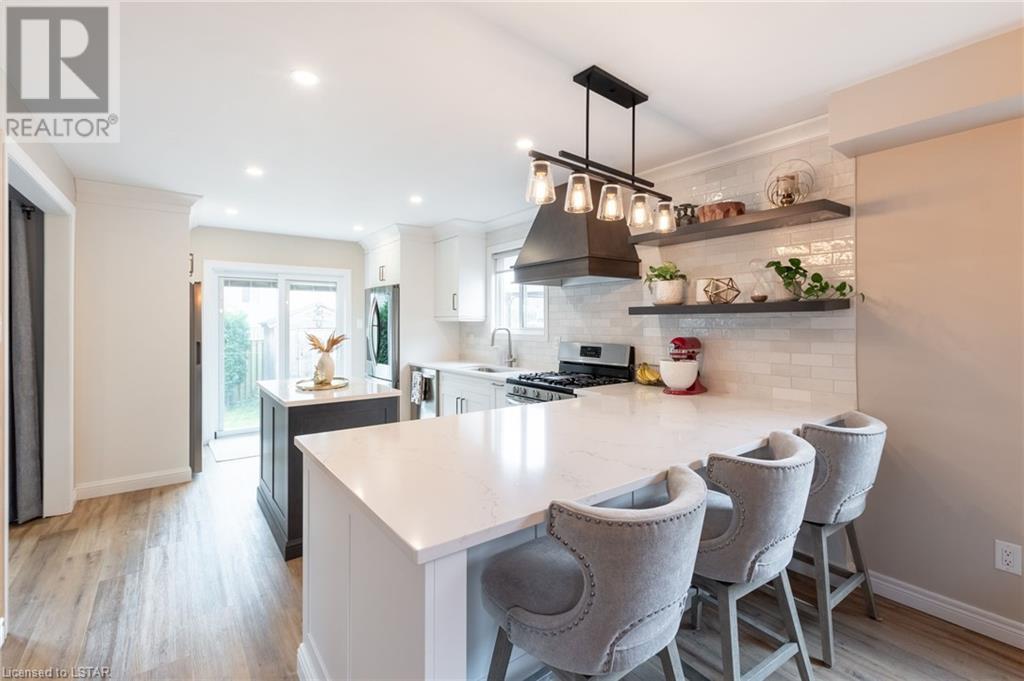 Trafalgar Heights proudly presents 6 Folkstone Court, a beautiful and impeccably maintained two-story residence. The moment you arrive on this quiet court, you'll be greeted by the charming curb appeal, characterized by stunning landscaping and an expansive stamped concrete driveway that accommodates up to four vehicles. The main level has been recently transformed with BRAND NEW vinyl composite flooring throughout (waterproof, scratchproof) and a captivating BRAND NEW kitchen designed by talented Casey’s Creative Designs. This luxurious kitchen is bright and inviting featuring a sleek eat-in bar, premium-grade quartz countertops, gas stove, dimmable pot lights, custom-built cabinetry with built-ins for functionality including garbage pullout, lazy susan, large utensil bins/spice rack, tray dividers and pull-out drawers and chic featured tile wall with floating shelves. Upgraded stainless steel appliances. The upper level has been thoughtfully upgraded laminate flooring and hosts three bedrooms and 2 full bathrooms. The primary suite showcases a spacious walk-in closet and a large 3pc ensuite. Fully finished lower level provides an expansive recreation room, laundry area, storage nooks and a utility space housing a new furnace installed in 2020. Additional updates: roof (2016), lighting & ceiling fans throughout, 2023 sliding patio door with inside blinds(Canada Glass) and custom window treatments throughout majority of the home. Completing this turnkey property is a charming backyard and a two-car garage. Conveniently situated on a peaceful court, in close proximity to the London airport, golf courses, shopping, restaurants, schools and quick access to major highways. (id:22211)