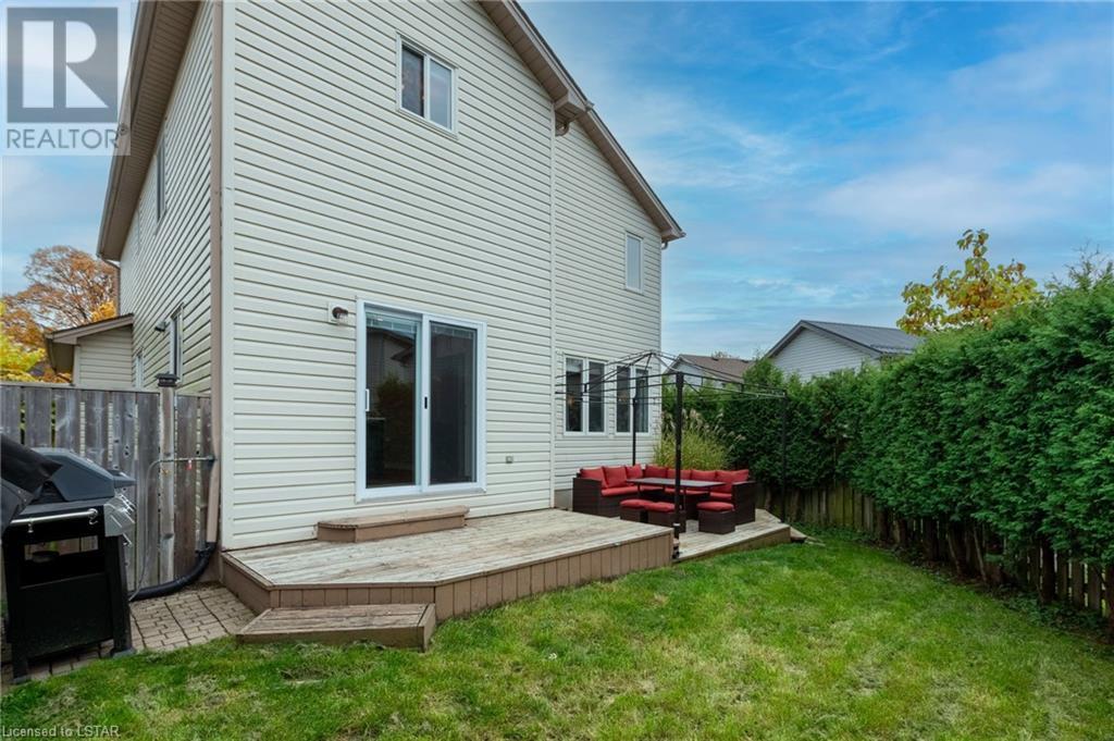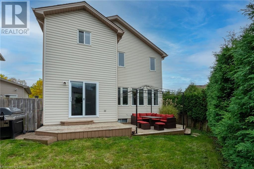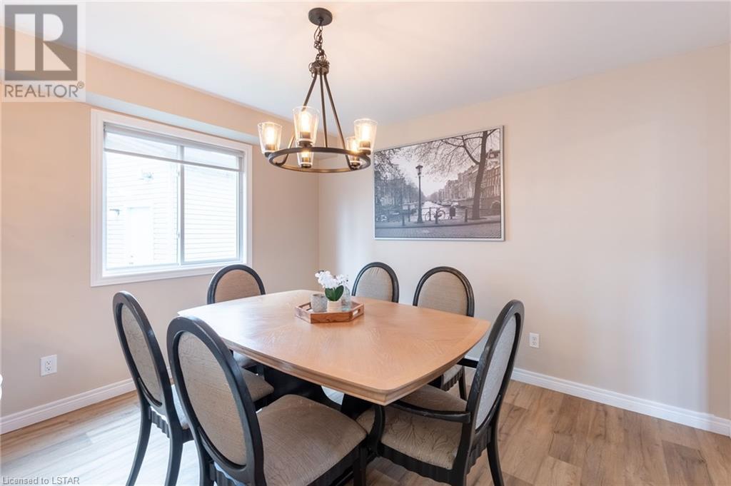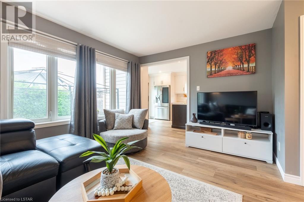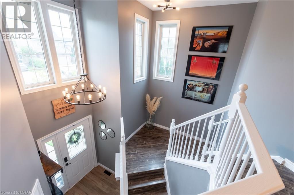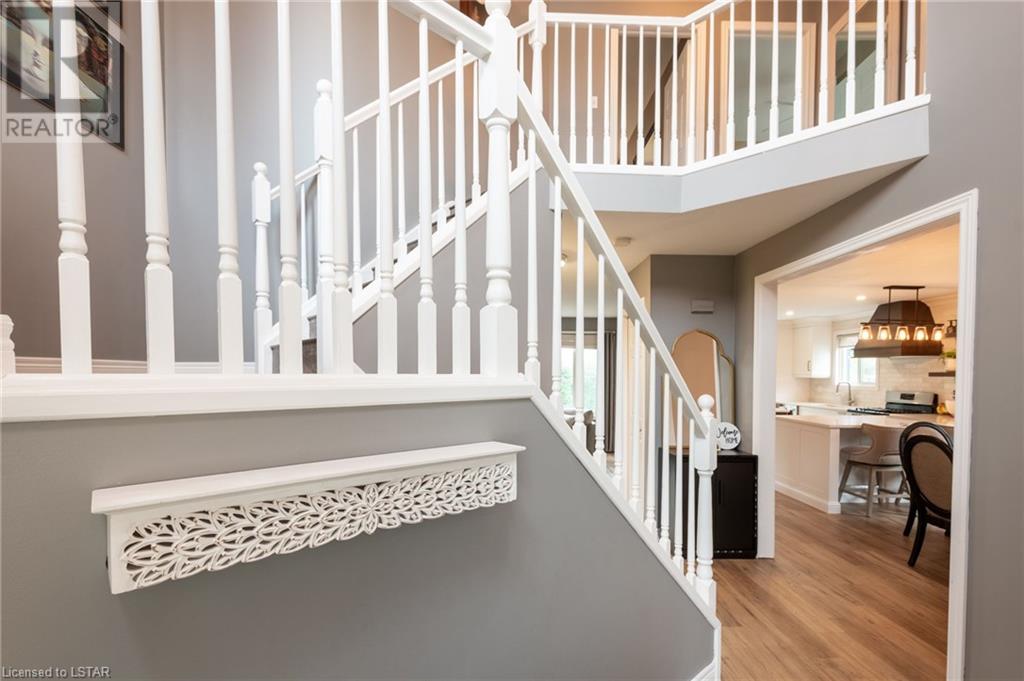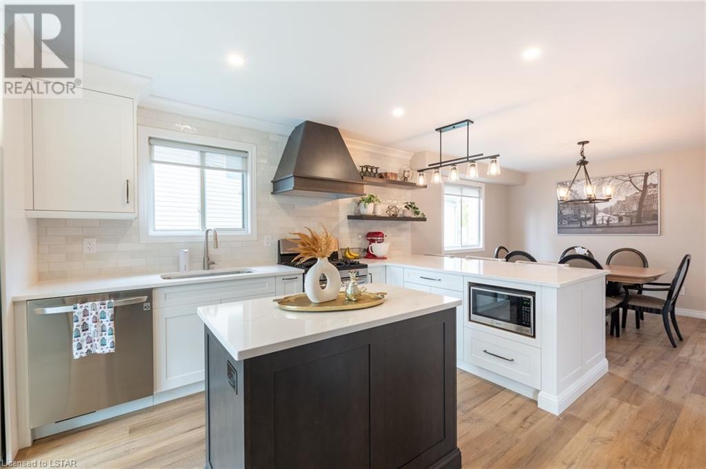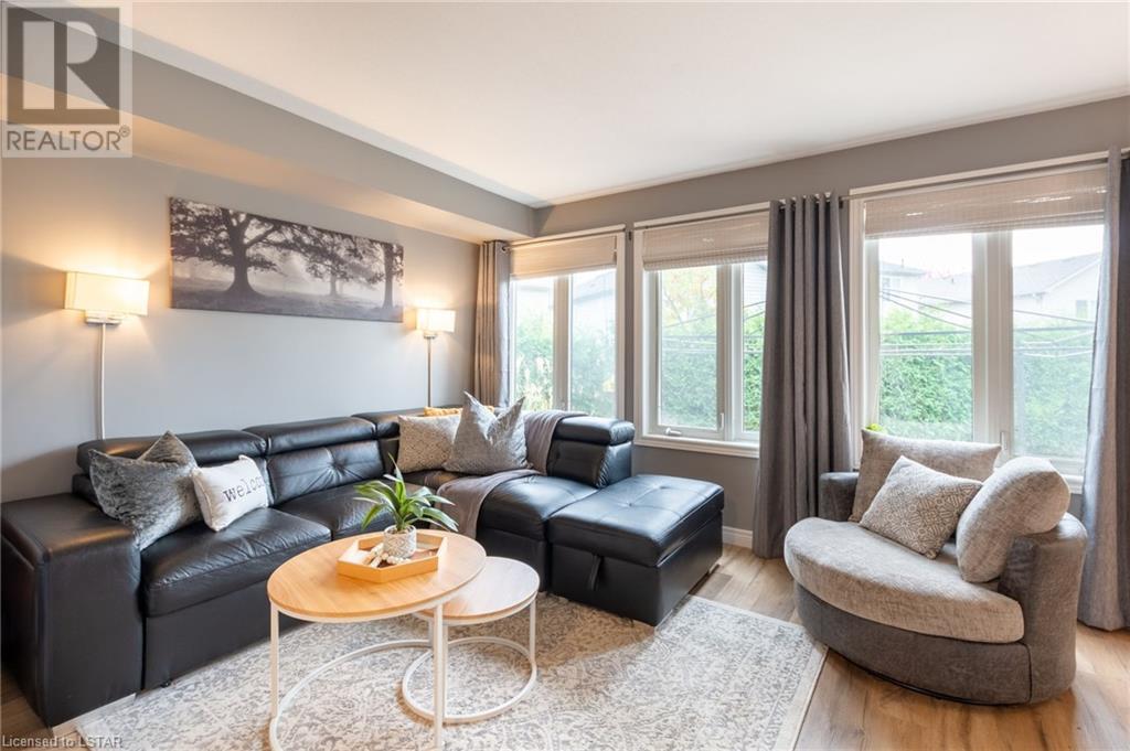 Trafalgar Heights proudly presents 6 Folkstone Court, a beautiful and impeccably maintained two-story residence. The moment you arrive on this quiet court, you'll be greeted by the charming curb appeal, characterized by stunning landscaping and an expansive stamped concrete driveway that accommodates up to four vehicles. The main level has been recently transformed with BRAND NEW vinyl composite flooring throughout (waterproof, scratchproof) and a captivating BRAND NEW kitchen designed by talented Casey’s Creative Designs. This luxurious kitchen is bright and inviting featuring a sleek eat-in bar, premium-grade quartz countertops, gas stove, dimmable pot lights, custom-built cabinetry with built-ins for functionality including garbage pullout, lazy susan, large utensil bins/spice rack, tray dividers and pull-out drawers and chic featured tile wall with floating shelves. Upgraded stainless steel appliances. The upper level has been thoughtfully upgraded laminate flooring and hosts three bedrooms and 2 full bathrooms. The primary suite showcases a spacious walk-in closet and a large 3pc ensuite. Fully finished lower level provides an expansive recreation room, laundry area, storage nooks and a utility space housing a new furnace installed in 2020. Additional updates: roof (2016), lighting & ceiling fans throughout, 2023 sliding patio door with inside blinds(Canada Glass) and custom window treatments throughout majority of the home. Completing this turnkey property is a charming backyard and a two-car garage. Conveniently situated on a peaceful court, in close proximity to the London airport, golf courses, shopping, restaurants, schools and quick access to major highways. (id:22211)