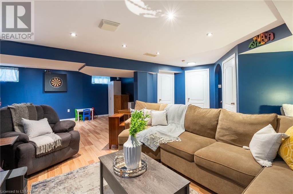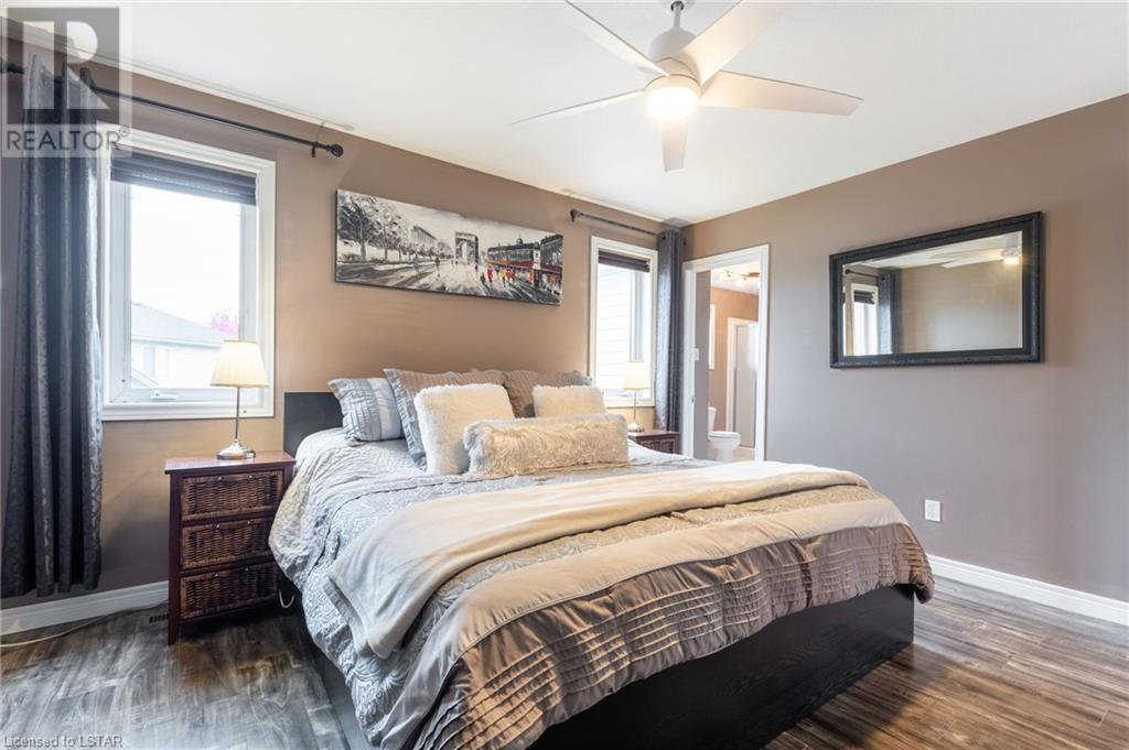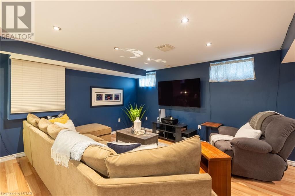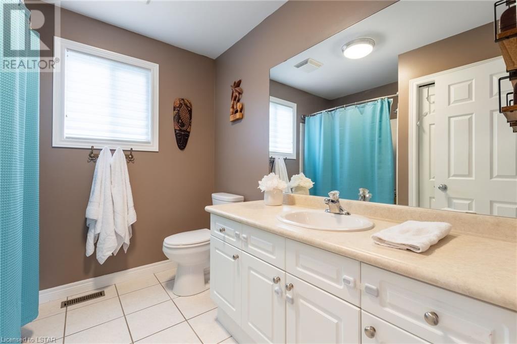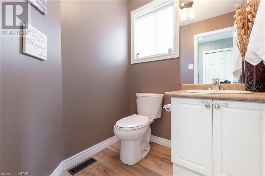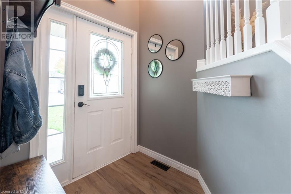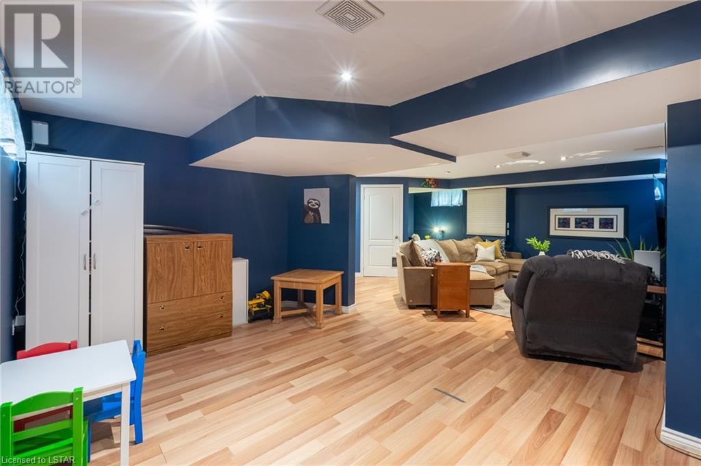 Trafalgar Heights proudly presents 6 Folkstone Court, a beautiful and impeccably maintained two-story residence. The moment you arrive on this quiet court, you'll be greeted by the charming curb appeal, characterized by stunning landscaping and an expansive stamped concrete driveway that accommodates up to four vehicles. The main level has been recently transformed with BRAND NEW vinyl composite flooring throughout (waterproof, scratchproof) and a captivating BRAND NEW kitchen designed by talented Casey’s Creative Designs. This luxurious kitchen is bright and inviting featuring a sleek eat-in bar, premium-grade quartz countertops, gas stove, dimmable pot lights, custom-built cabinetry with built-ins for functionality including garbage pullout, lazy susan, large utensil bins/spice rack, tray dividers and pull-out drawers and chic featured tile wall with floating shelves. Upgraded stainless steel appliances. The upper level has been thoughtfully upgraded laminate flooring and hosts three bedrooms and 2 full bathrooms. The primary suite showcases a spacious walk-in closet and a large 3pc ensuite. Fully finished lower level provides an expansive recreation room, laundry area, storage nooks and a utility space housing a new furnace installed in 2020. Additional updates: roof (2016), lighting & ceiling fans throughout, 2023 sliding patio door with inside blinds(Canada Glass) and custom window treatments throughout majority of the home. Completing this turnkey property is a charming backyard and a two-car garage. Conveniently situated on a peaceful court, in close proximity to the London airport, golf courses, shopping, restaurants, schools and quick access to major highways. (id:22211)