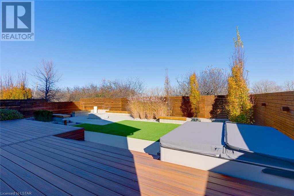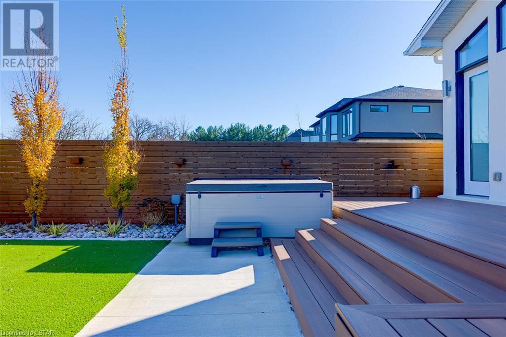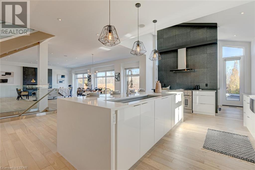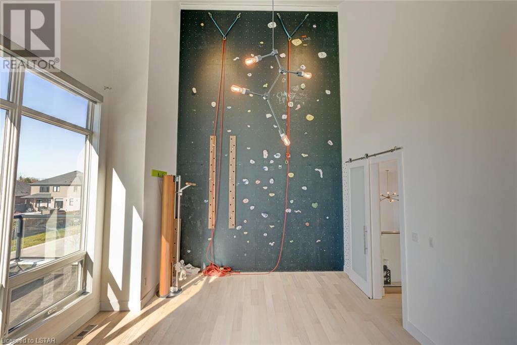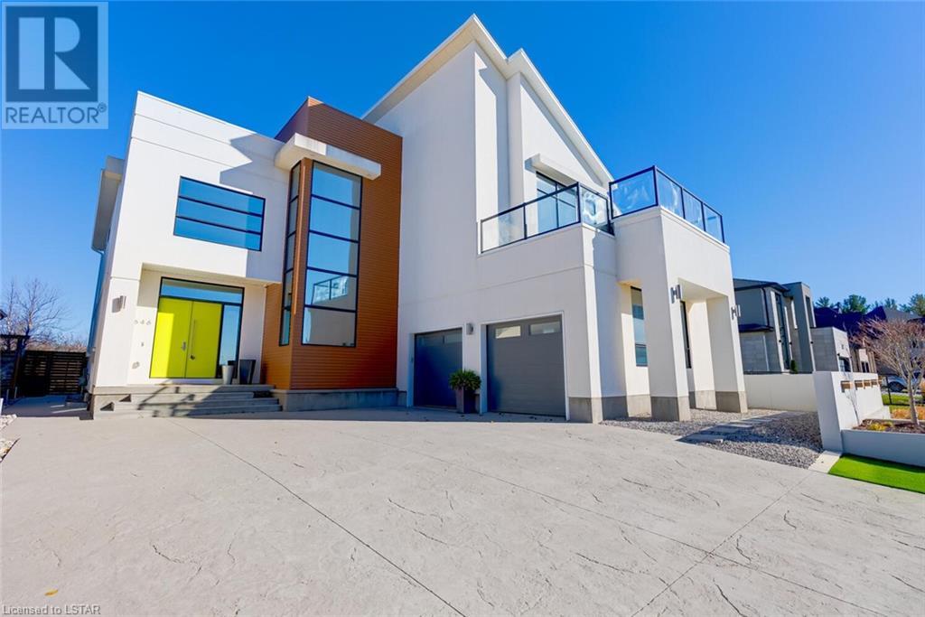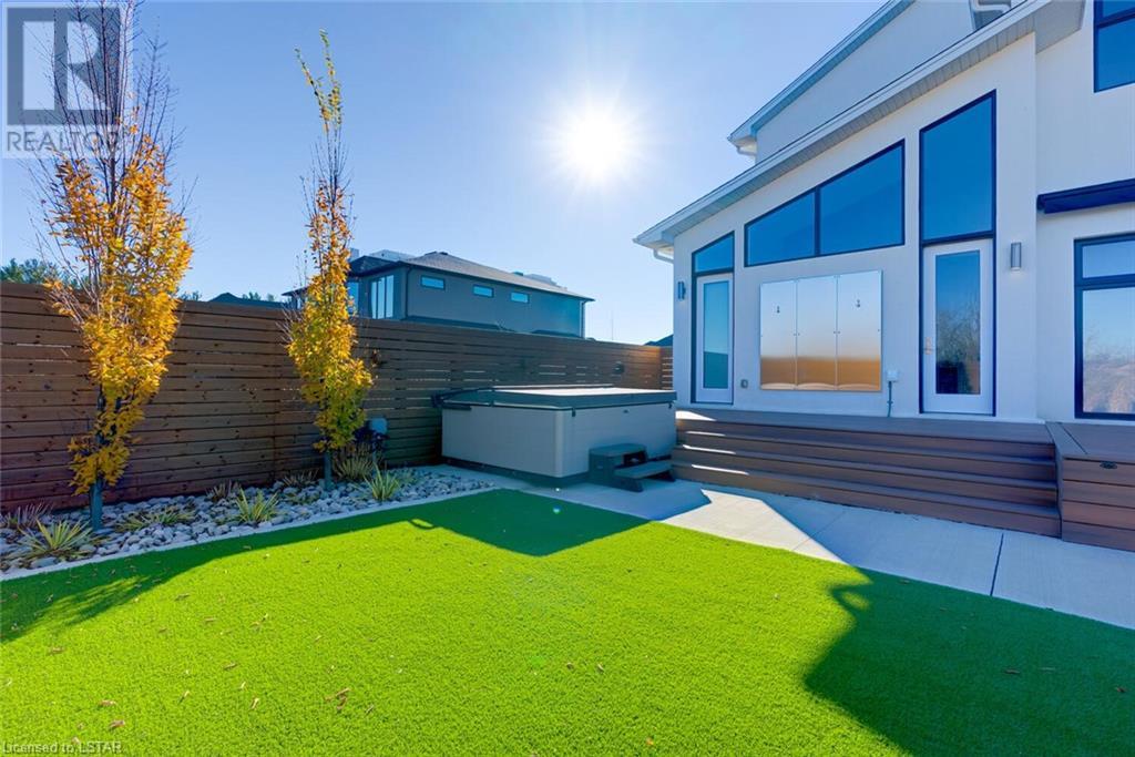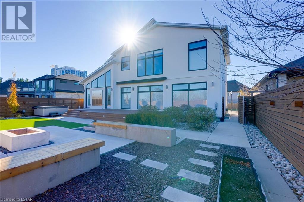 Outstanding custom-built property backing onto Medway Valley Heritage Forest trails with gorgeous view in desirable North London! This 3,900+ SF open concept layout boasts an impressive 20ft entryway with floor to ceiling windows in main living/dining room areas, sleek fireplace, contemporary glass/stainless railings/open risers and hardwood flooring throughout. Kitchen showcases white quartz countertops, custom cabinetry, plenty of storage, 10ft waterfall quartz island with Galley Workstation Sink. Second apron style sink in the kitchen with Garburator, Insta Hot Tap. Other features include a gas stove with hood range, commercial fridge/freezer combo, dishwasher (all S/S appliances), butler’s pantry with bar fridge, sink, ‘Urban Cultivator’ automated kitchen garden for growing fresh herbs/microgreens. Sunken lounge/family room. Upstairs features 4 beds & 3 full baths including stunning Primary Suite with vaulted ceiling, floor to ceiling windows, automated Hunter Douglas blinds, fireplace, and luxurious ensuite with double sinks, shower with bench, freestanding tub and massive closet with custom built-ins. Bedrooms 2 & 3 have custom closets with Jack & Jill ensuite. 4th bedroom has full bath & 20ft rock climbing wall. Convenient second floor laundry. 1694 SF Finished Basement offers a huge rec room, bedroom with full bath, bonus room for gym/playroom. Backyard with large composite deck, electric retractable awning, S/S BBQ backsplash panels, fire pit, fountain(roughed-in). 'Turfblock’ pet friendly artificial lawn, low maintenance stone/mulch gardens, perimeter privacy fence. Stil Hot tub. Installed Generac 7500 watt PowerPact automatic home backup generator, Battery backup sump pump system, Aquasana water filtration, Sprinkler system, Nest thermostat, Ring doorbell, Security system/cameras. Mudroom with shoe shelves/storage benches. 2 car garage with storage area. In-ceiling 5.1 Surround Speakers & Sonos sound system throughout house, slider volumes in each room. (id:22211)