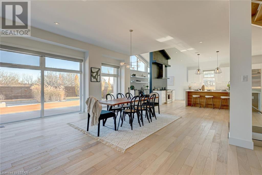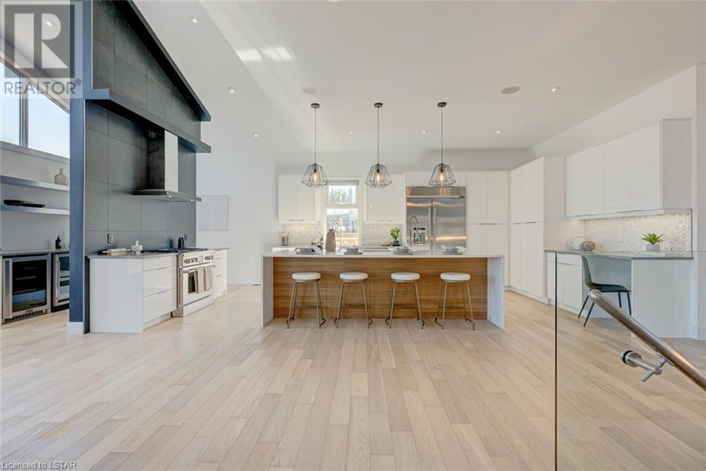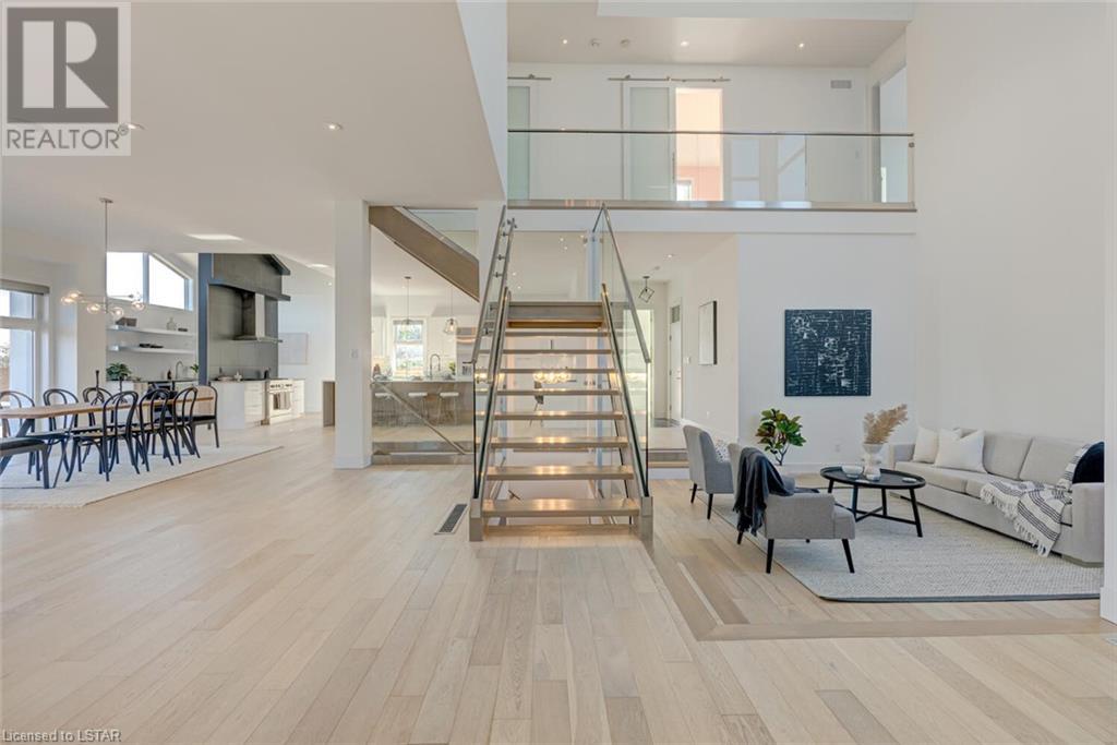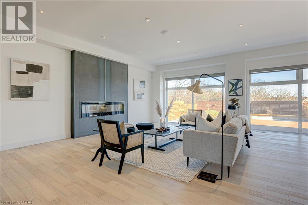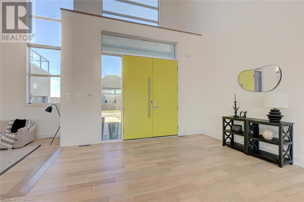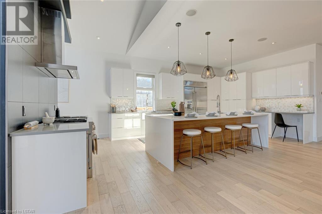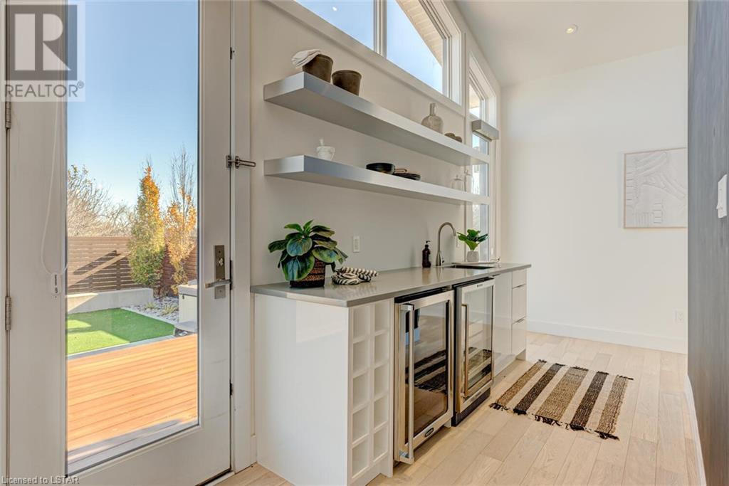 Outstanding custom-built property backing onto Medway Valley Heritage Forest trails with gorgeous view in desirable North London! This 3,900+ SF open concept layout boasts an impressive 20ft entryway with floor to ceiling windows in main living/dining room areas, sleek fireplace, contemporary glass/stainless railings/open risers and hardwood flooring throughout. Kitchen showcases white quartz countertops, custom cabinetry, plenty of storage, 10ft waterfall quartz island with Galley Workstation Sink. Second apron style sink in the kitchen with Garburator, Insta Hot Tap. Other features include a gas stove with hood range, commercial fridge/freezer combo, dishwasher (all S/S appliances), butler’s pantry with bar fridge, sink, ‘Urban Cultivator’ automated kitchen garden for growing fresh herbs/microgreens. Sunken lounge/family room. Upstairs features 4 beds & 3 full baths including stunning Primary Suite with vaulted ceiling, floor to ceiling windows, automated Hunter Douglas blinds, fireplace, and luxurious ensuite with double sinks, shower with bench, freestanding tub and massive closet with custom built-ins. Bedrooms 2 & 3 have custom closets with Jack & Jill ensuite. 4th bedroom has full bath & 20ft rock climbing wall. Convenient second floor laundry. 1694 SF Finished Basement offers a huge rec room, bedroom with full bath, bonus room for gym/playroom. Backyard with large composite deck, electric retractable awning, S/S BBQ backsplash panels, fire pit, fountain(roughed-in). 'Turfblock’ pet friendly artificial lawn, low maintenance stone/mulch gardens, perimeter privacy fence. Stil Hot tub. Installed Generac 7500 watt PowerPact automatic home backup generator, Battery backup sump pump system, Aquasana water filtration, Sprinkler system, Nest thermostat, Ring doorbell, Security system/cameras. Mudroom with shoe shelves/storage benches. 2 car garage with storage area. In-ceiling 5.1 Surround Speakers & Sonos sound system throughout house, slider volumes in each room. (id:22211)
