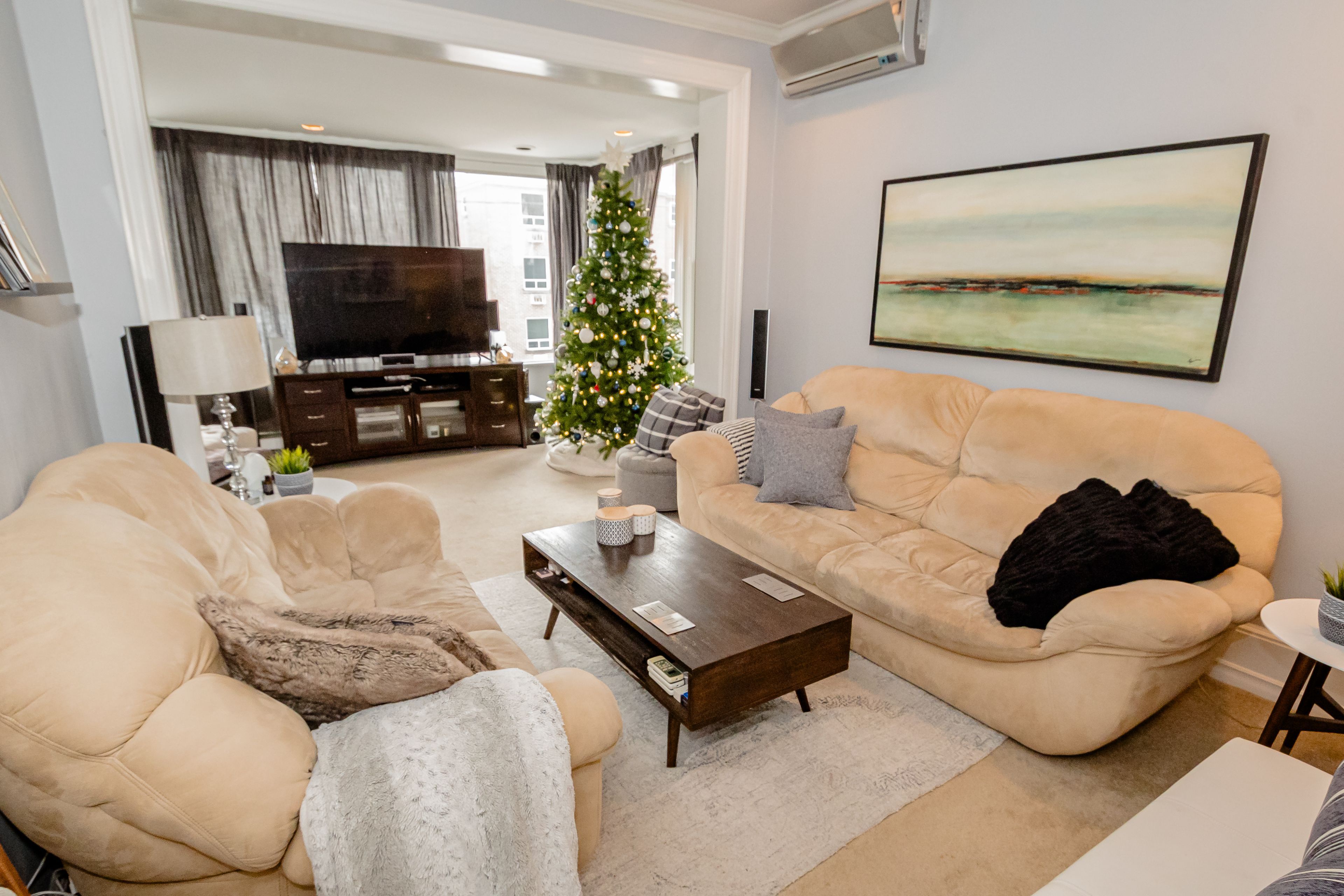 **主层单元**:两间宽敞卧室,阳光充沛的客厅,以及带中岛台的现代化大厨房,堪称业主理想居所。