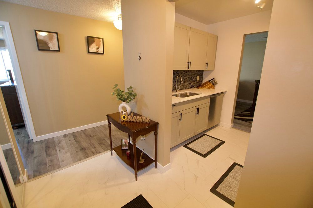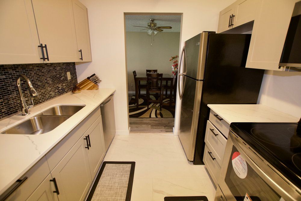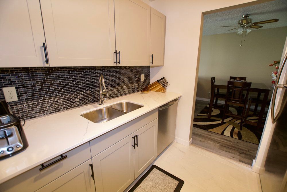 dishwasher from white to stainless, floor trim, new tiles in the pantry and the kitchen, entrance