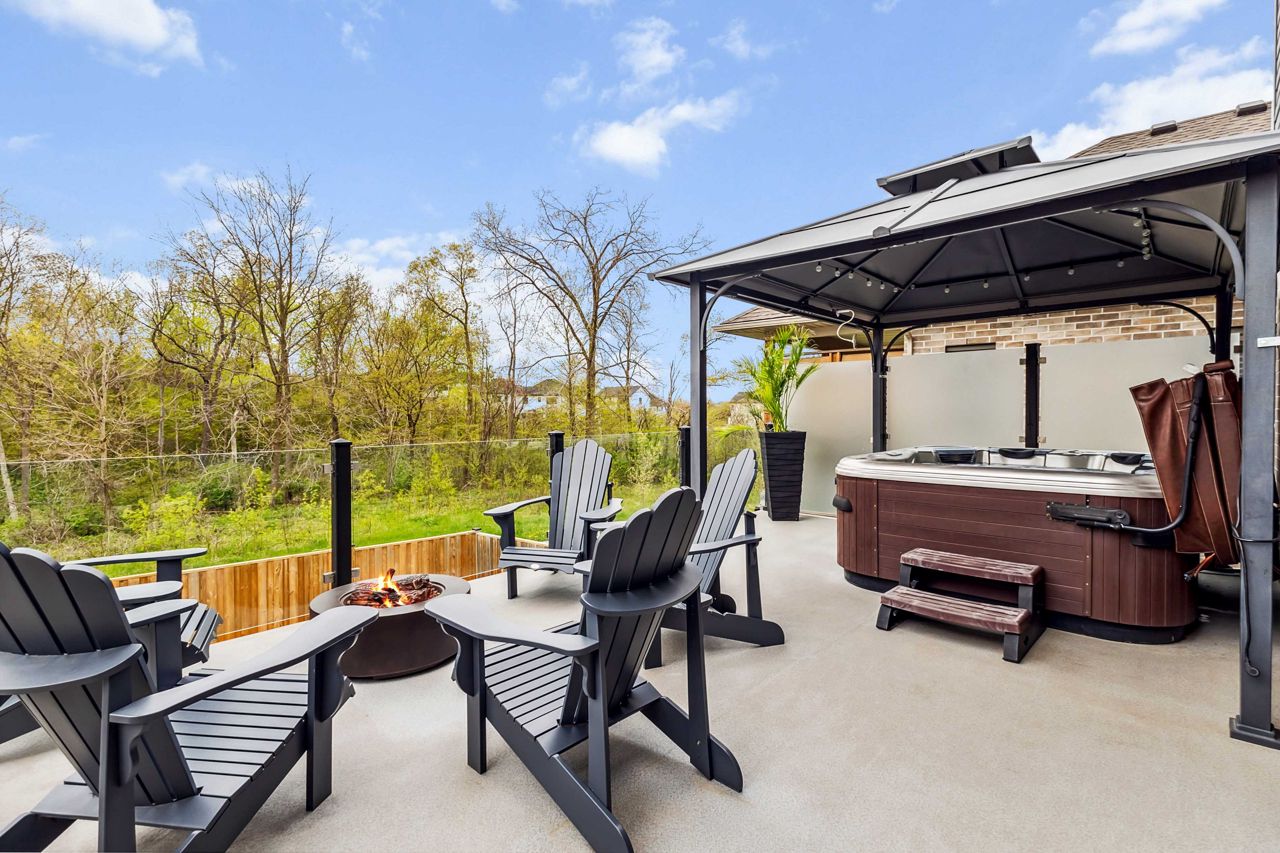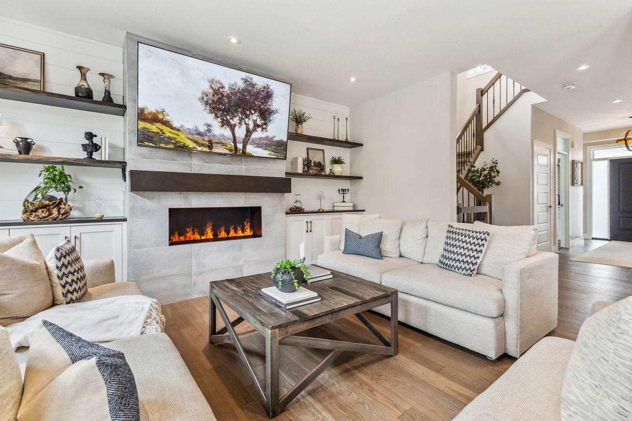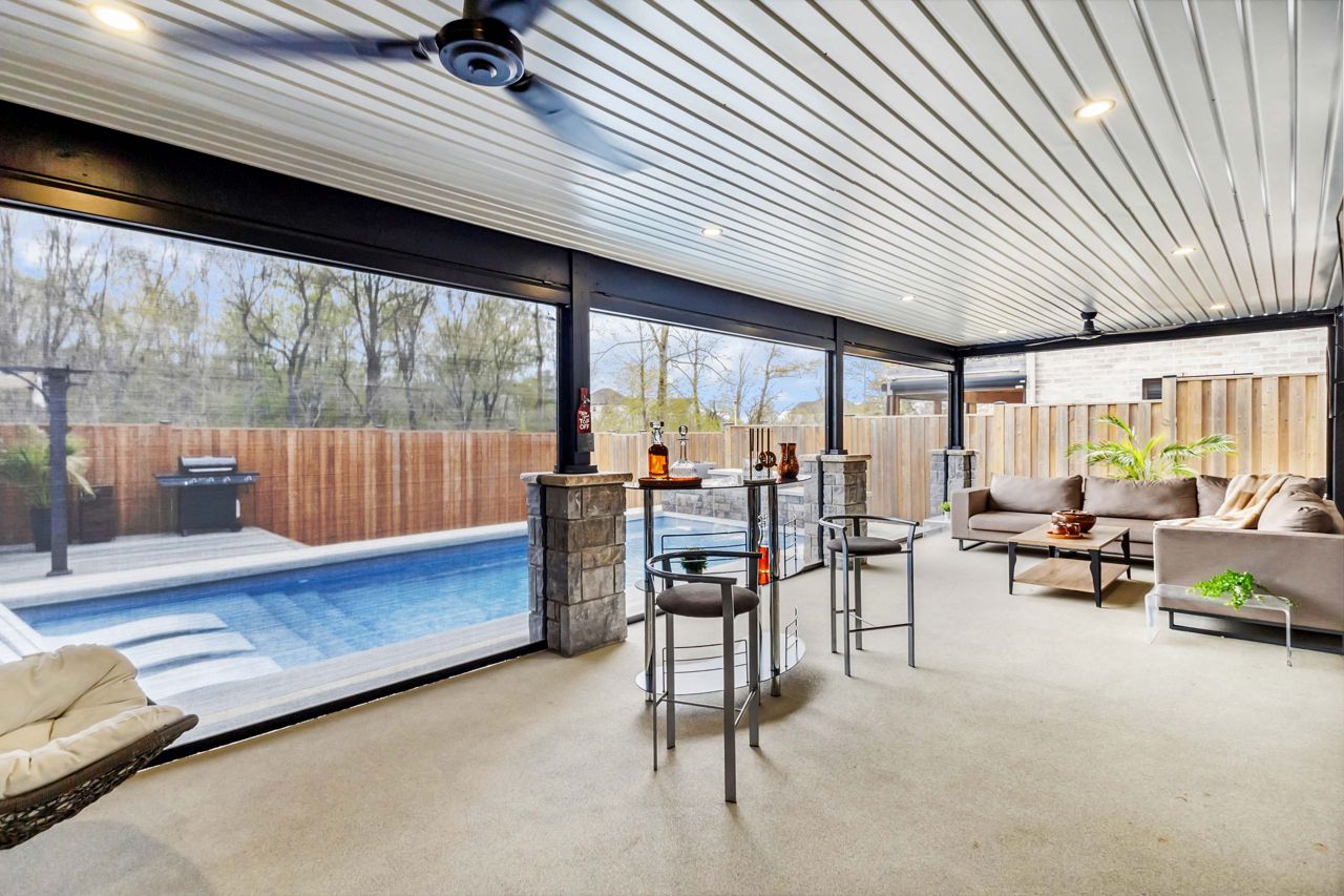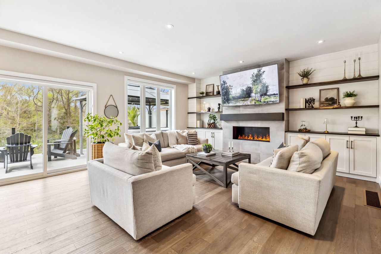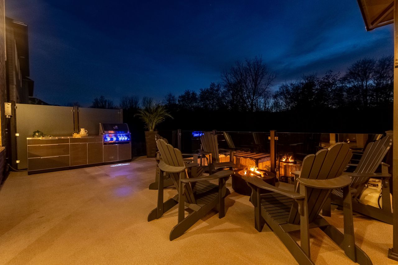 厨师级厨房配备石英台面、步入式食品储藏室、酒吧冰箱、定制嵌入式餐柜,并直通带钢化玻璃围栏的私人露台,配有隐私隔板、天然气火坑和按摩浴缸,是户外放松的绝佳场所。客厅宽敞明亮,配有Opti-myst水雾壁炉和更多定制内置家具。