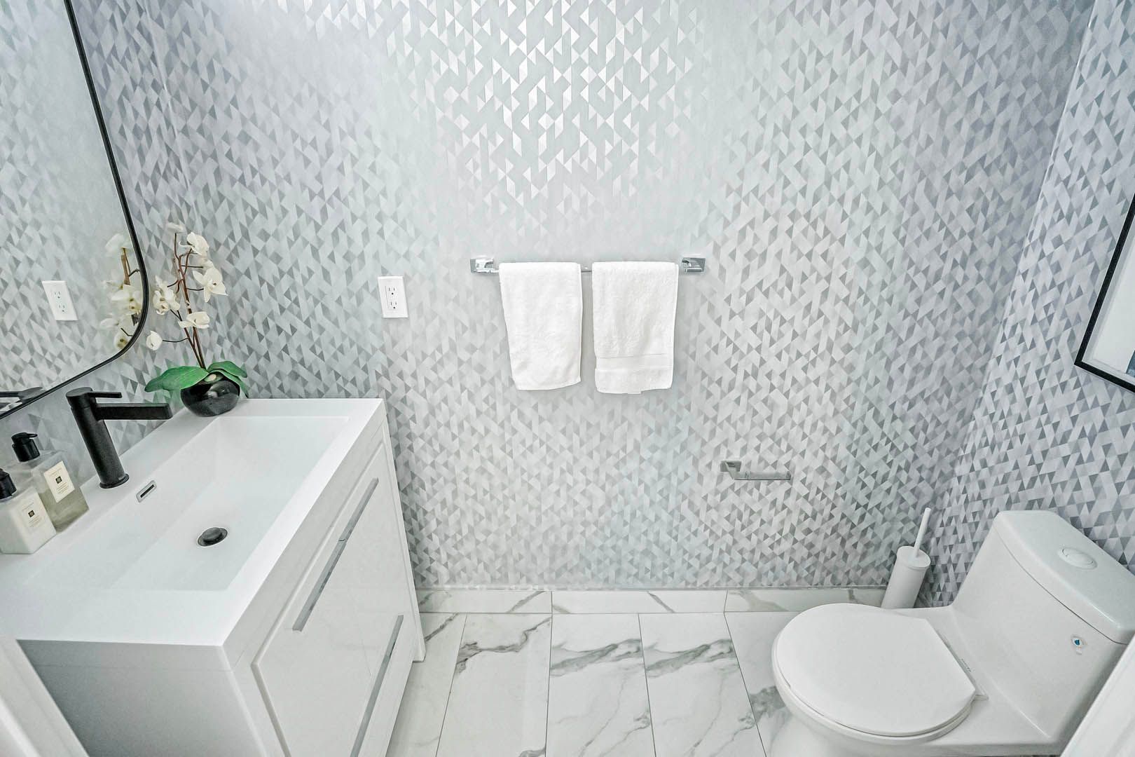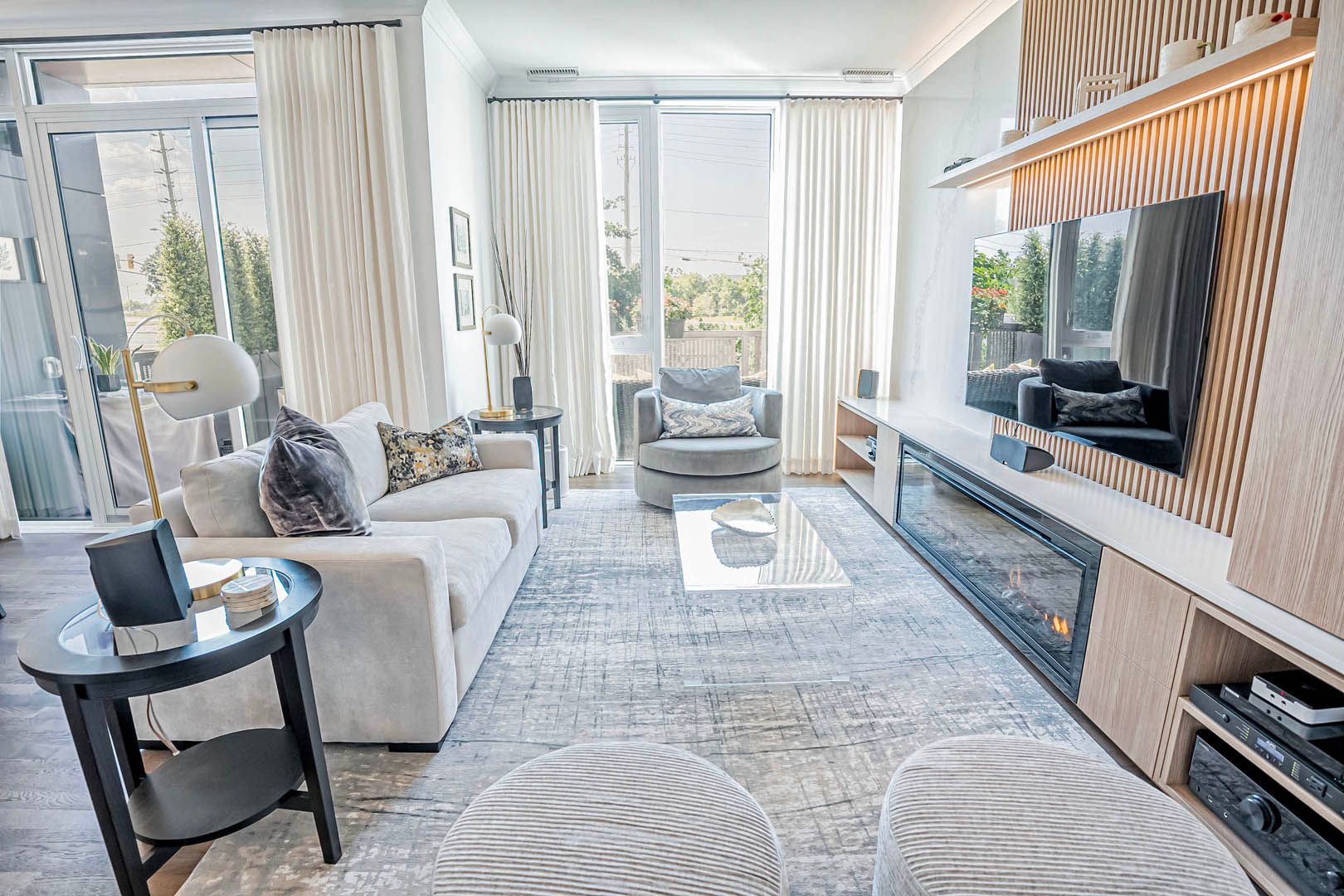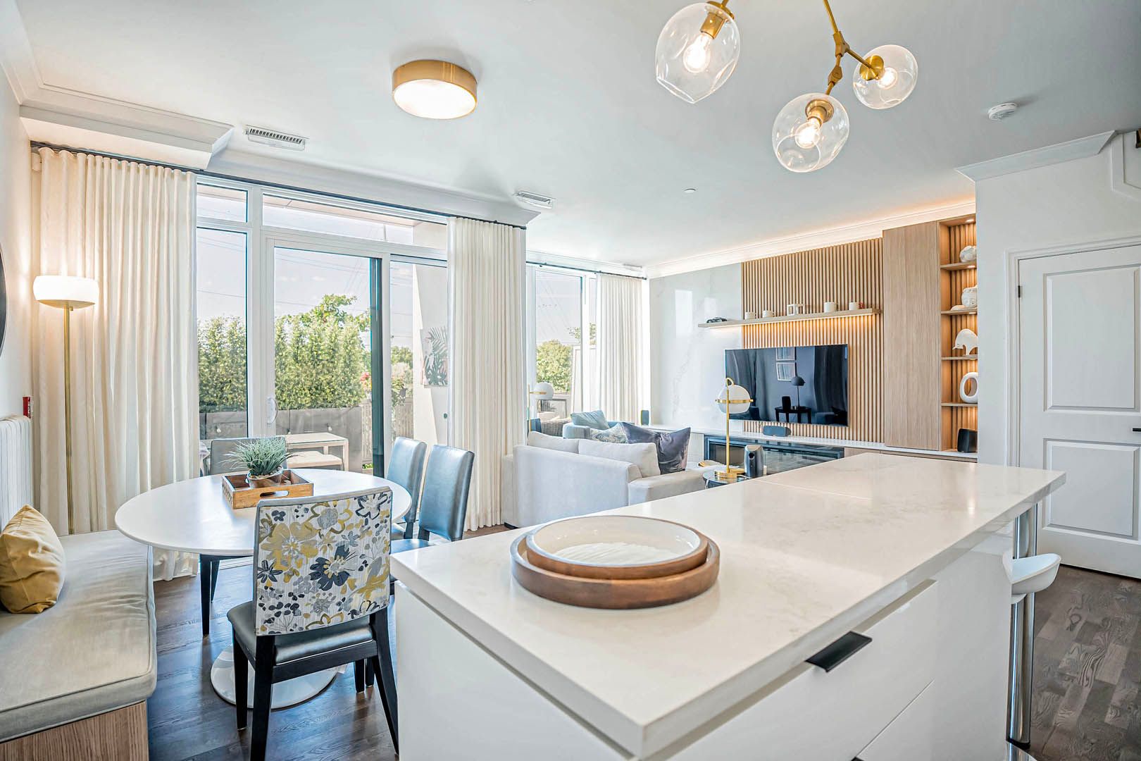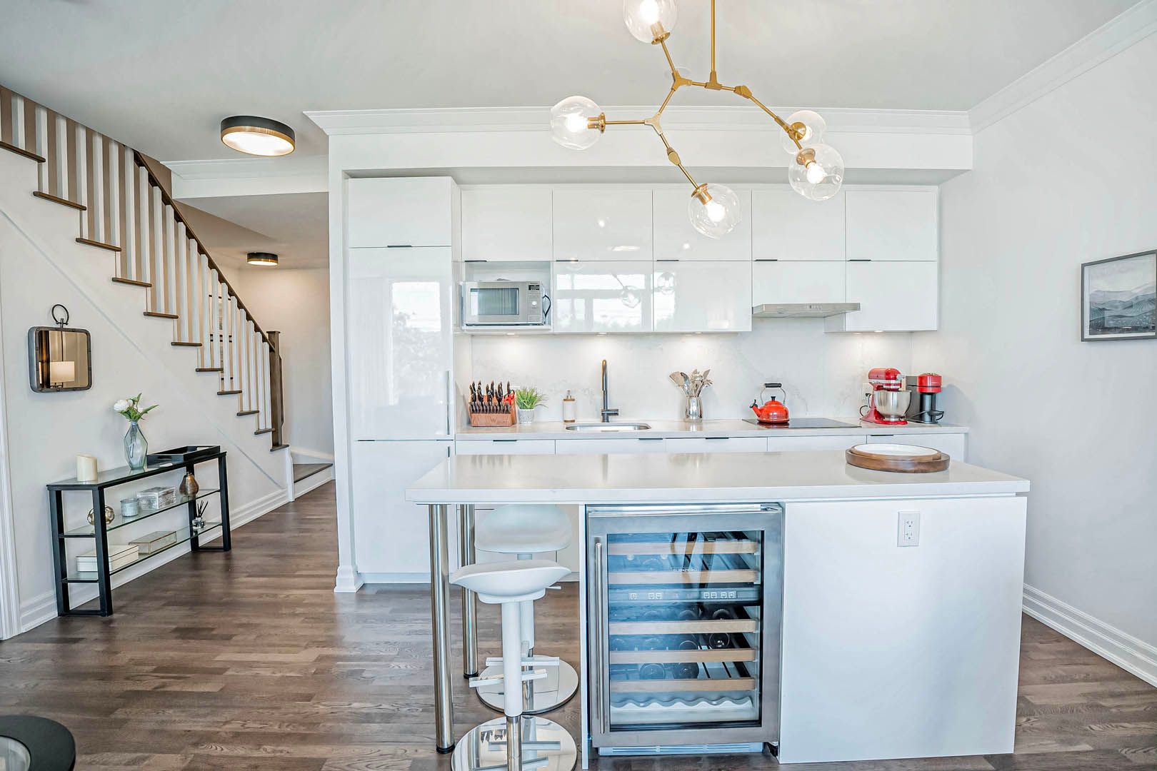 Welcome to elevated elegance and sophistication. **Everything in this home is custom and designer inspired** Chic wallpaper in the bedrooms & bathrooms (textured wallpaper in master bedroom). Caesarstone and wood media wall with dimmable ambient led lighting - includes built in remote controlled electric fireplace. Television also *included*. Caesarstone on the media wall, kitchen island and backsplash all match. Built in banquet in breakfast area with cabinets underneath. Beautiful kitchen island with wine fridge underneath + touchless faucet. Under stairs storage room has been transformed into a pantry with built in shelving and cabinets. Designer inspired light fixtures, door handles and bathroom hardware. Modern style crown moulding and baseboards. Bedrooms with blinds + black out curtains. A spacious spa like master bathroom with a tub and double sink. 250 sq ft large terrace to entertain guests. If you want refined living at it's best, this is the home for you! *Parking & Locker included* Parking level on P1All existing appliances + Subzero wine fridge, wardrobe closet in third bedroom, all window coverings, all light fixtures, all mirrors in bathrooms, built in banquet, television, existing thermostat, usb compatible electrical outlet