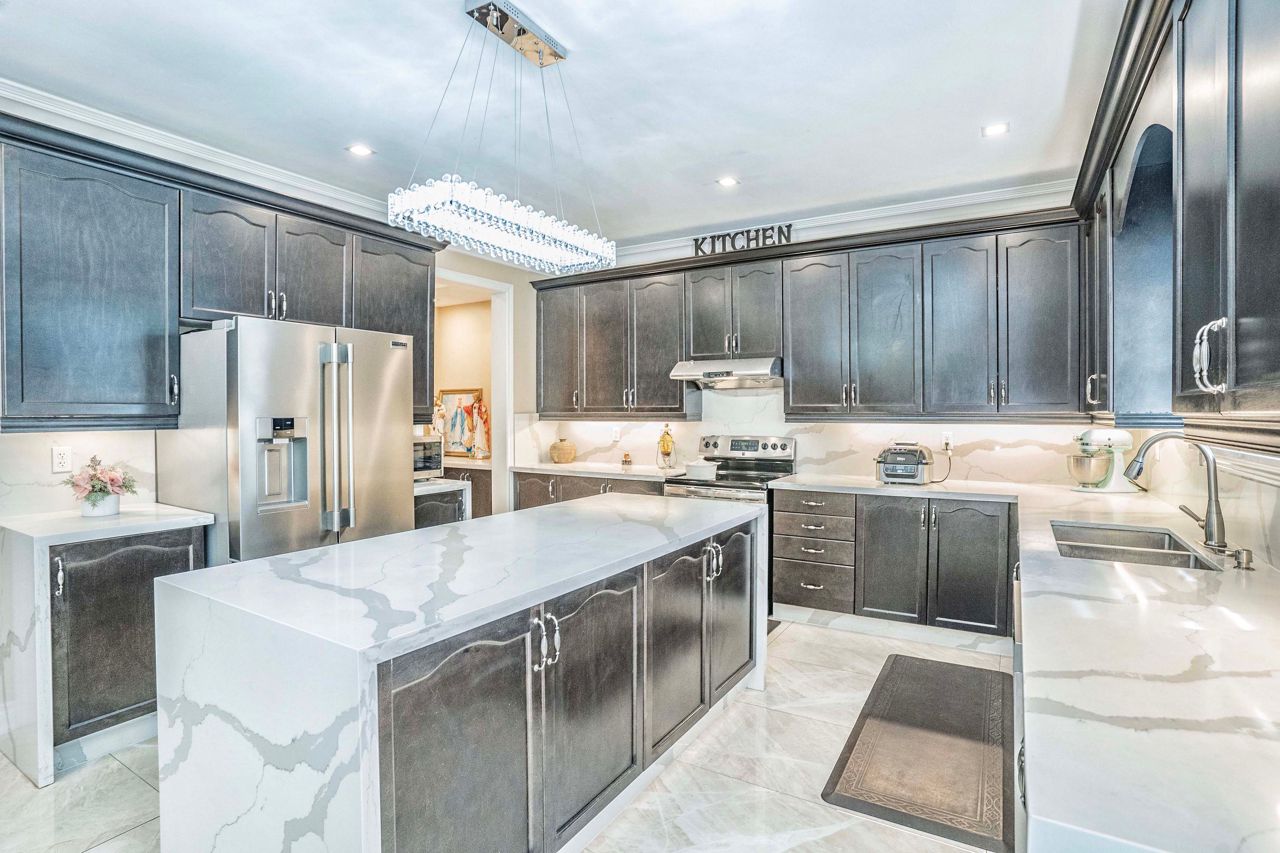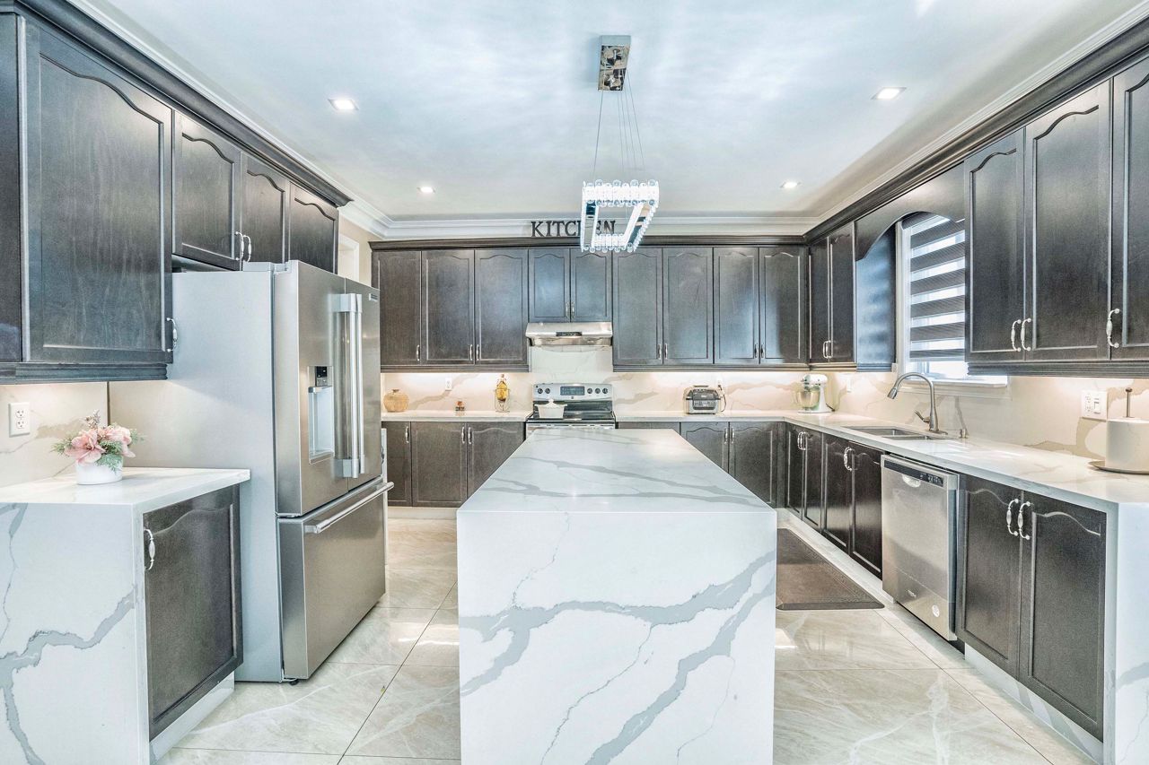 Welcome To This Spectacular Home In High-Demand Wismer Neighborhood, Approx 3200 Sf, LUXURIOS UPGRADES $$$$ Main & Upper (See the List Attachments), Brick/Stone Front, IRON Welded Double Front Door. IRON Welded Railings on Staircase, 9Ft Ceiling, Spanish Hardwood Floor on Upper, 48x24 Porcelain Tiles on main, CONCRETE Fireplace Mantel, CONCRETE Crown Moulding Throughout, Coffered Ceiling in Master,9 Lamp Lights on wall, Crystal Chandelier, Modern Light Fixtures & LED Pot Lights. Kitchen With Zebra Quartz Counter& Backsplash, Island With Breakfast Bar, Stainless Steel Appliances, Shutters & Blinds, 4 Spacious Bedrooms & 3 Bathroom (2 Ensuites & 2 Semi Ensuites) On 2nd Floor, No Side Walk, Steps To Plaza, Top Ranking schools , Park.S/S Fridge, S/S Stove, S/S Range Hood, S/S Dishwasher Washer, Dryer, Existing Light Fixtures, Existing Window Coverings.
