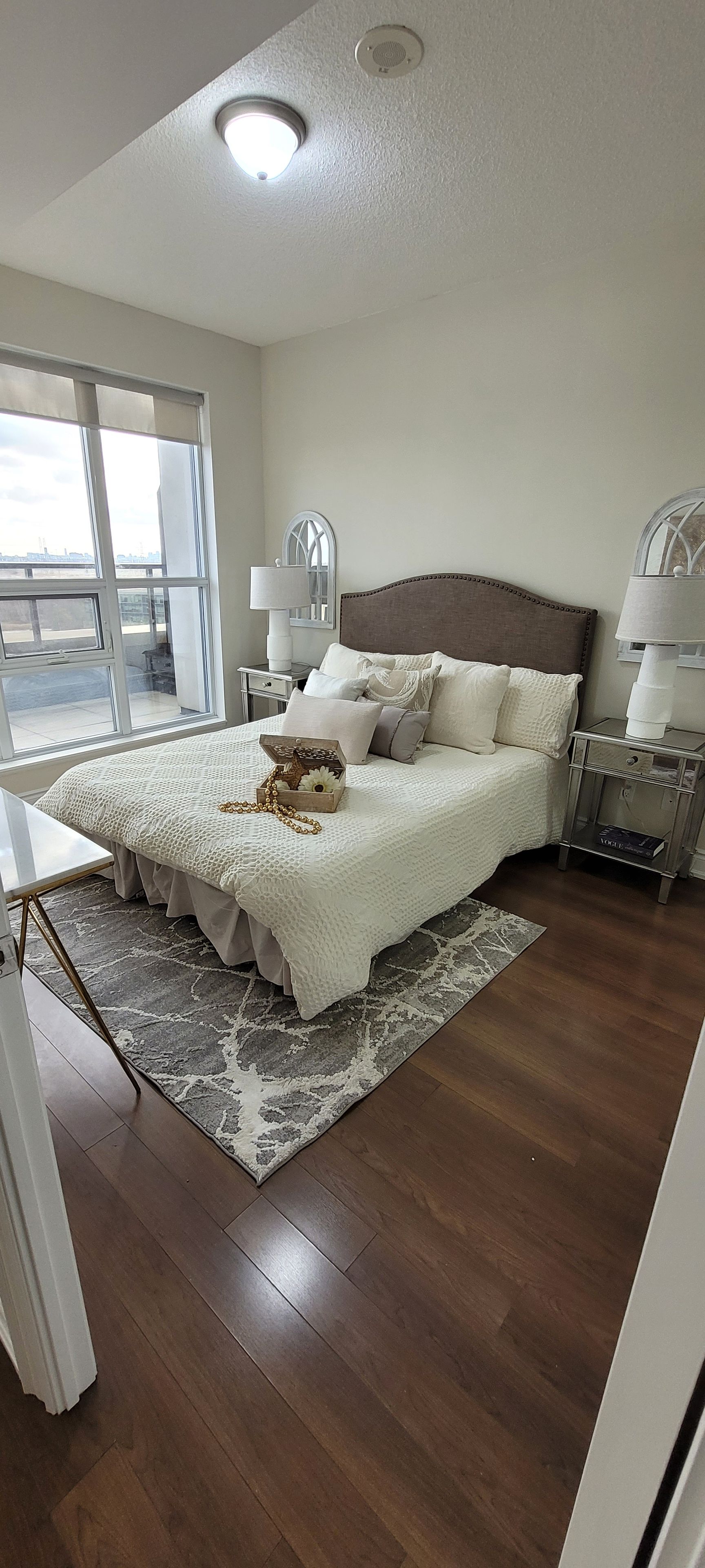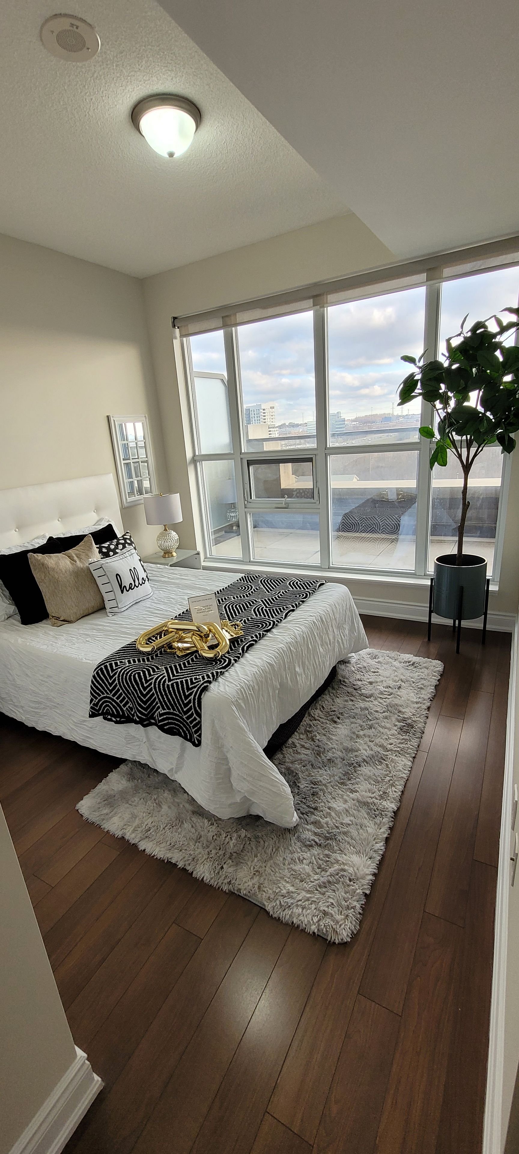 核心地段(Warden大道与7号高速公路交汇处)!毗邻万锦市中心的高档公寓,明亮宽敞的单元,2+1房型,两间卧室均享有无遮挡的南向景观窗。书房可改作卧室,配备两间全功能浴室。全屋铺设复合木地板,9英尺高天花板,开放式厨房配花岗岩台面。24小时礼宾服务,游泳池、按摩浴缸、篮球场、羽毛球场、健身房一应俱全。紧邻Viva公交车站、餐厅、超市。绝佳南向景观之一。全新粉刷,干净整洁的单元。