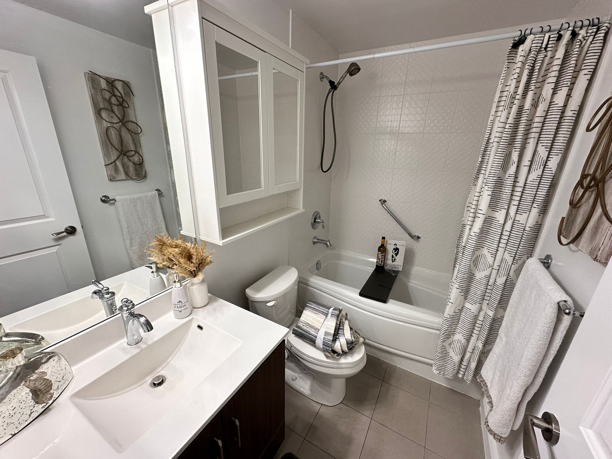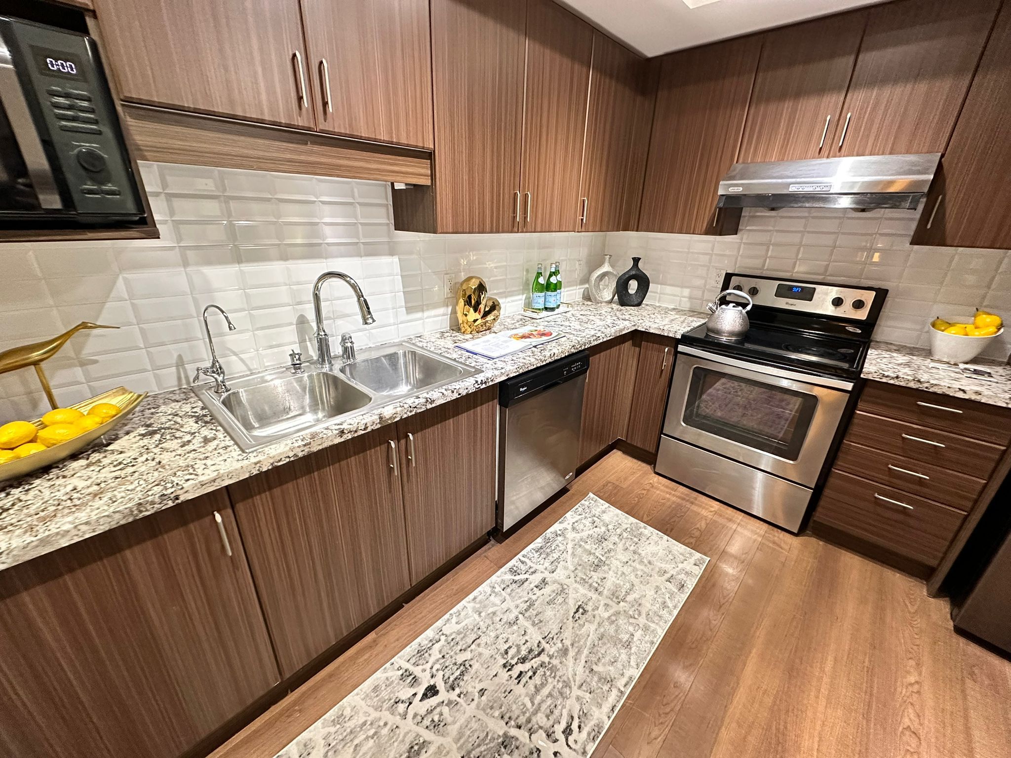 **额外设施**:现有不锈钢电器包括冰箱、炉灶、嵌入式洗碗机、樱花牌抽油烟机。洗衣机与烘干机。电子照明装置,升级版窗帘。一个储物柜。一个停车位。