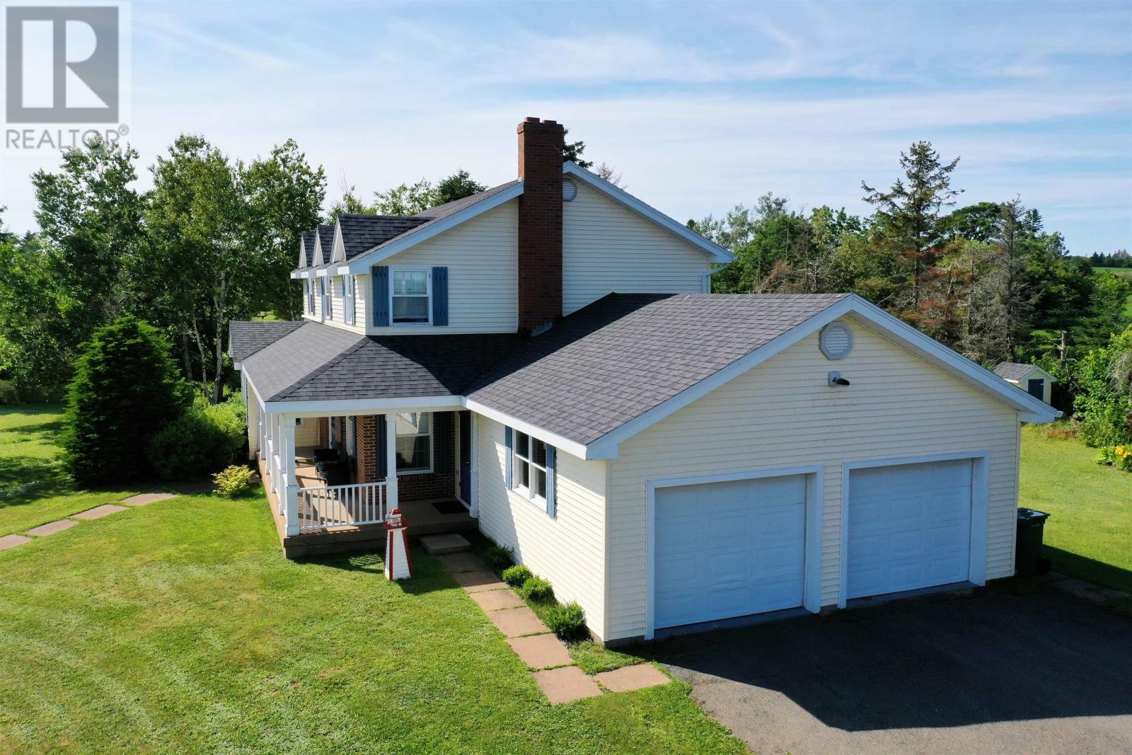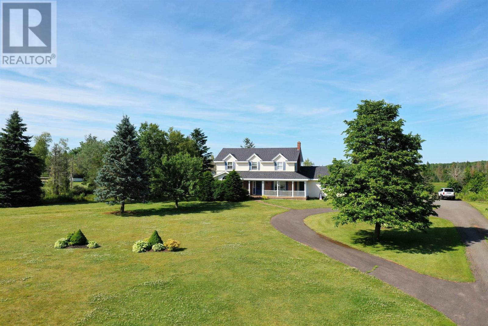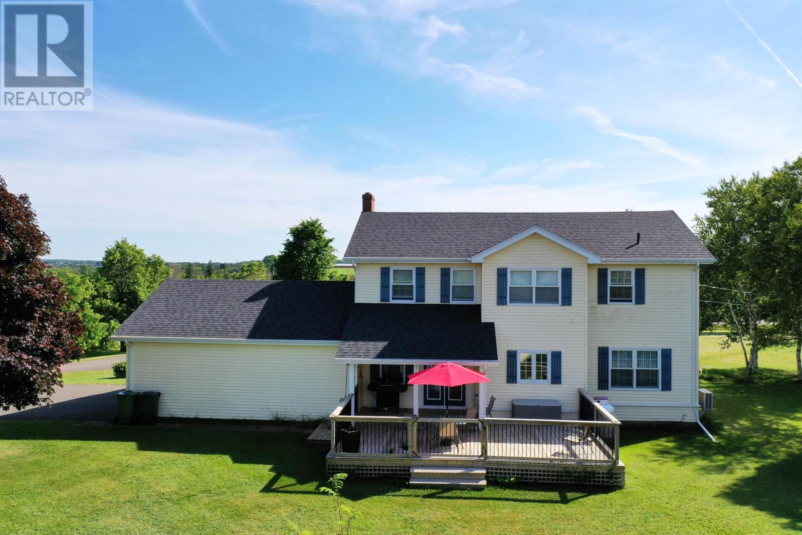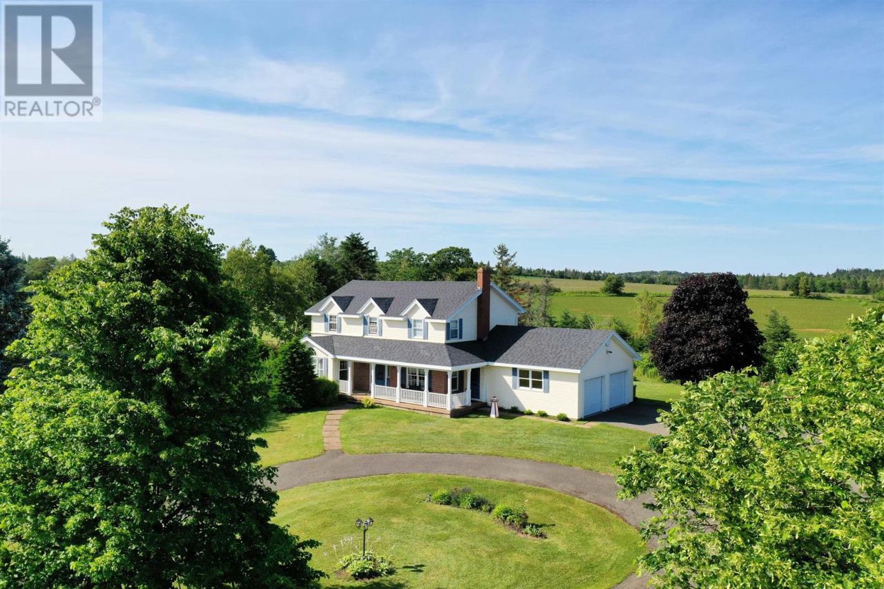 This 2 storey home is situated on a mature 1.95A lot in a scenic country setting. Well landscaped there is a paved drive as well as a loop for easy parking and exiting onto Rte 2. This location would suit any discerning buyer with an easy commute to both Charlottetown and Summerside. The 2 car garage is accessed via the home through a mud/laundry room. The main level features garden doors to a partially covered deck via the kitchen area. The eat in kitchen is well appointed with a breakfast bar. The home features a covered veranda overlooking the countryside. The main level has a lovely flow and features a formal dining room, living room, a cozy family room with fireplace, and a grand staircase accessing the second level. The second level features all three bedrooms have ensuites, they are all spacious and well appointed. The home is immaculate, the lower level is unfinished but could easily increase the living space if desired. (id:61201)