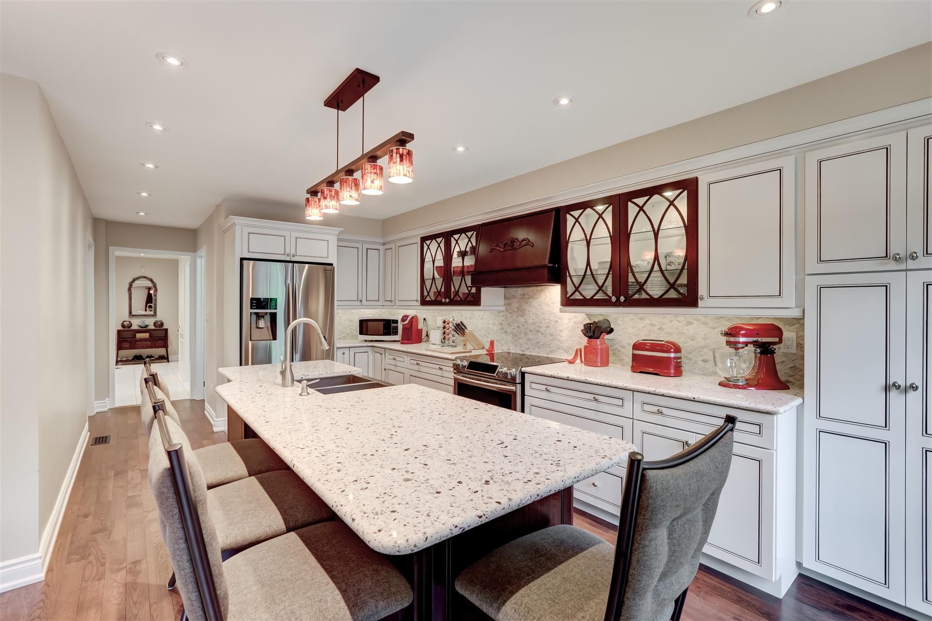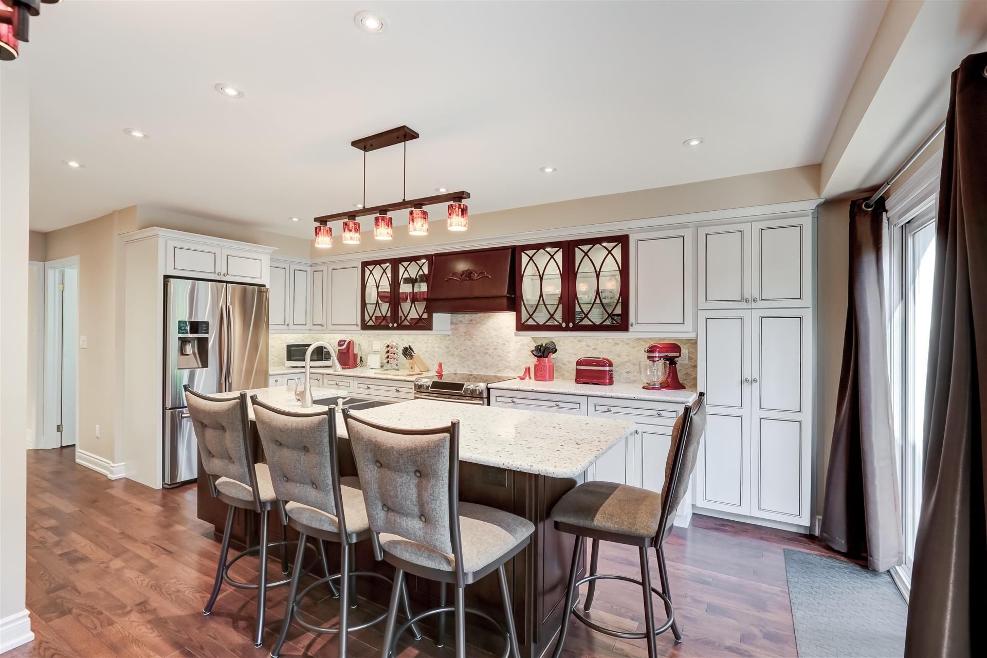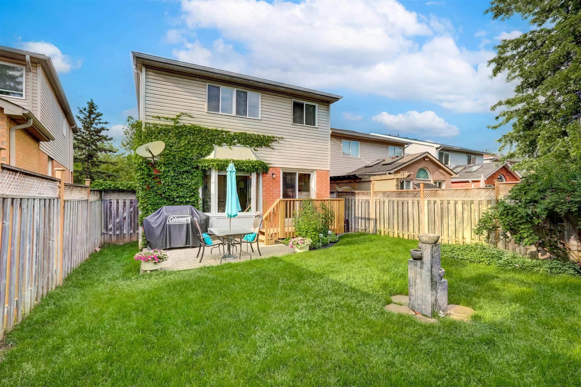 This Lovingly Cared for Home is Nestled in a Quiet, Family-Friendly Neighbourhood In Desirable Erin Mills. Home to Highly Rated John Fraser S.S. & Top-Ranked Elementary & Middle Schools. This Tastefully Updated Home has Quick Access to Parks, Schools, Transit, Shopping & Credit Valley Hospital, with Easy Access to Major Highways. The Formal Living Room & Dining Room Features Canadian Made Walnut Hardwood Floors, French Doors & Pot Lights. The Welcoming Family Room with Napoleon Electric FP, Built-in Bar/Entertainment Area, Wine Fridge & Bay Window, Flows Nicely into the Kraftmade Solid Wood Kitchen with Quartz Countertops & SS Apron Sink. Featuring A Handy Walk-in Pantry, a Chef Ready Island & Included Hightop Chairs, with W/O to Deck & Fully Fenced Landscaped Yard. Boasting a Large Primary Retreat with W/I Closet & 4-Pc Updated Ensuite (2024). The Remodelled (2024) Second Floor Laundry Room has been Designed for Convenience, & the Updated Bathrooms (2024) Feature Solid Wood Vanities & Carrera Marble Countertops. The Bright & Airy Great Room Boasts A Vaulted Ceiling, Ceiling Fan, Gas Fireplace, & Walnut Hardwood Floors. Matching Hardwood Build-ins and Bar Area with mini Fridge Refine this Space. An Immaculate 2350 sq ft Family Home Meticulously Maintained by Original Owner, Major Renovations Done in 2016 & 2024, there are no Popcorn Ceilings Here! This Home is Completely Move in Ready, with Early Move-in Date(s) Available!BBQ, Kitchen Island High Top Chairs, Wall Mounted Kitchen TV, Deck Box, Acorn Chair lift (removal or battery replacement), Wall Mount Napoleon Electric FP.