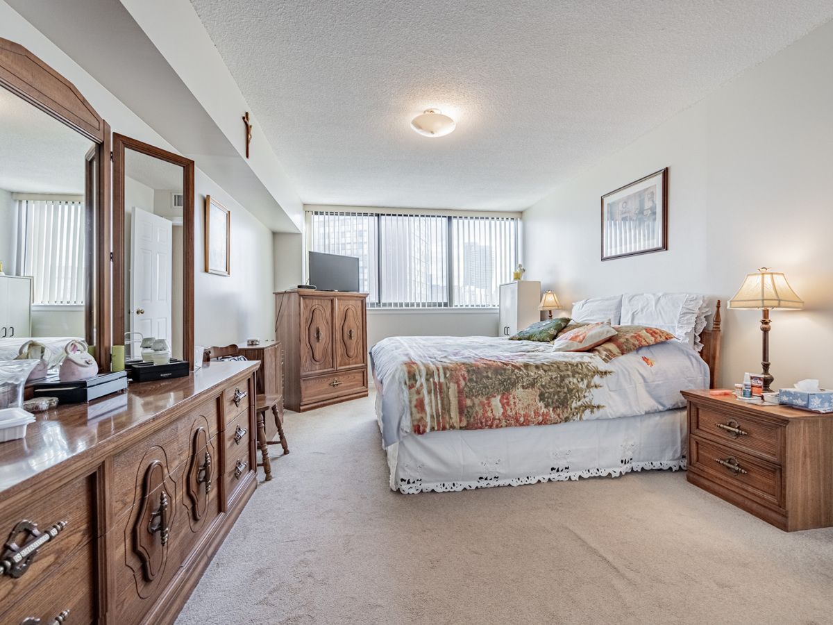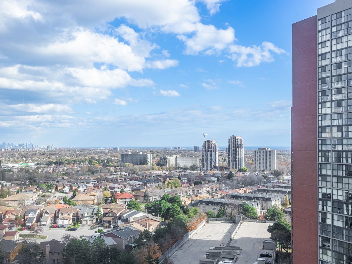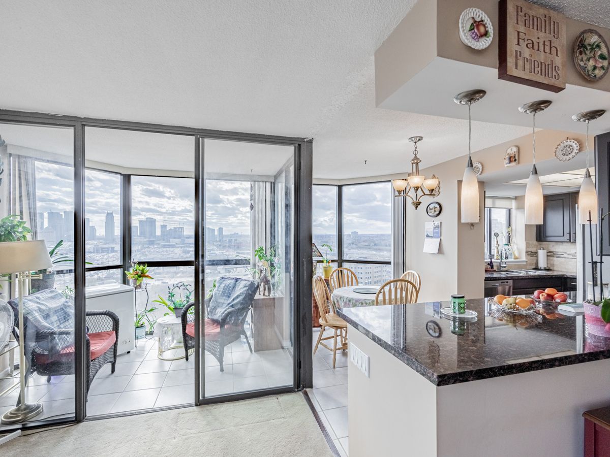 Beautifully maintained Corner Unit with breathtaking SW, West and NW views. Over 1300 sq.ft with updated kitchen, granite counters, floor to ceiling windows in solarium! Large primary bedroom features a fully renovated 4 piece ensuite bathroom, walk in closet, bright unobstructed views! The second bedroom features a wall to wall closet and a 2nd storage closet! The living/dining area is open concept and has amazing, bright west views of the city! The amenities have been meticulously maintained including a $500k renovation to the party room! Billiards, indoor swimming, sauna, guest suite etc. Walk to Square One Shopping Centre, Go Bus Station, & future LRT! Amazing location for both commuters and students! The Sherwoodtowne Condominium is a single tower building with beautifully kept fenced grounds, ample visitor parking & fabulous amenities! Maintenance fees are approximately 65 cents/sq.ft and include, parking, water, cable tv, & internet! Better than most condos in the city!Newer S/S appliances, newer washer/dryer, window blinds, same owner 12 years!