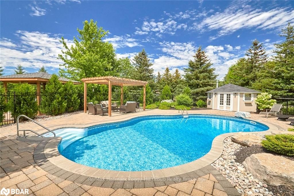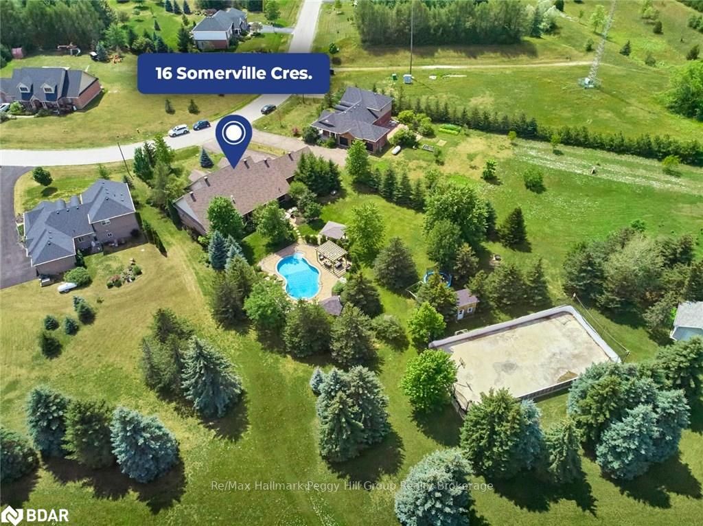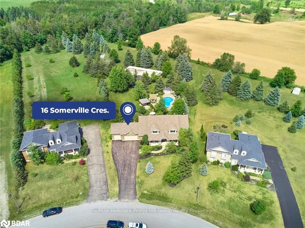 IMMACULATE FAMILY HOME WITH THE BACKYARD OASIS OF YOUR DREAMS! Everything you've ever wanted awaits at 16 Somerville Cres, an incredible bungalow in a tranquil location. Skiing and a nature centre are only minutes away! Enjoy the second largest lot in the subdivision that measures a sprawling 1.65-acres and backs farm fields! Spend summers swimming in the in-ground saltwater pool & playing basketball on the 40x80ft concrete recreation pad with boards & a changing room! In the winter, transform the concrete pad into an ice rink & warm up after the game in the hot tub! Fantastic curb-appeal greets you at the front of this home with an attached triple-car garage & covered front porch. The beauty continues inside with the eat-in kitchen that features white cabinetry complimented by a dark-tone island. Pot lights illuminate the beautiful S/S appliances. A convenient W/O leads to the back patio where you can dine in style while taking in your magnificent new property. Sightlines lead from th