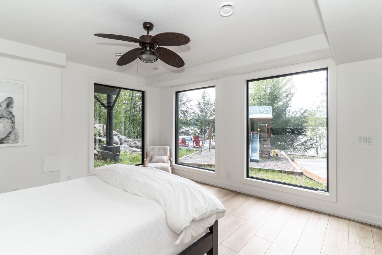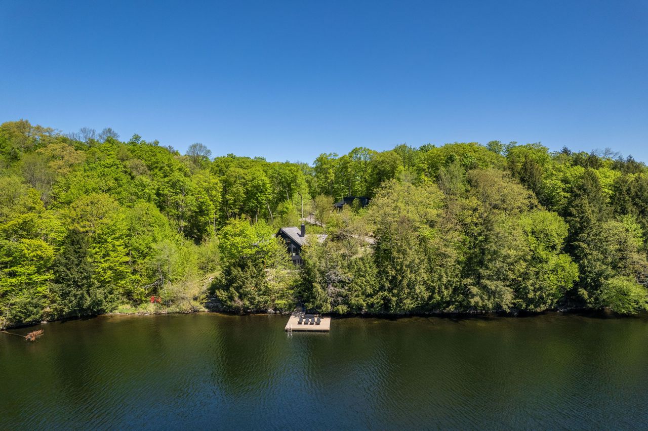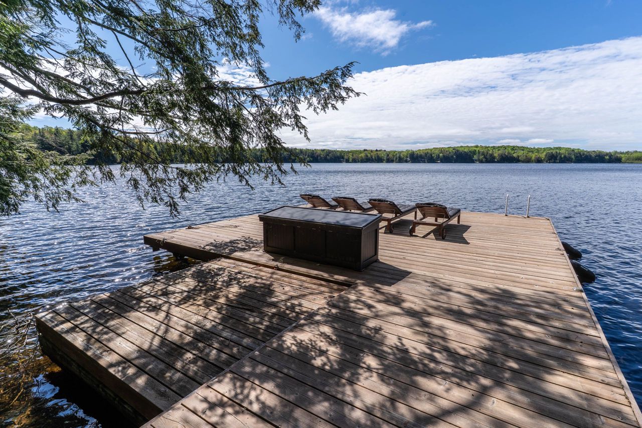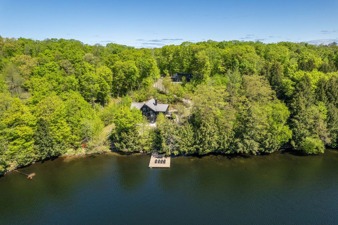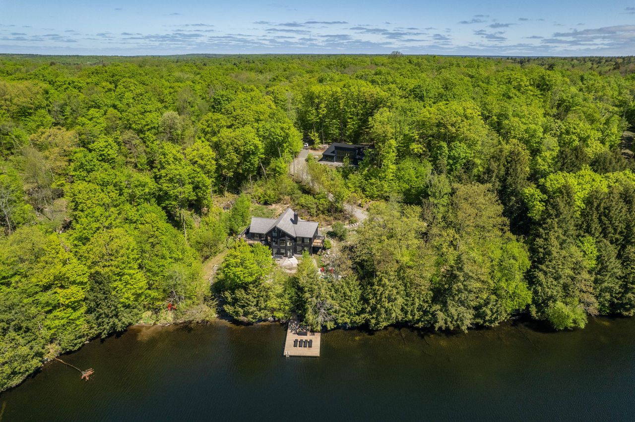 Exceptional year-round lakeside retreat offering 468 feet of frontage on beautiful Bruce Lake with southern exposure for all-day sunlight. The main floor showcases a bright, functional, open-concept layout with soaring ceilings, a gorgeous wood-burning fireplace, and lake views. The kitchen is well-equipped, and the spacious dining area allows you to host large gatherings with ease. The primary suite is conveniently located on the main floor and features an ensuite bathroom, walk-in closet, and scenic lake vistas; an additional bedroom completes this level. The lower level has been thoughtfully designed with a family room, wet bar, and two further bedroom suites, each equipped with full en-suite, walk-in closets, and lake views providing privacy for guests or family. The waterfront is the perfect setting for lakeside enjoyment, featuring a swim spa, children's playground, multiple gathering spaces, generous deck areas, and a large dock so your outdoor space caters to all ages. The cottage benefits from a durable Enviroshake roof, a generator wired to power the entire home, Inexpensive Geothermal Heat, a newly constructed 2-car garage with a studio space, a loft, ample natural light from floor-to-ceiling windows, plus separate septic systems. A paved driveway adds to the convenience, plus there is more than 7 acres of land to explore and enjoy. Additionally, the property is sold turn-key with most furnishings, allowing for immediate enjoyment.