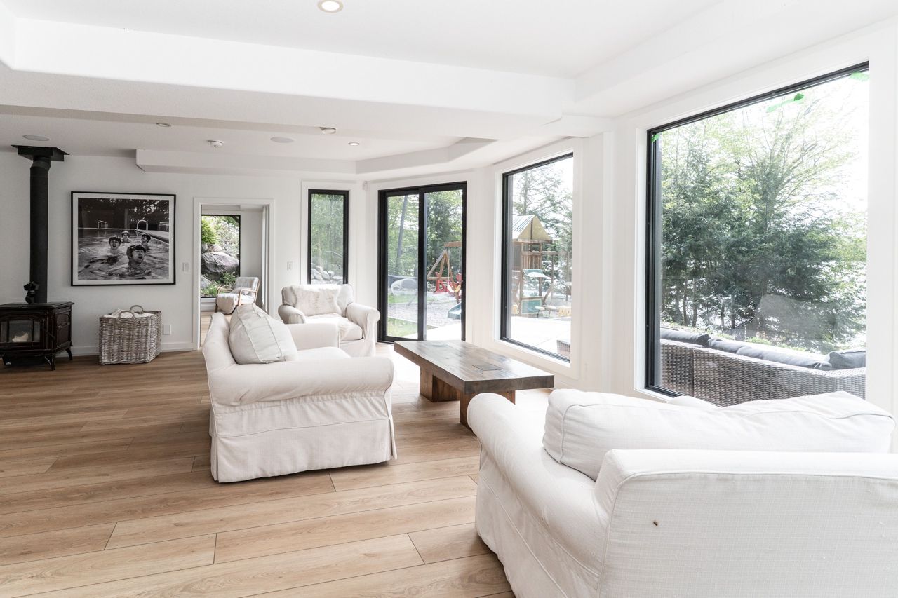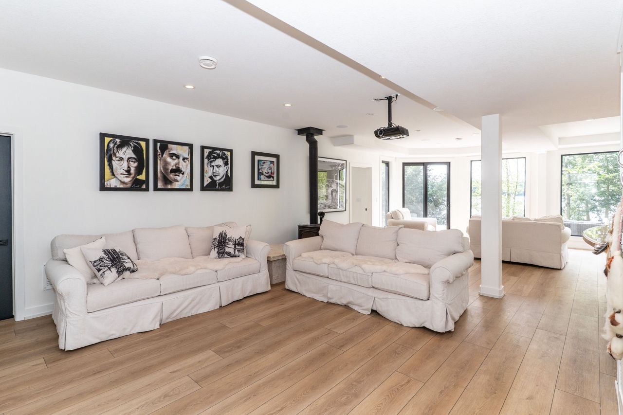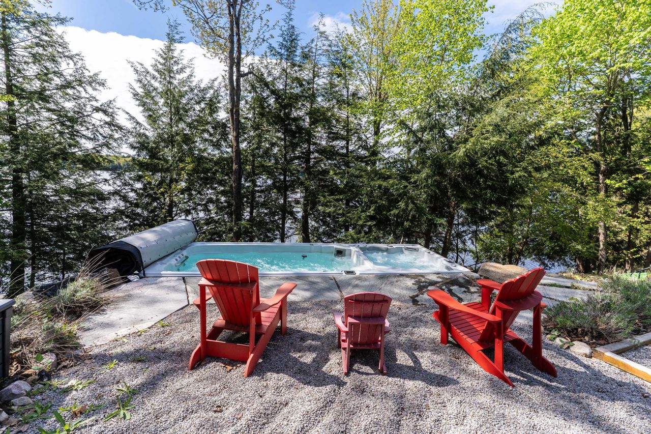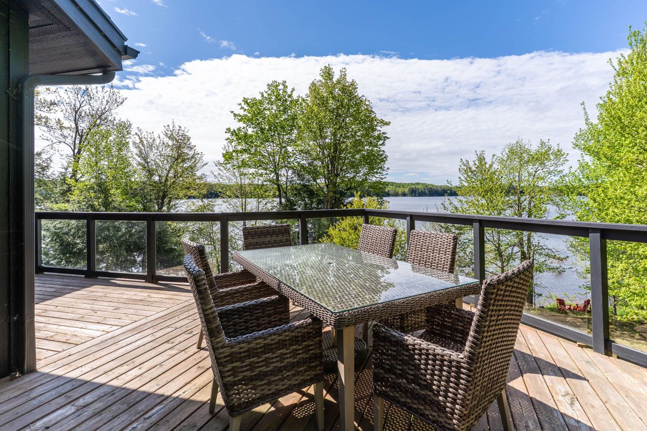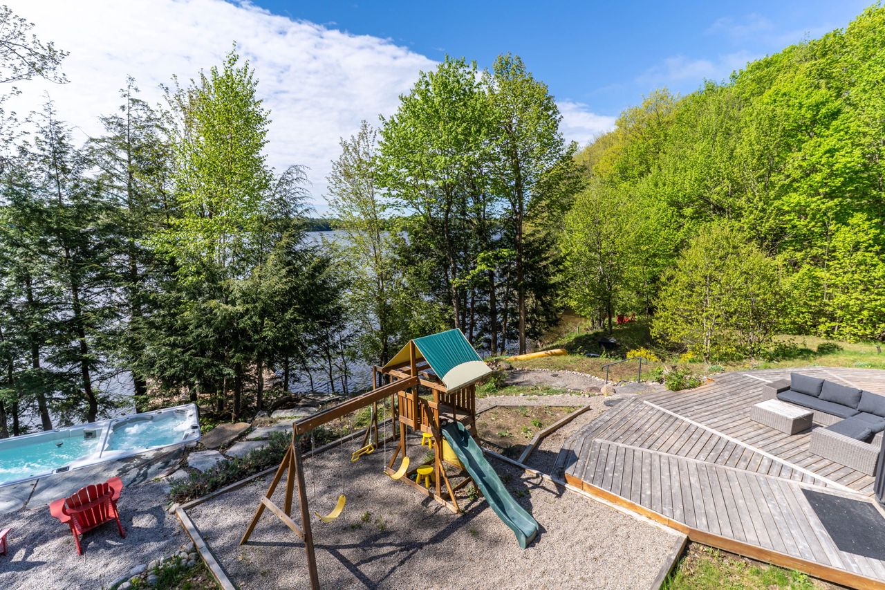 Exceptional year-round lakeside retreat offering 468 feet of frontage on beautiful Bruce Lake with southern exposure for all-day sunlight. The main floor showcases a bright, functional, open-concept layout with soaring ceilings, a gorgeous wood-burning fireplace, and lake views. The kitchen is well-equipped, and the spacious dining area allows you to host large gatherings with ease. The primary suite is conveniently located on the main floor and features an ensuite bathroom, walk-in closet, and scenic lake vistas; an additional bedroom completes this level. The lower level has been thoughtfully designed with a family room, wet bar, and two further bedroom suites, each equipped with full en-suite, walk-in closets, and lake views providing privacy for guests or family. The waterfront is the perfect setting for lakeside enjoyment, featuring a swim spa, children's playground, multiple gathering spaces, generous deck areas, and a large dock so your outdoor space caters to all ages. The cottage benefits from a durable Enviroshake roof, a generator wired to power the entire home, Inexpensive Geothermal Heat, a newly constructed 2-car garage with a studio space, a loft, ample natural light from floor-to-ceiling windows, plus separate septic systems. A paved driveway adds to the convenience, plus there is more than 7 acres of land to explore and enjoy. Additionally, the property is sold turn-key with most furnishings, allowing for immediate enjoyment.
