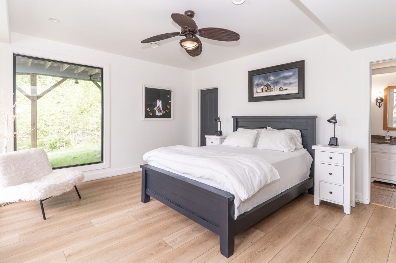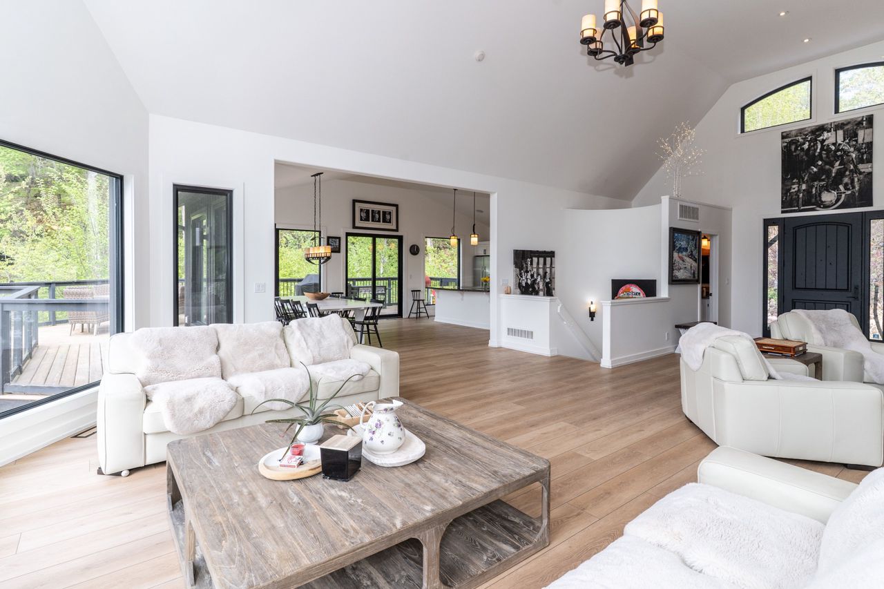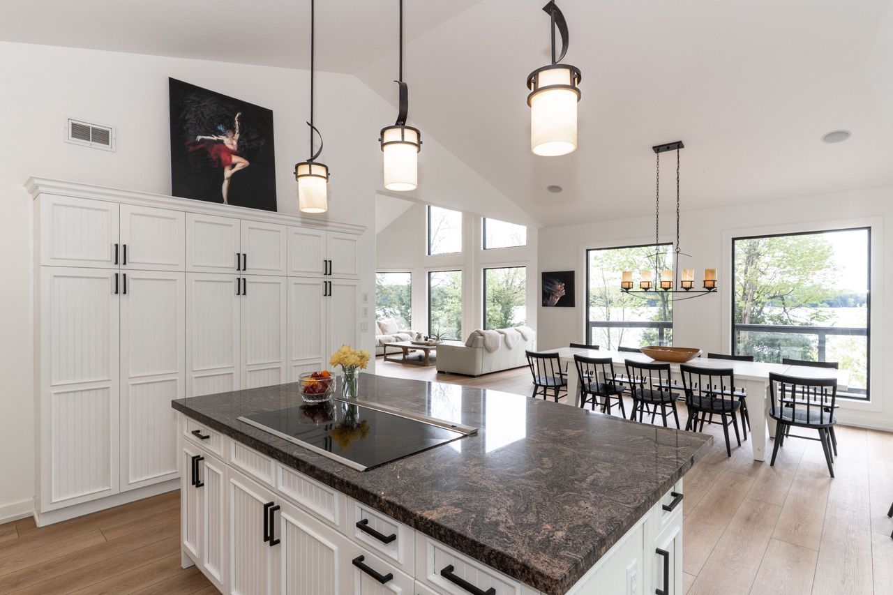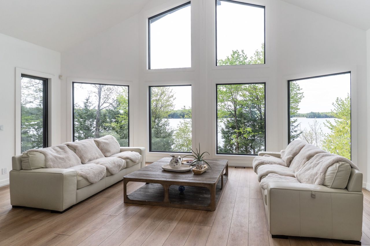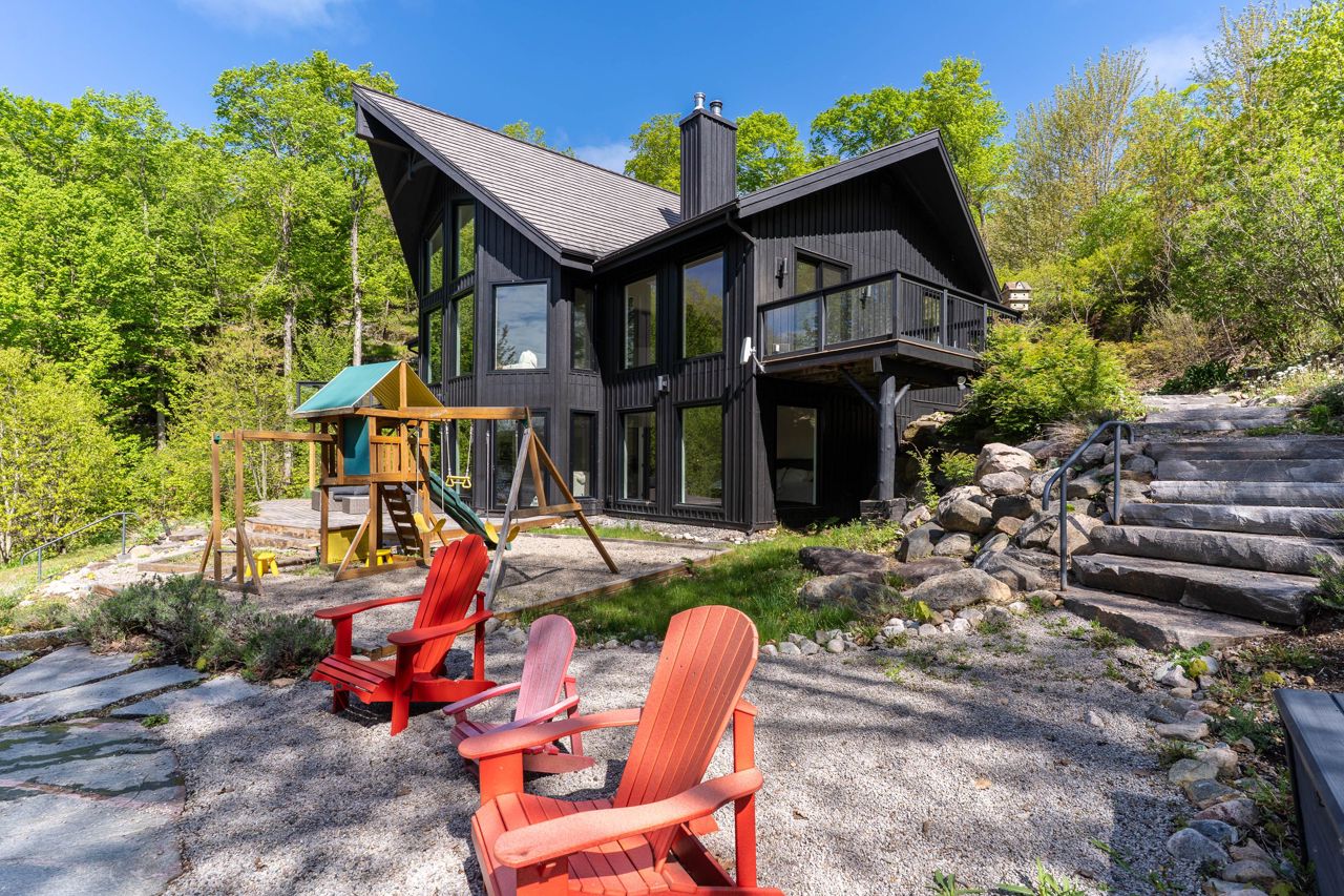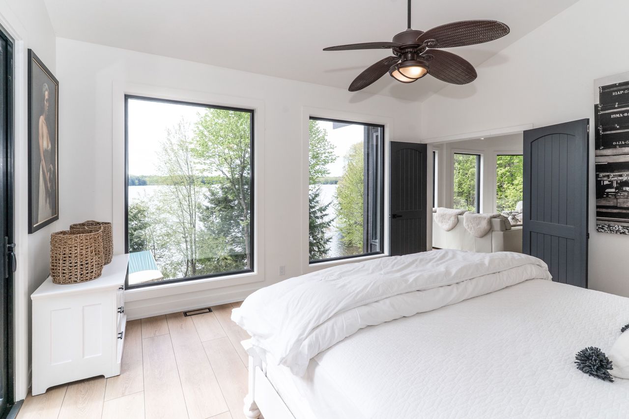Exceptional year-round lakeside retreat offering 468 feet of frontage on beautiful Bruce Lake with southern exposure for all-day sunlight. The main floor showcases a bright, functional, open-concept layout with soaring ceilings, a gorgeous wood-burning fireplace, and lake views. The kitchen is well-equipped, and the spacious dining area allows you to host large gatherings with ease. The primary suite is conveniently located on the main floor and features an ensuite bathroom, walk-in closet, and scenic lake vistas; an additional bedroom completes this level. The lower level has been thoughtfully designed with a family room, wet bar, and two further bedroom suites, each equipped with full en-suite, walk-in closets, and lake views providing privacy for guests or family. The waterfront is the perfect setting for lakeside enjoyment, featuring a swim spa, children's playground, multiple gathering spaces, generous deck areas, and a large dock so your outdoor space caters to all ages. The cottage benefits from a durable Enviroshake roof, a generator wired to power the entire home, Inexpensive Geothermal Heat, a newly constructed 2-car garage with a studio space, a loft, ample natural light from floor-to-ceiling windows, plus separate septic systems. A paved driveway adds to the convenience, plus there is more than 7 acres of land to explore and enjoy. Additionally, the property is sold turn-key with most furnishings, allowing for immediate enjoyment.